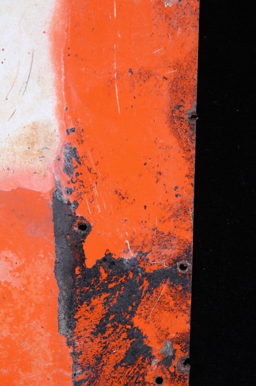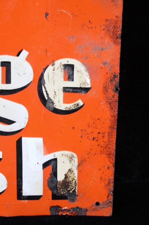 This Drink Orange Crush Embossed Chromolithographed tin sign is in good overall condition, the faded upper third with the additional nailing indentations indicated the sign was"cropped" under another sign. Most of the original orange, green, black, yellow, and white paint is intact. The bottle sides are scalloped like a real bottle. Oxidation noted, four additional nailing indents on edge are broken through. Minimal creasing noted, measures 13.75"W x 19.5"L