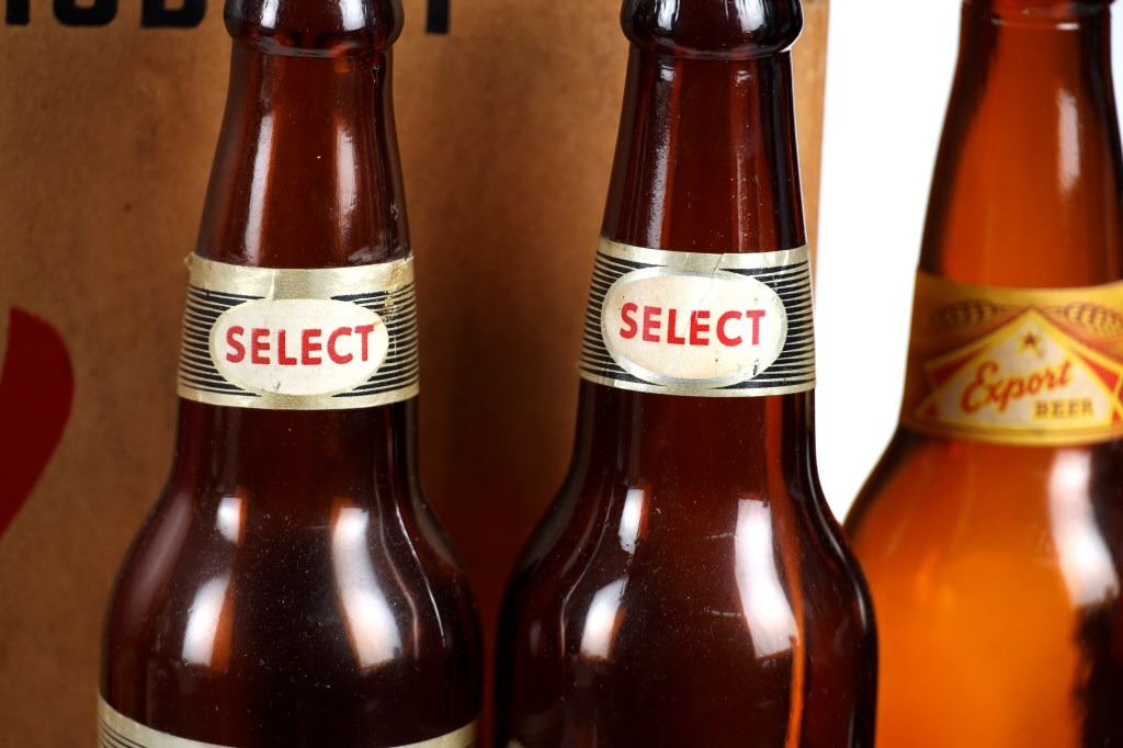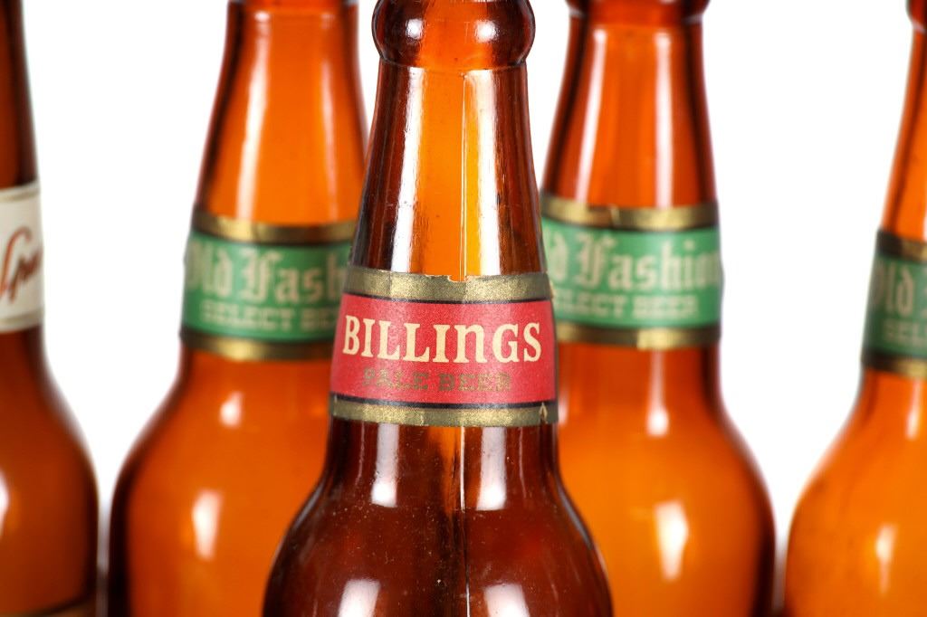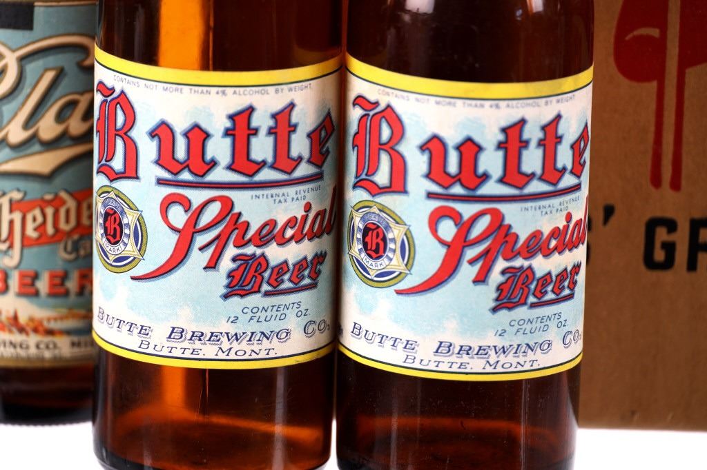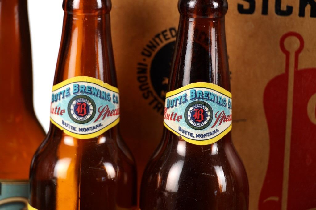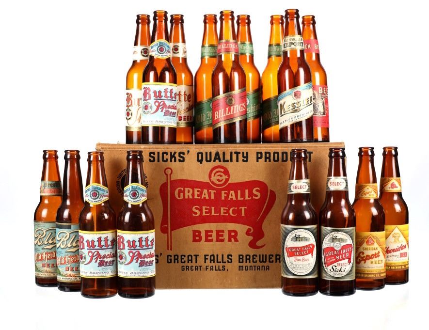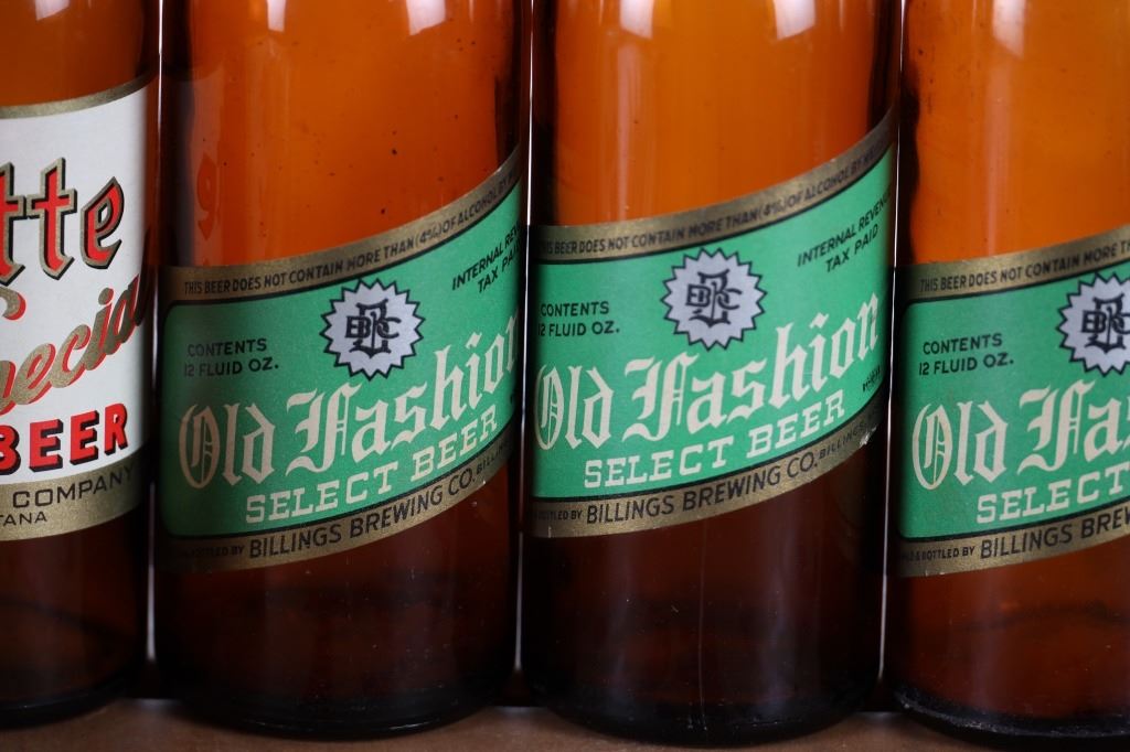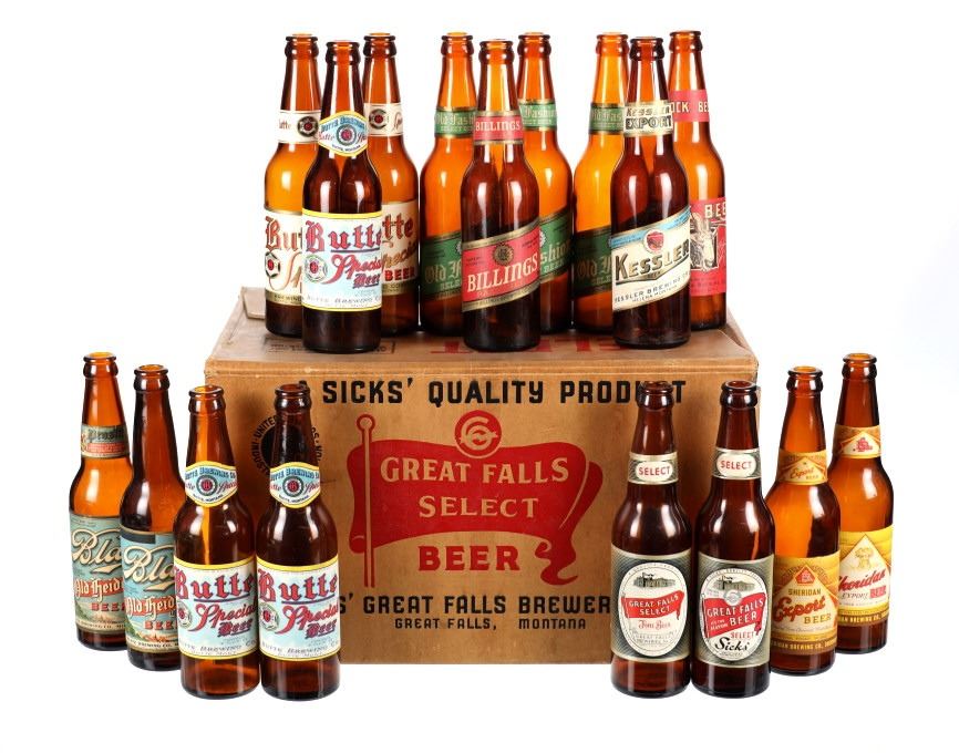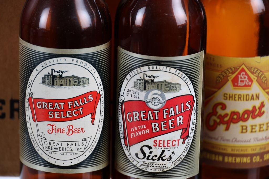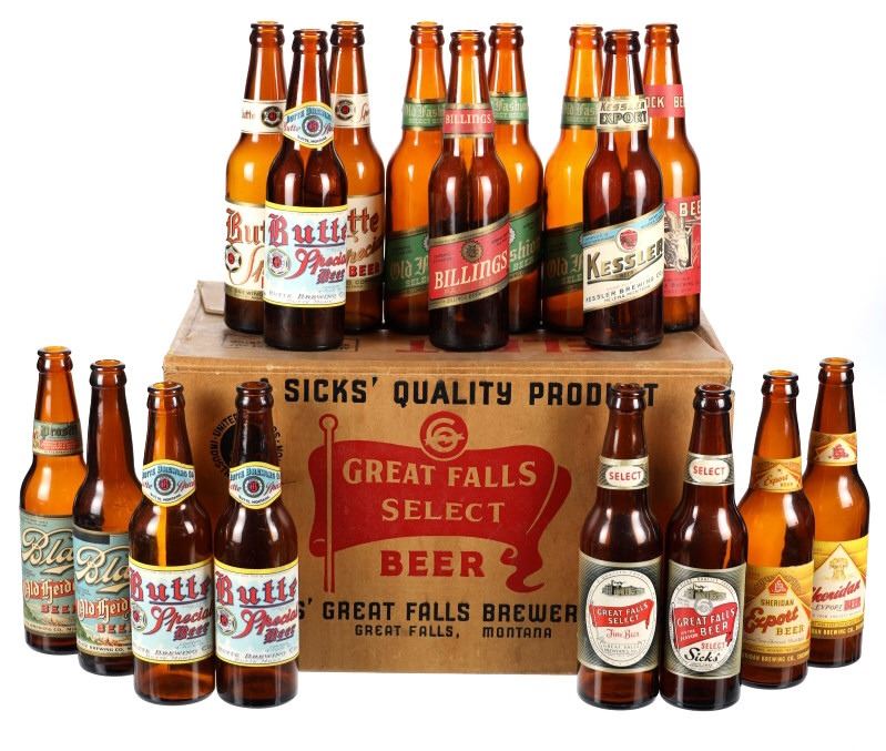 For your consideration is this collection of 17 National brand and Montana brand beer bottles from 1930-1950s that come in a Great Falls Select beer bottle box. In this collection the brands included are five Butte Special beer bottles from the Butte Brewing Co., three Old Fashion Select Beer bottles from Billings Brewing Co., one Billings Pale Ale beer bottle from Billings Brewing Co., two Blatz Old Heidelberg Beer bottles from Blatz Brewing Co. in Milwaukee, Wisconsin, one Bock Beer from Anaconda Brewing Co. in Anaconda, Montana, two Sheridan Export Beer bottles from the Sheridan Brewing Co. in Sheridan, Wyoming, two Great Falls Beer bottles from Great Falls Breweries Inc. in Great Falls, Montana, and the last being one Kessler Beer bottle from the Kessler Brewing Co. in Helena, Montana. All the bottles show the same style. All the logos are in good condition with no signs of obvious damage. The bottles measure 2 3/8" in diameter and 9 1/2" in height.