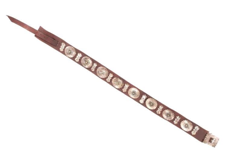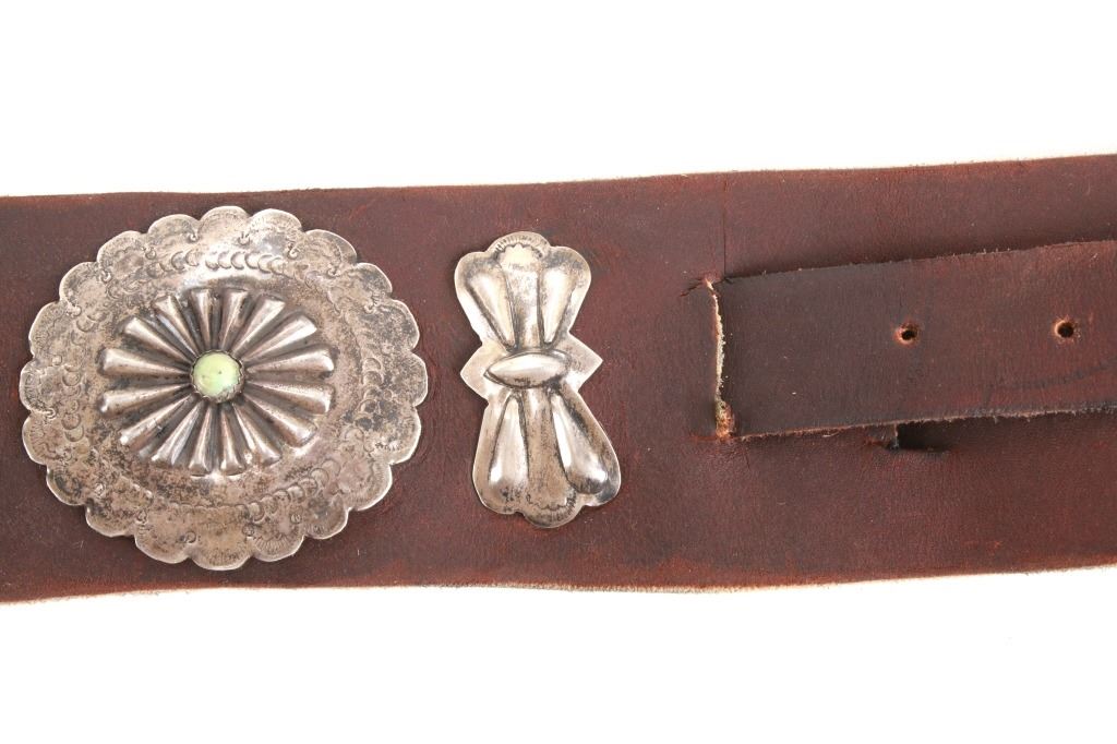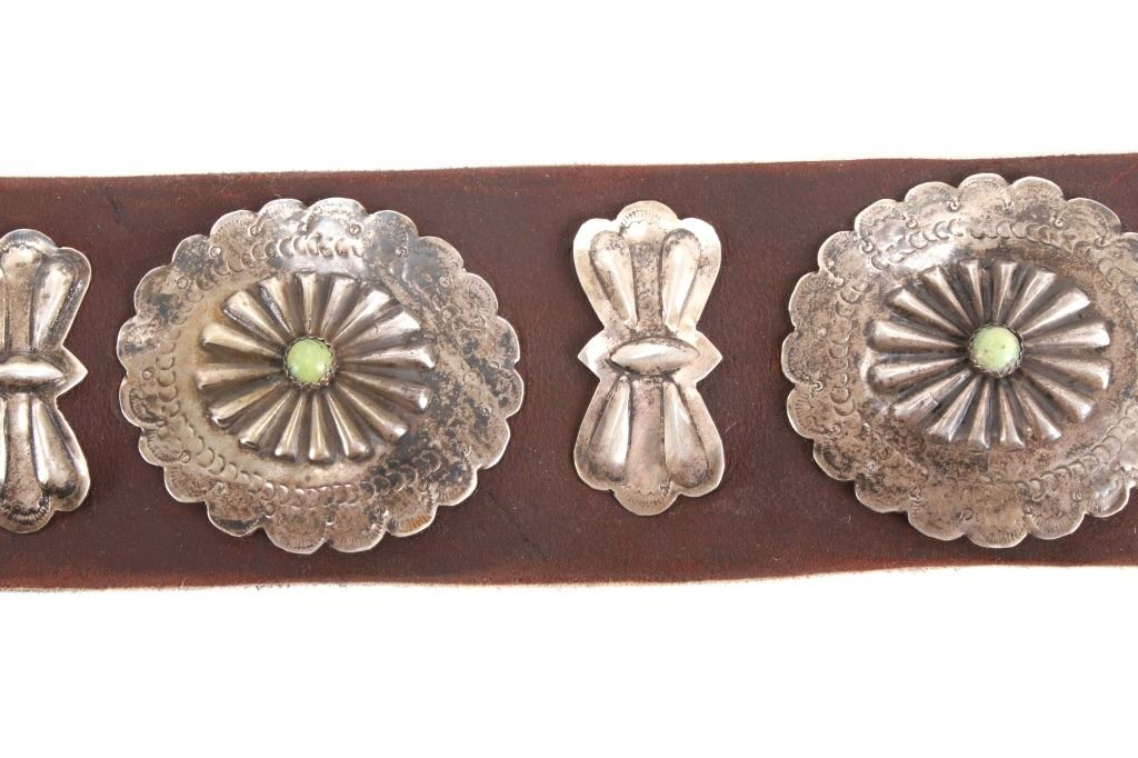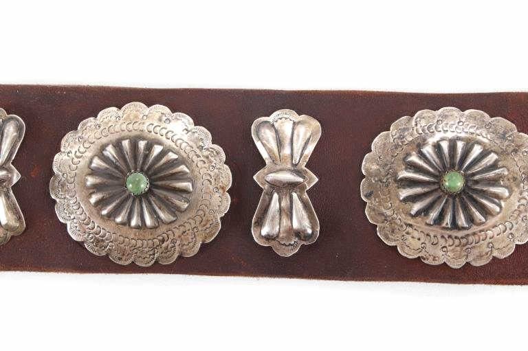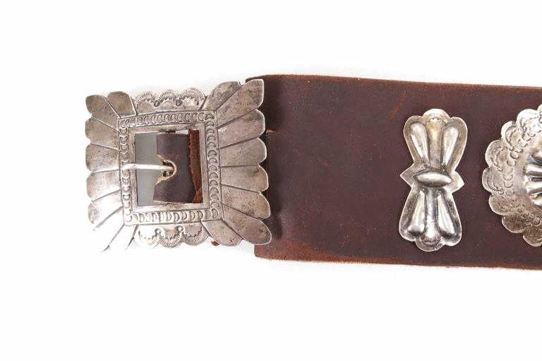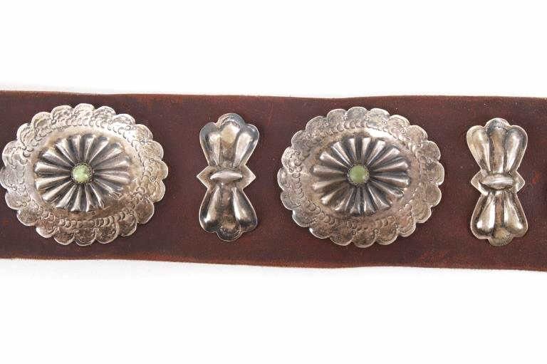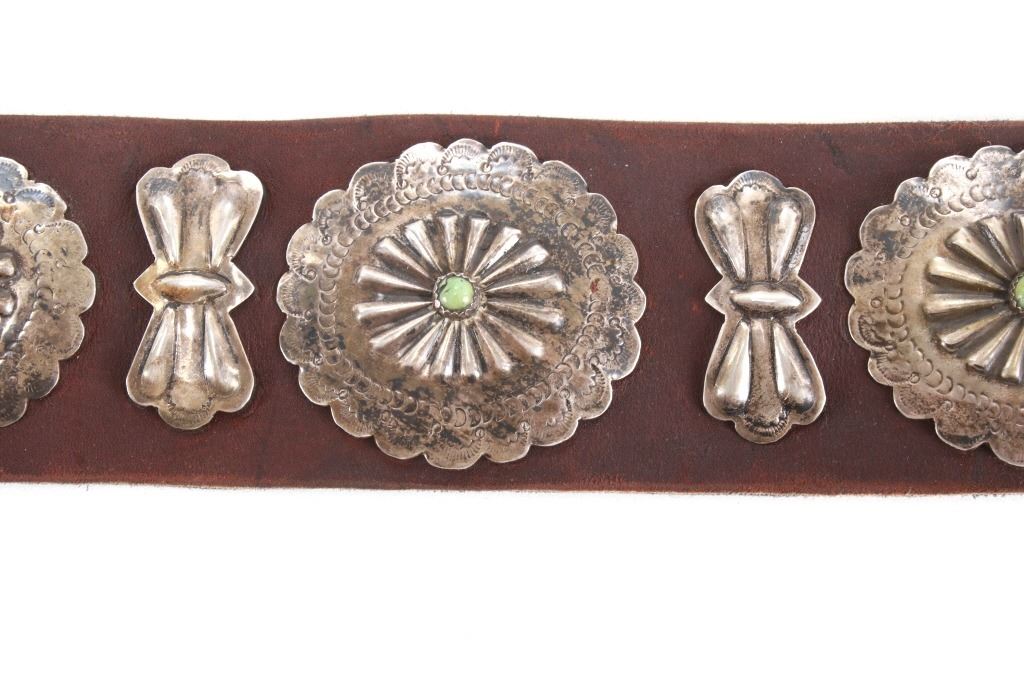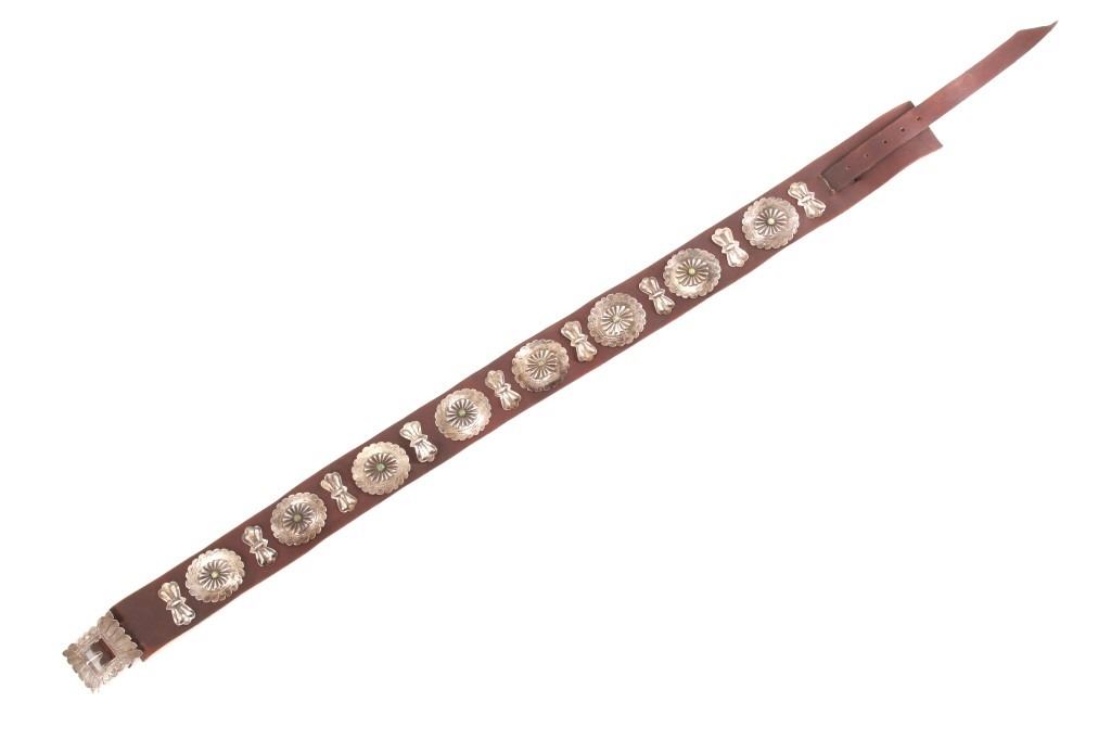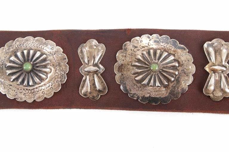 Featured in this lot is this Navajo 3rd coin silver belt circa 1930's. The belt features wonderfully and professionally crafted 3rd phase belt conchos with embossed surfaces and features eight round cut King Manassa turquoise cabochon set into the lager concho links. The smaller conchos shows a embossed bow tie design. This belt has been contemporarily mounted on a period correct harness leather and shows a beautiful coin silver buckle that has been stamped and decorated with geometric patterns. The condition of this belt is good with no obvious signs of damage and in good overall condition. The measurements of this 50" x 2 1/2".