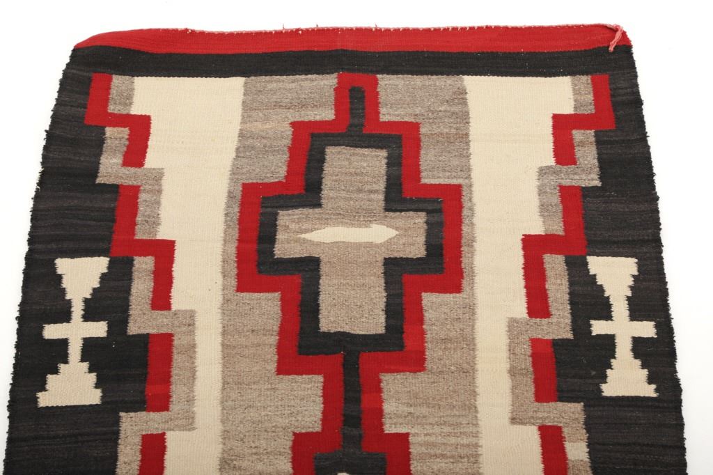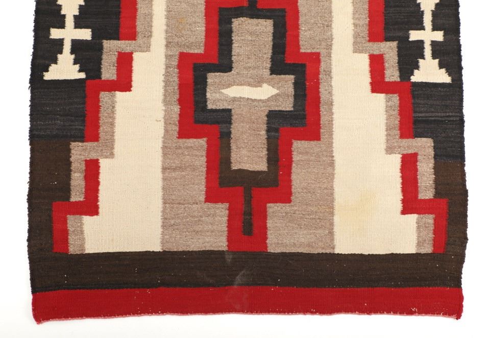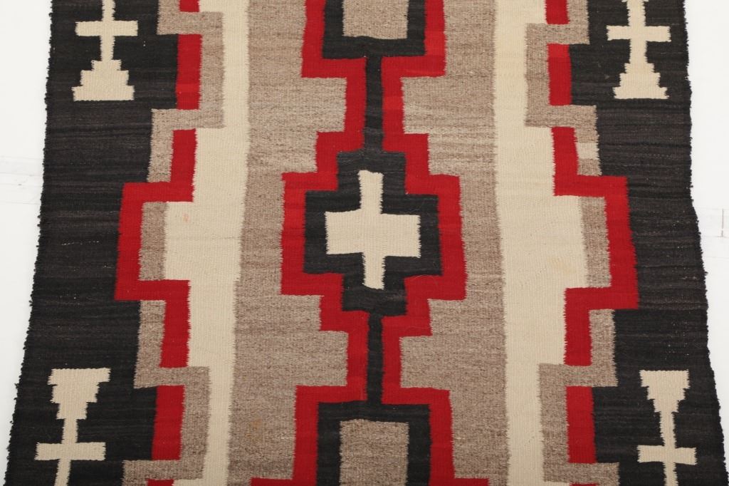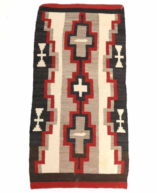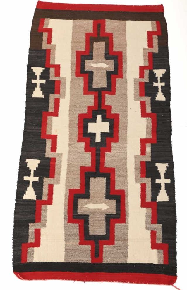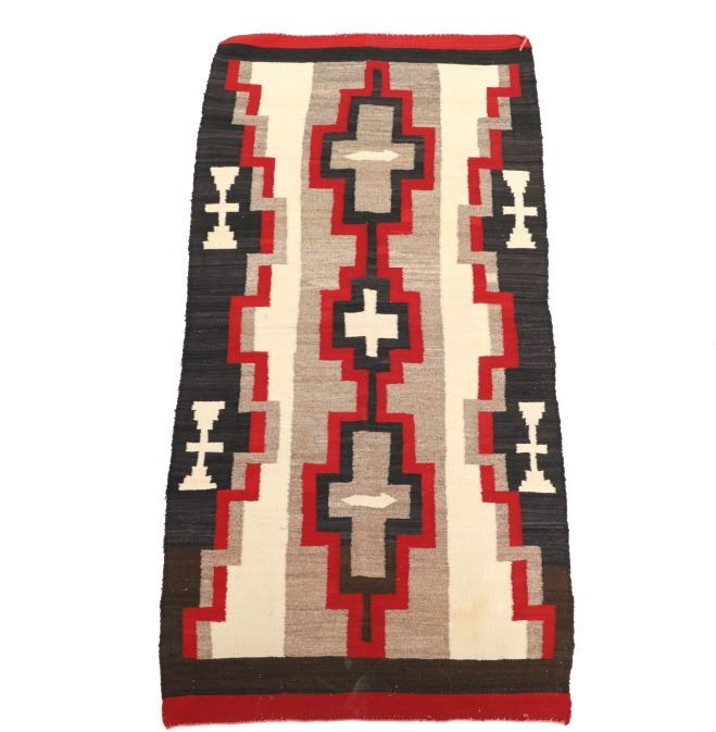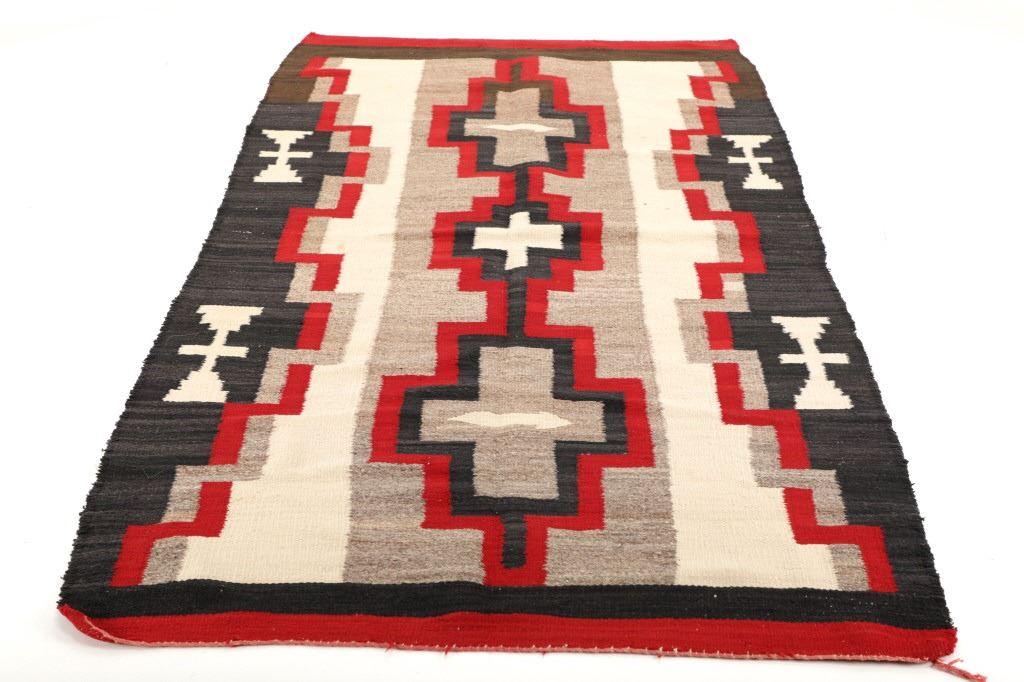 Featured in this lot is this Navajo Ganado Hubbell Trading post rug circa 1930's. The rug features a wonderfully and professionally crafted wool construction that features a traditional design from the Ganado Hubbell Trading Post that features as large central medallion with a stepped design and shows a wonderfully woven geometric pattern to the side border of the Ganado rug and shows colors such as medium red ends with a black border that shows a blended in dark brown and shows a intertwined decoration of light brown, medium red, off white, and dark brown. This is a very large rug and is uniquely presented with a tightly woven demeanor. Located southwest of Crystal in the geographical center of the Navajo Reservation the Ganado style of weaving was established by Lorenzo Hubbell in late 1800. The motif generally consists of one or more stepped diamonds or stepped and embellished triangles. The colors are usually dominated by a red background with gray, ivory, black and red designs surrounded by a geometric border. The thread count is 104 threads per square inch. The condition of this Navajo Ganado rug is good with no obvious signs of damage and shows good overall condition. The measurements of this Navajo Ganado rug is 40" x 80".