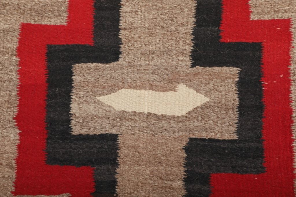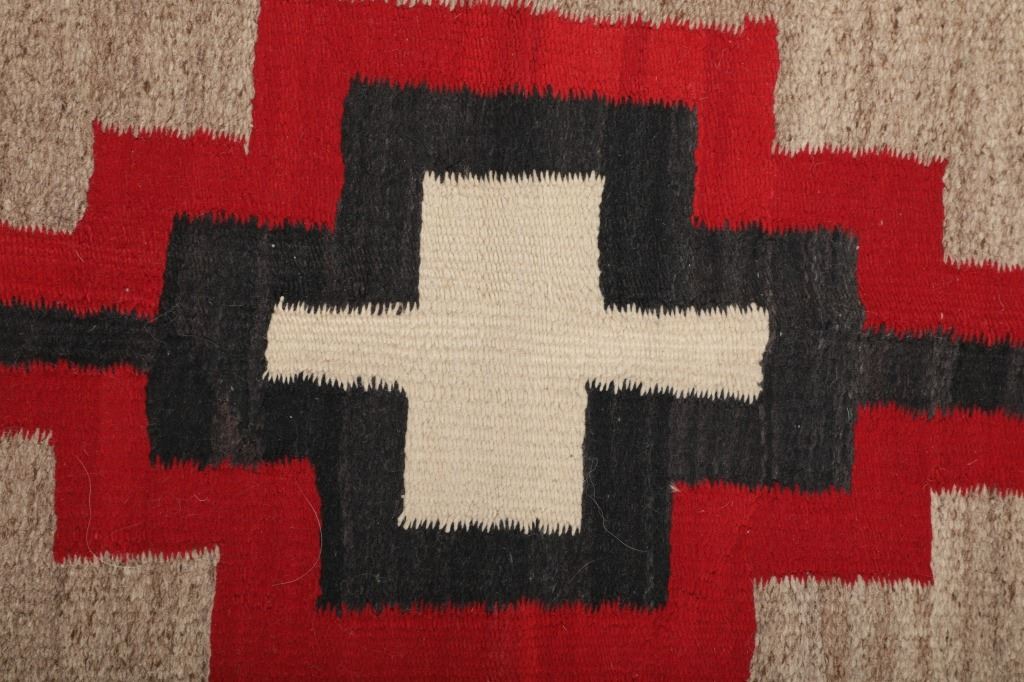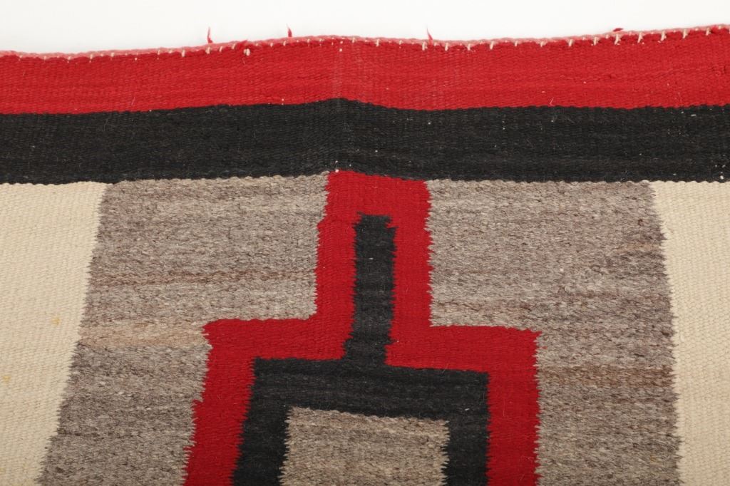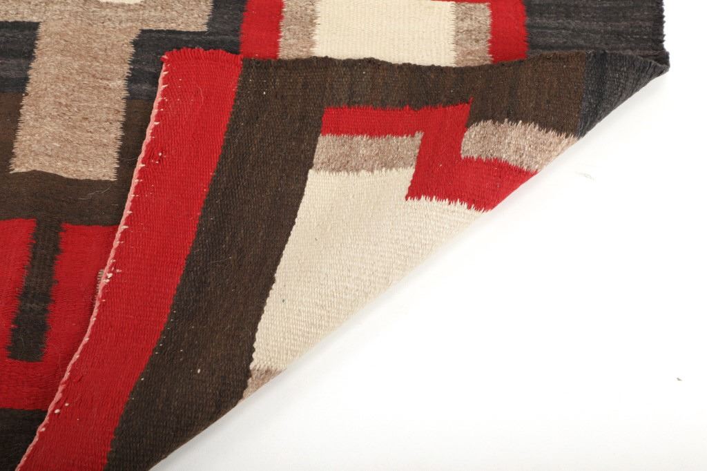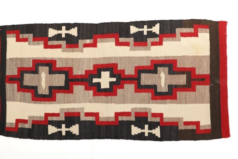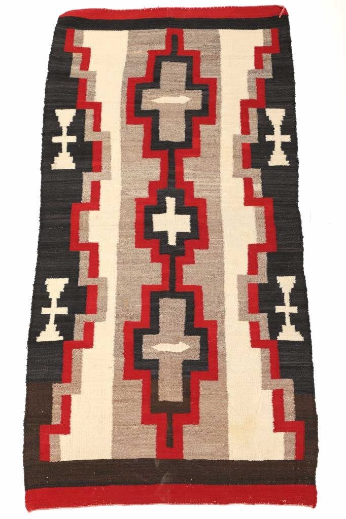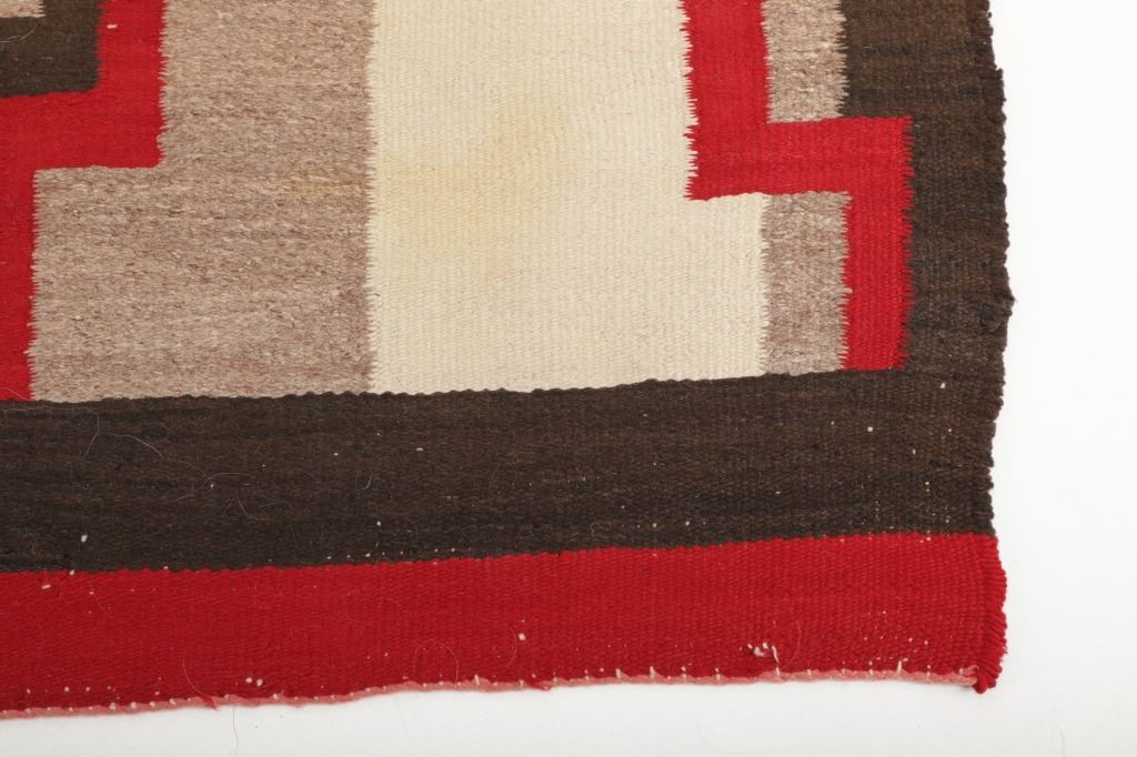 Featured in this lot is this Navajo Ganado Hubbell Trading post rug circa 1930's. The rug features a wonderfully and professionally crafted wool construction that features a traditional design from the Ganado Hubbell Trading Post that features as large central medallion with a stepped design and shows a wonderfully woven geometric pattern to the side border of the Ganado rug and shows colors such as medium red ends with a black border that shows a blended in dark brown and shows a intertwined decoration of light brown, medium red, off white, and dark brown. This is a very large rug and is uniquely presented with a tightly woven demeanor. Located southwest of Crystal in the geographical center of the Navajo Reservation the Ganado style of weaving was established by Lorenzo Hubbell in late 1800. The motif generally consists of one or more stepped diamonds or stepped and embellished triangles. The colors are usually dominated by a red background with gray, ivory, black and red designs surrounded by a geometric border. The thread count is 104 threads per square inch. The condition of this Navajo Ganado rug is good with no obvious signs of damage and shows good overall condition. The measurements of this Navajo Ganado rug is 40" x 80".