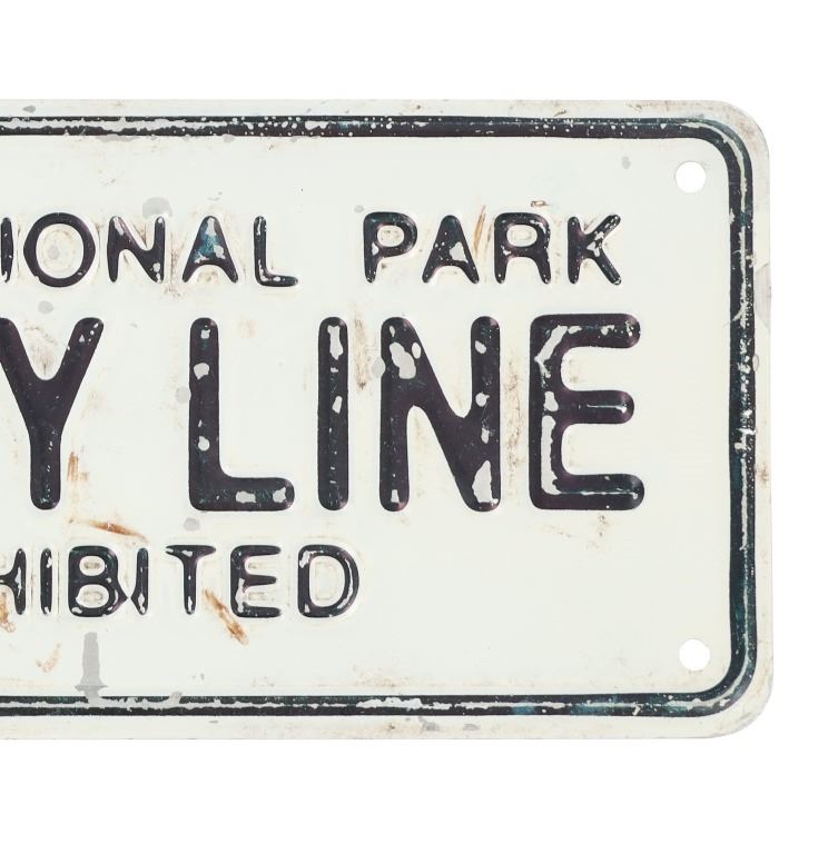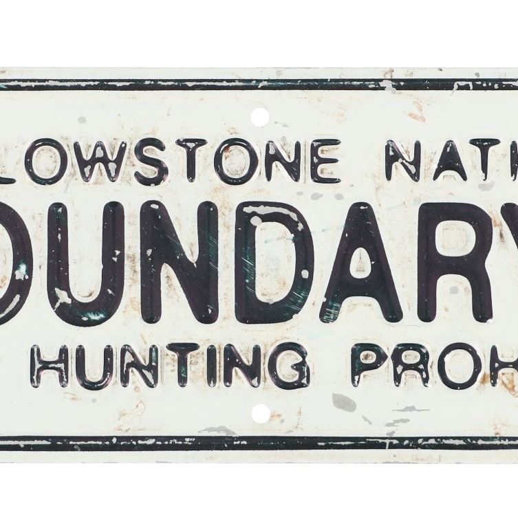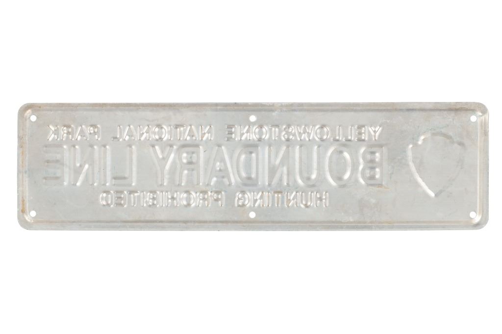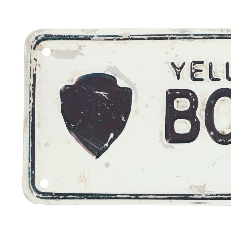 For your consideration is an Original Authentic Yellowstone National Park Boundary Line Sign, circa 1930s-1950s. The embossed lettering and logo sign shows the highly desirable arrowhead logo and reads "Yellowstone National Park / Boundary Line / Hunting Prohibited". The sign has the original six holes for mounting. This sign is in fair to good condition with small dents and missing paint. The measurements of this Yellowstone National Park sign are 4" W x 14.75" L.