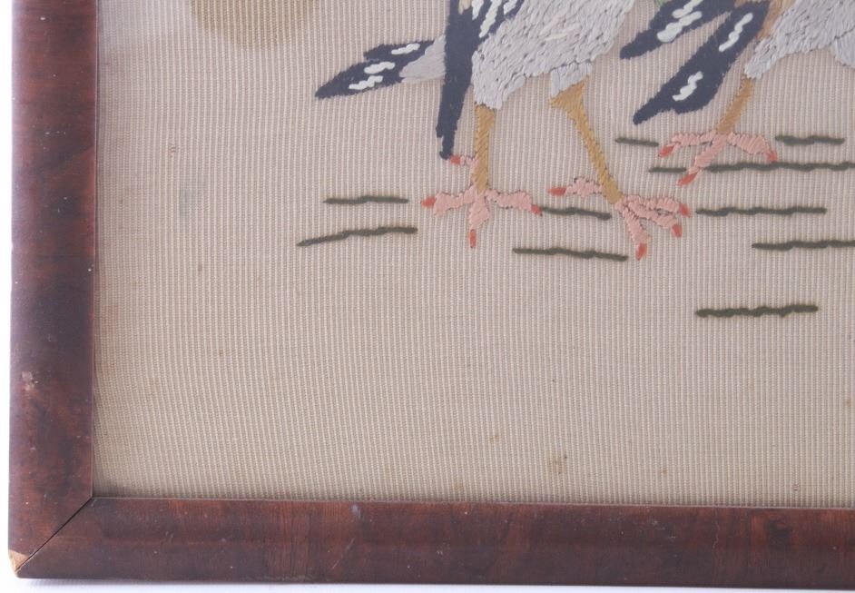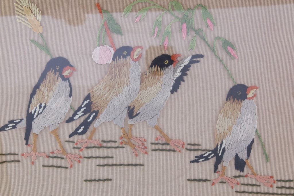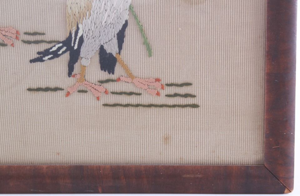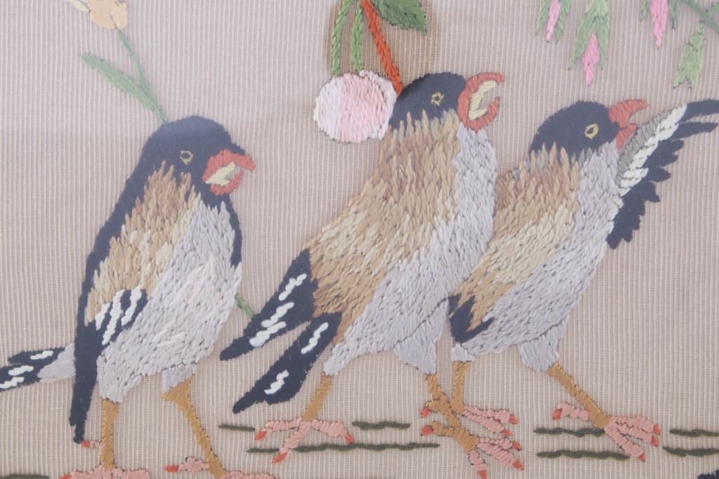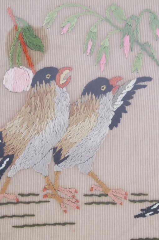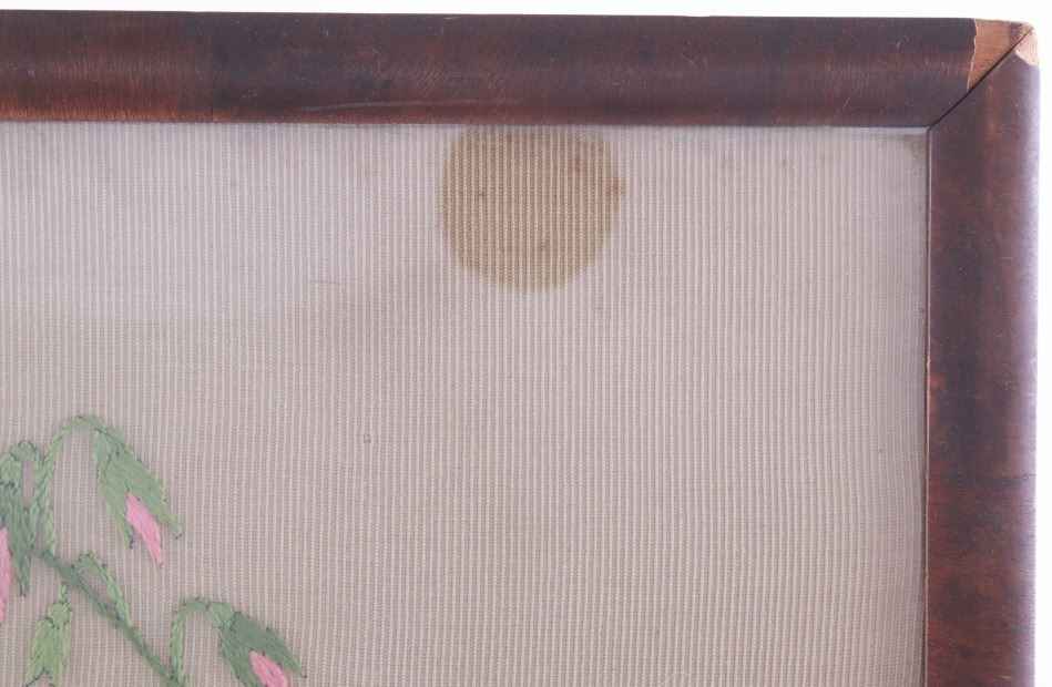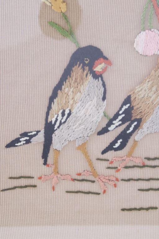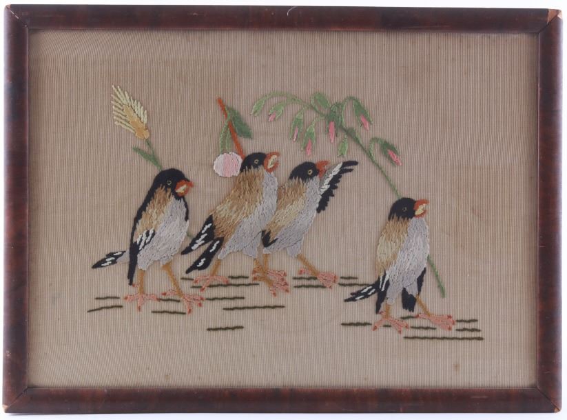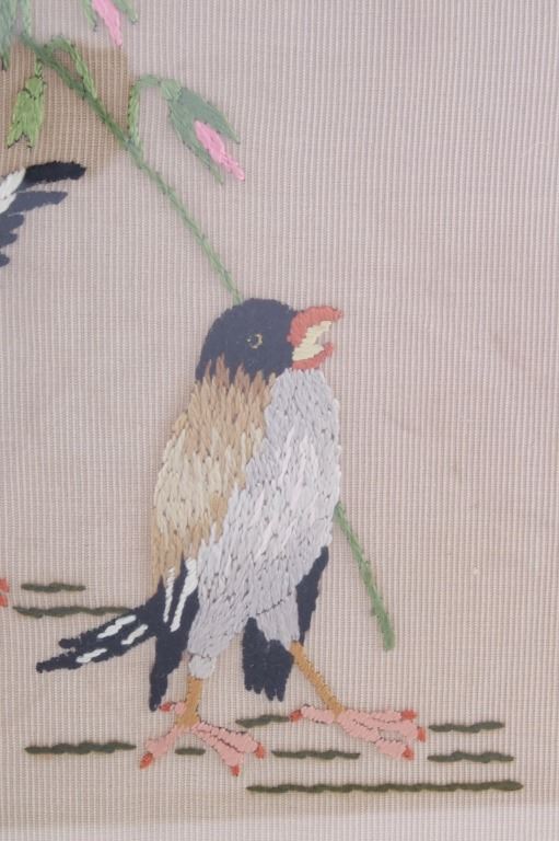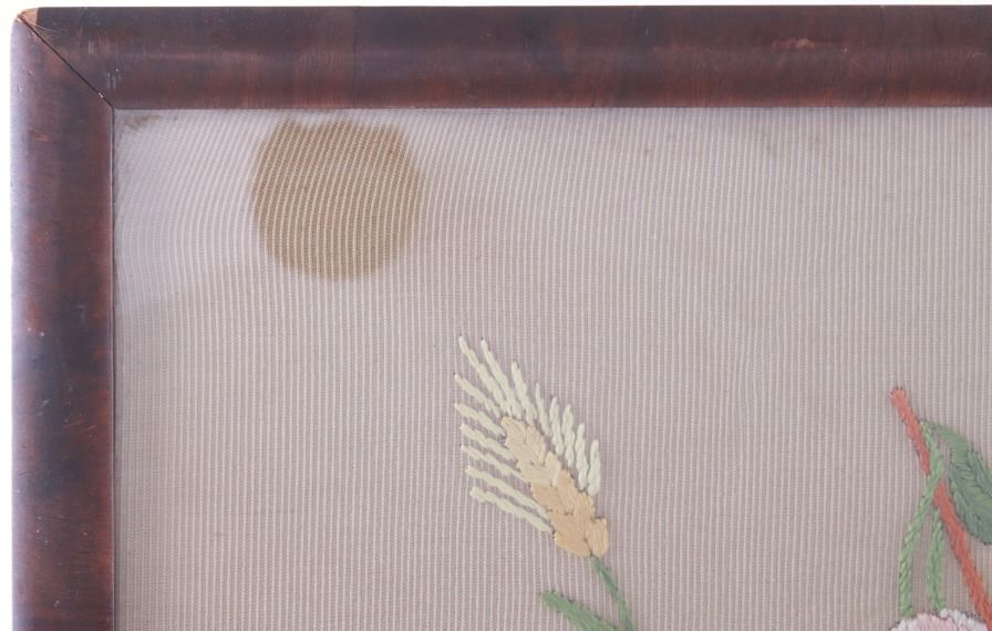 Offered in this lot is a framed piece of embroidery American Folk Art showing four birds. The fine needle work that made this art is apparent. The embroidery is done in a shinny satin thread, giving depth to the birds feathers. The fabric has aged and has some discoloration but the stitching is in good condition. The frame has light damage and wear to be expected from age. The dust paper on the back of the framing is quite damaged. The embroidery is done on a large piece of tan heavy cloth that shows 21 1/2" x 15" in the wooden frame that measures 23 3/4" x 17 1/4".
