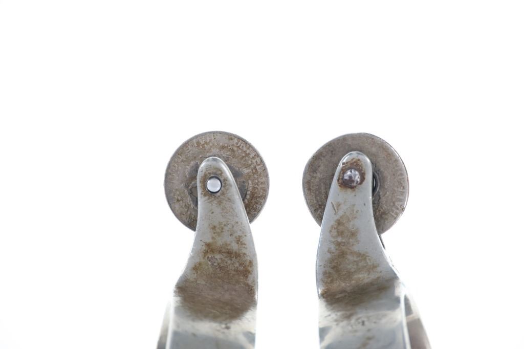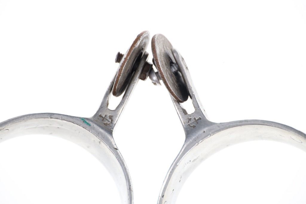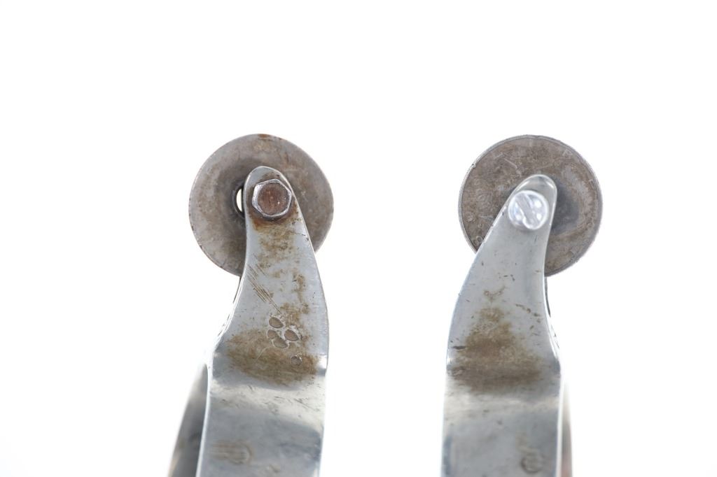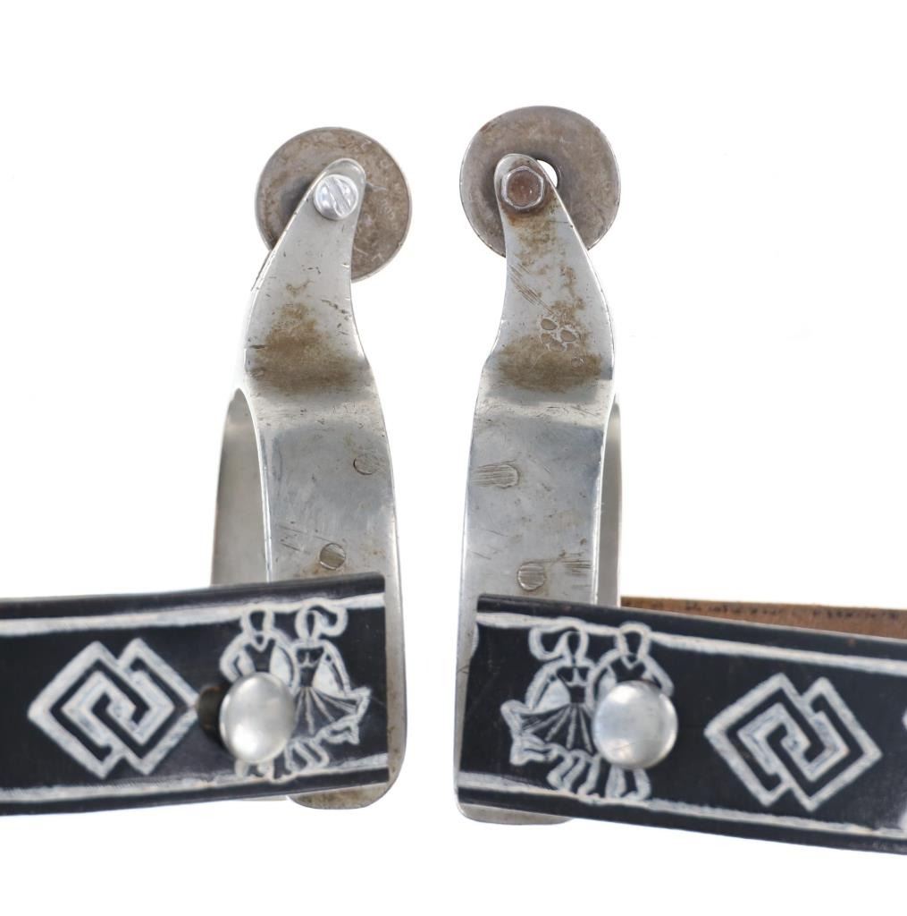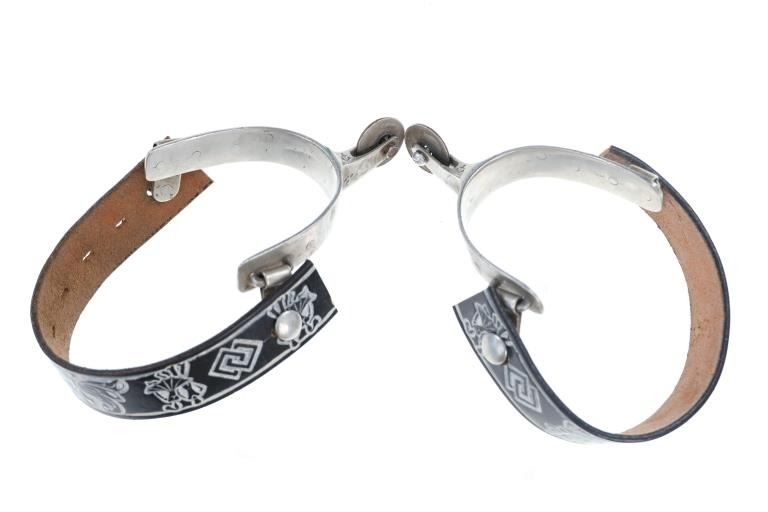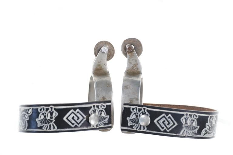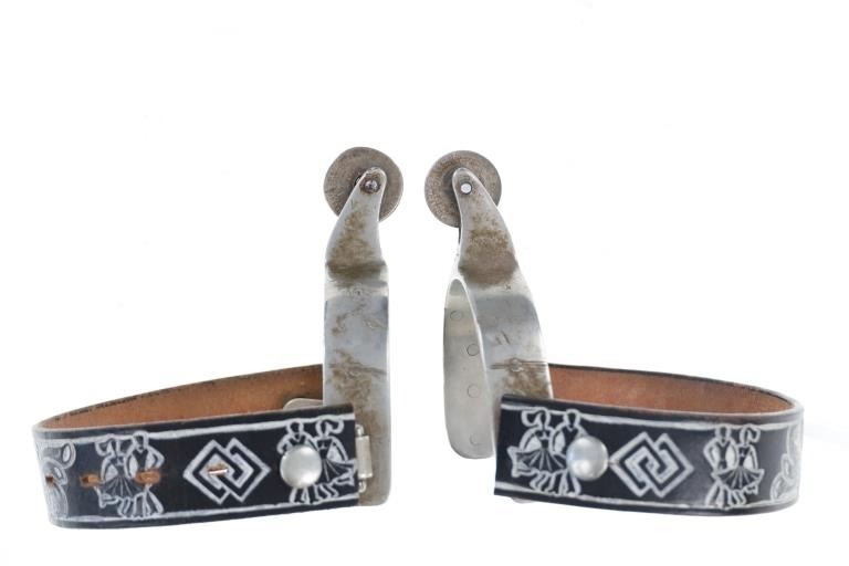 Featured in this lot is this North and Judd Star Steel Silver half dollar rowel spurs circa 1930-1940's. The spurs feature a wonderfully and professionally crafted Star Steel Silver construction with the mark under the spur strap button and is marked with the "Anchor" typical for North & Judd spurs underneath the rowel seat neck. The rowel has been replaced by 2 half dollars kept in place by screws. Since 1863, North & Judd became prominent in the manufacture of saddlery and harness hardware including bits and spurs. This business led to a close and friendly relationship with William F. (Buffalo Bill) Cody who would write letters to the company commending the quality of their spurs. The condition of this pair of spurs is well preserved with the rowels replaced with Liberty Half Dollars and the spur straps are amateur custom made spur straps with a well preserved overall condition. The measurements of this pair of spurs is 2 1/4" x 5" x 8 1/8". The collective weight of this pair of spurs is 1lb 2oz.