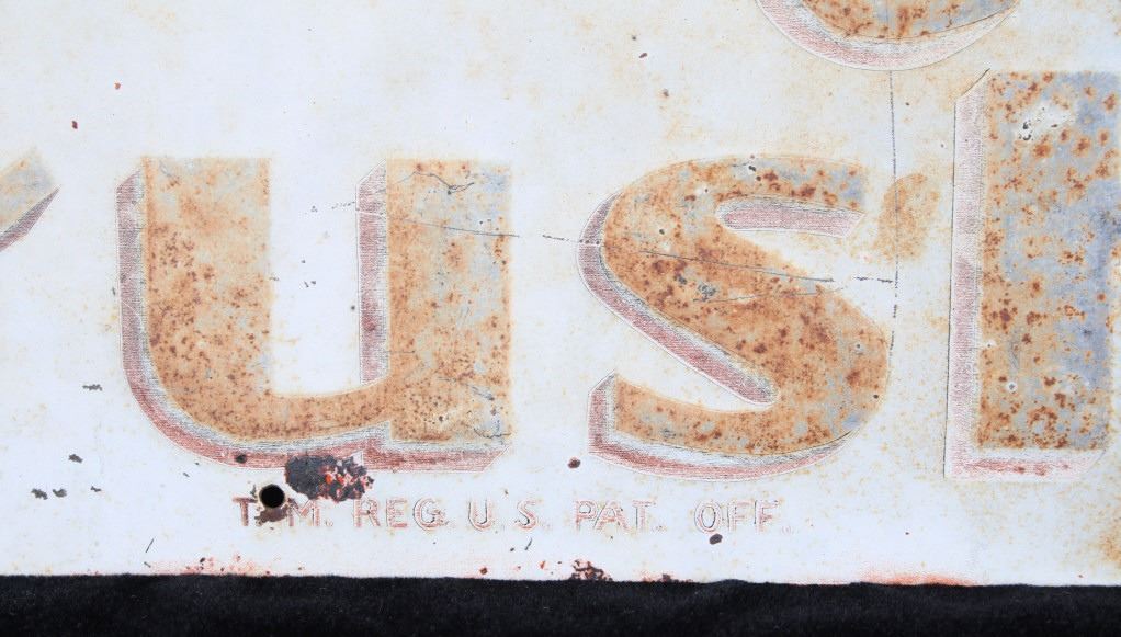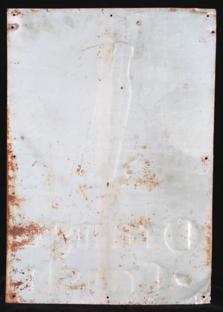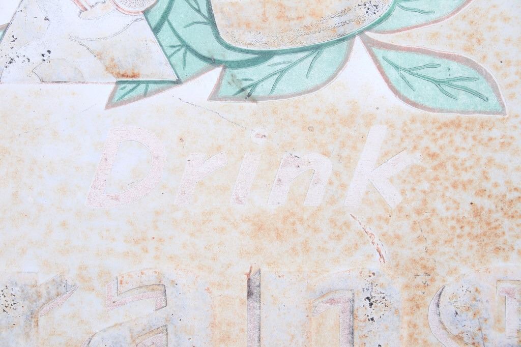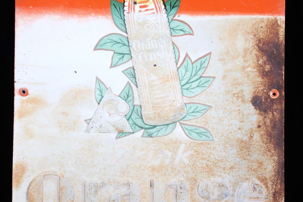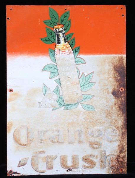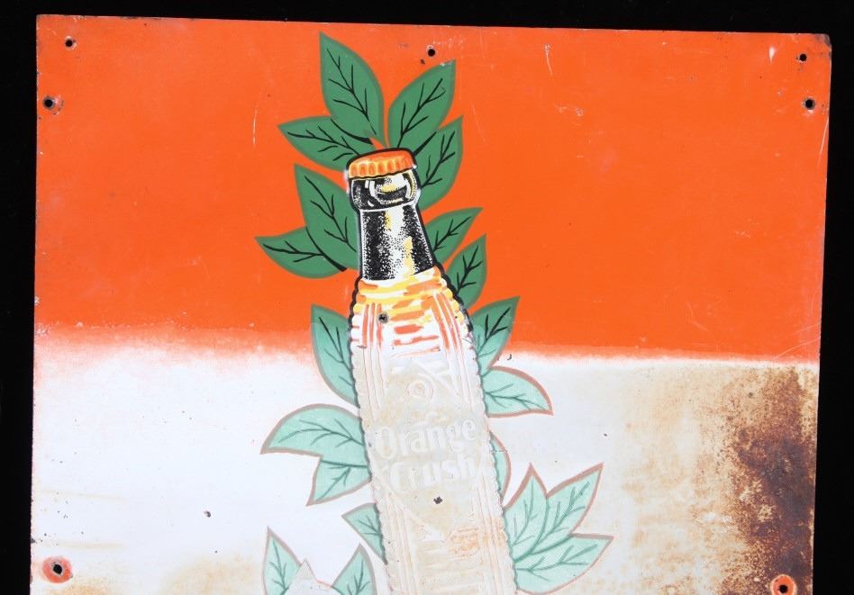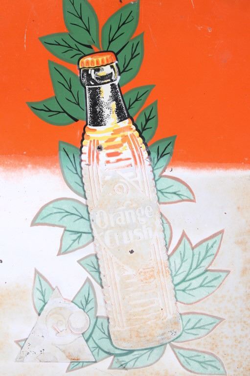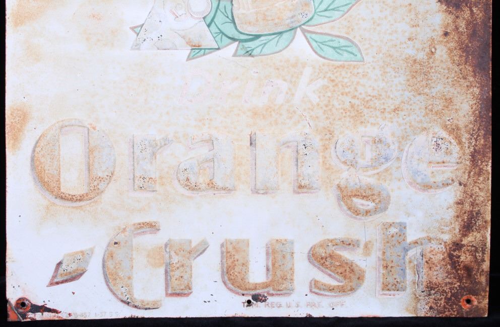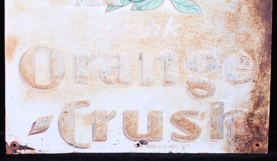 Featured in this lot is this original Orange Crush advertisement sign circa 1930's. The sign shows a bottle of Orange Crush with a floral decoration behind the bottle and reads "Orange Crush" on the bottle and reads underneath "Drink - Orange Crush" and is marked at the bottom: Made in USA - B-457 1-37 SS - T.M. Reg U.S. Pat. Off. The condition of this sign is poor to fair with heavy fading to the bottom portion of the sign with heavy oxidation to the right side of the sign. The measurements 19 1/2" x 13 5/8".