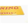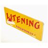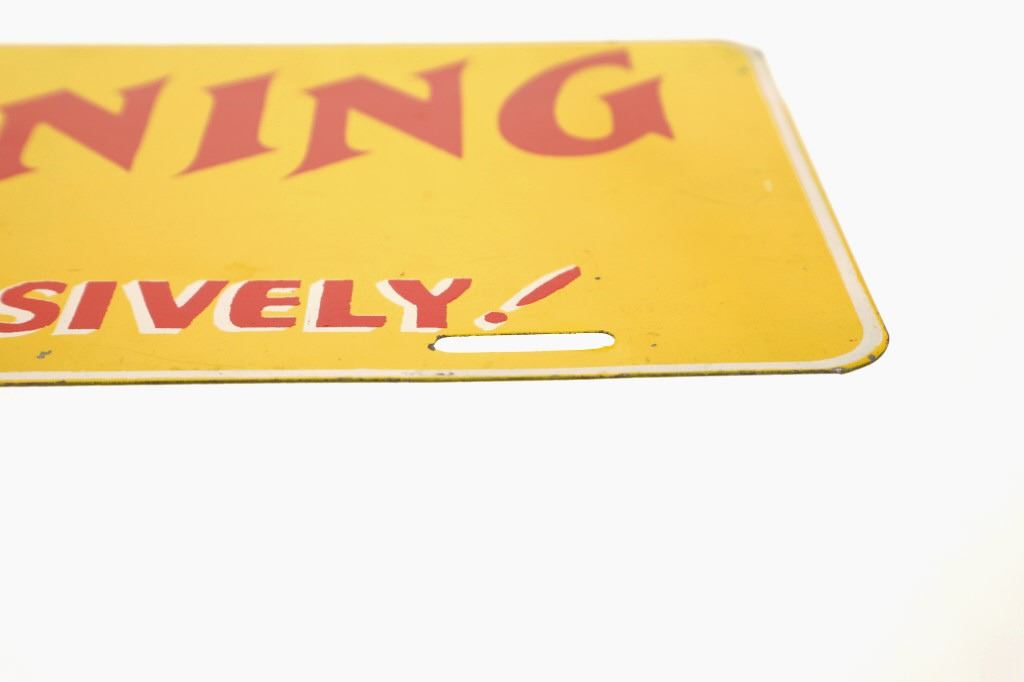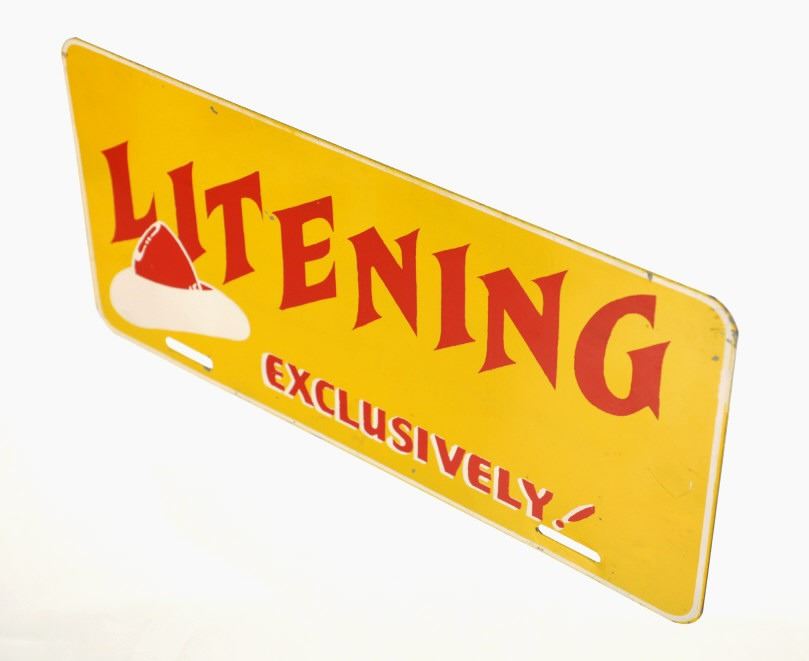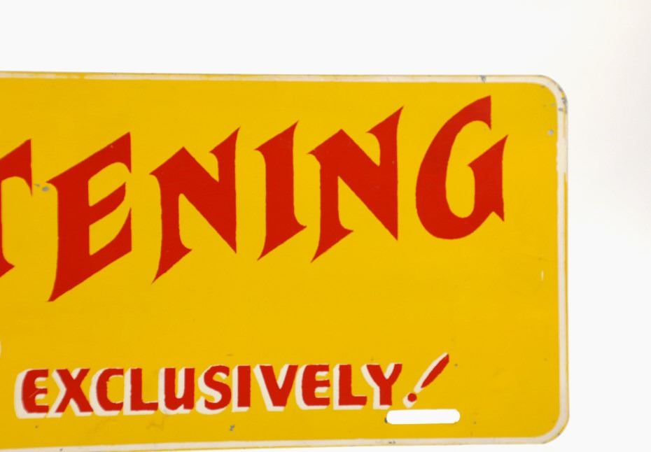Featured in this lot is this rare unfinished, Litening Gasoline license plate topper circa 1930s. Litening Gasoline was produced by the Yale Oil Corporation in in Miles City in 1928, then expanded to Billings, Montana in the 1930's. The sign shows a yellow background with a thin white line bordering the entire license plate topper. In the middle of the sign it reads, "Litening" in red lettering and below that reads, "Exclusively!" in red lettering with a white outline. In the bottom left hand corner it shows an unfinished hat with a red top. These license plate toppers, when finished, showed more detail, lettering and coloring to the entire piece. The company never fully sent this license plate topper into production as they were too expensive to produce. This is a very rare, unfinished piece of Montana history! The topper shows good condition with no signs of obvious damage and slight wear and small chipping to the paint. The topper measures 6 1/2" L x 14" W.