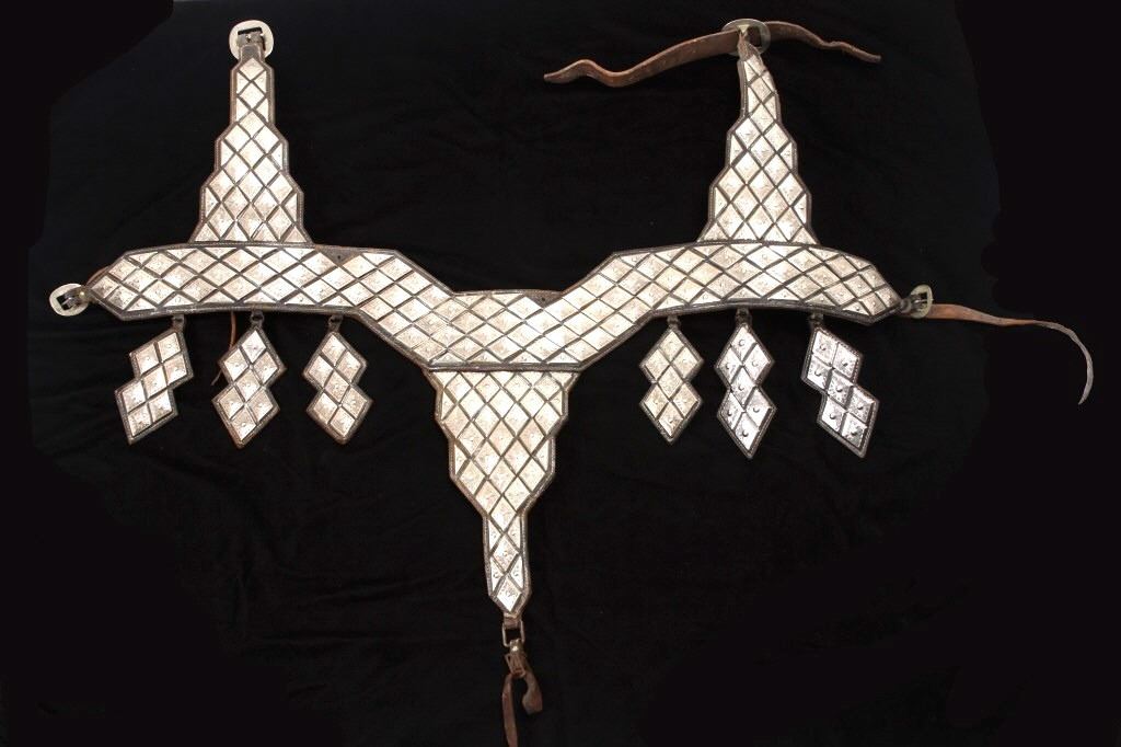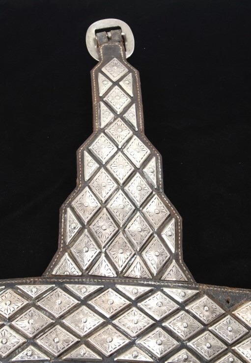 This is an outstanding circa 1940-1950’s Ted Flowers Saddlery Silver Parade Martingale in very high grade. Ted Flowers was one of the more prolific parade saddle makers of the 1930-1950’s with some of his customers being Roy Rogers and Gene Autrey amongst other famous cowboys. Early examples from the 1930-1940’s were done on L.V. Frazier Farm and Home Supply Indianapolis, IN. tooled saddles with his silver work adorned but later in the circa 1940-1950’s Ted Flowers started producing his own saddles, such as this amazing piece. This leather and silver martingale matches the previous lot, the fully silver parade saddle, with original silver work, mostly nickel silver with diamond shaped scales each having hand tooled finishes. The silversmithing, silver work is truly exception. From a Montana Cowboy collection and rarely seen for sale. Overall in very good condition for its age with no major damage and nice presentation. The overall measurements of this martingale are 28" x 21" x 12".