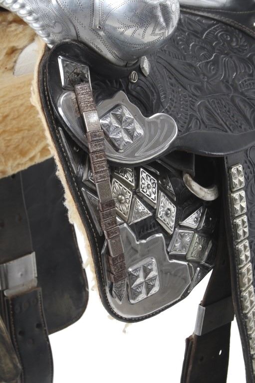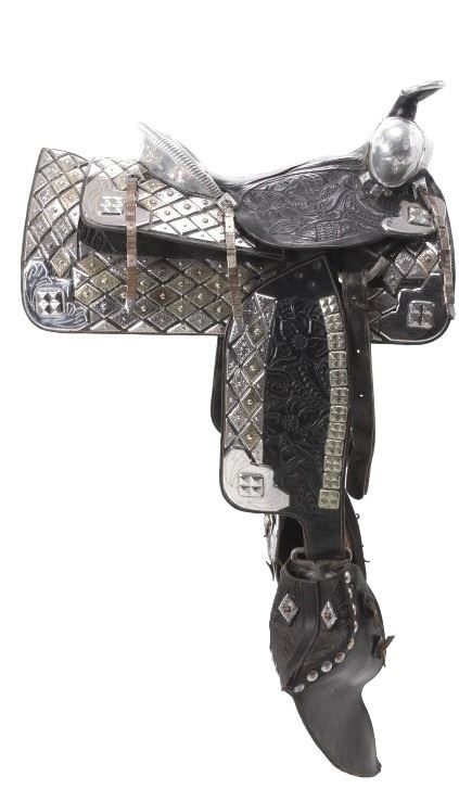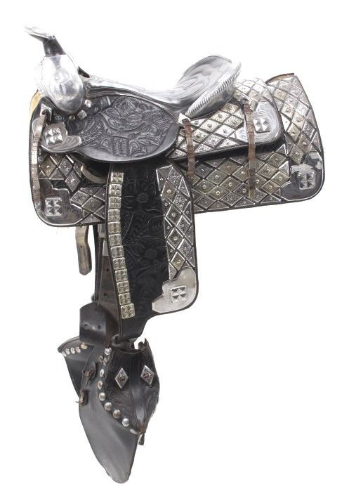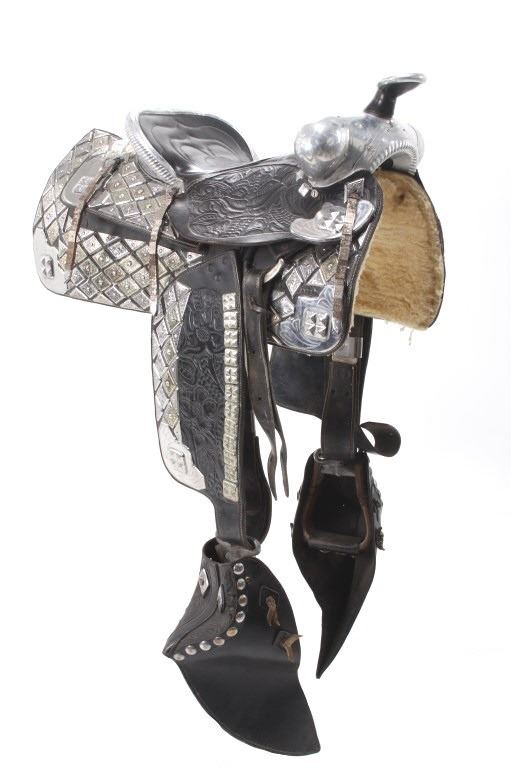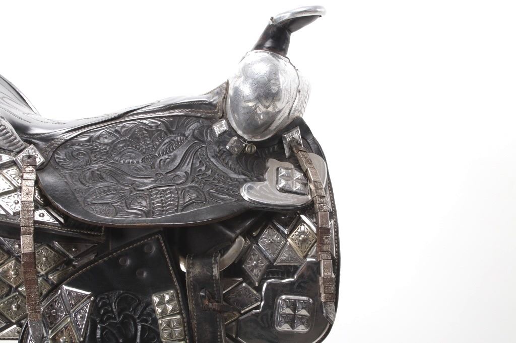 This is an outstanding circa 1940-1950’s Ted Flowers Saddlery Silver Parade Saddle in very high grade. Ted Flowers was one of the more prolific parade saddle makers of the 1930-1950’s with some of his customers being Roy Rogers and Gene Autrey amongst other famous cowboys, some of the saddles were part of the famous Sharky's Nugget Casino Collection in Reno, NV. which sold in 2002. Early examples from the 1930-1940’s were done on L.V. Frazier Farm and Home Supply Indianapolis, IN. tooled saddles with his silver work adorned but later in the circa 1940-1950’s Ted Flowers started producing his own saddles, such as this amazing piece. The saddle is heavily adorned with original silver work, mostly nickel silver with diamond shaped scales each having hand tooled finishes. The saddle is covered nearly completely in silversmithing / silver work with a silver covered horn, cantle, pommel rise, and more. These saddles in this high of grade of finish regularly sell for over $10,000 (one example being given a value of $35,000) with this being a truly wonderful example from a Montana Cowboy collection. Overall in very good condition for its age with no major damage and nice presentation. The overall measurements of this saddle are 47" x 17" x 27" with a seat size of 14 1/2".
