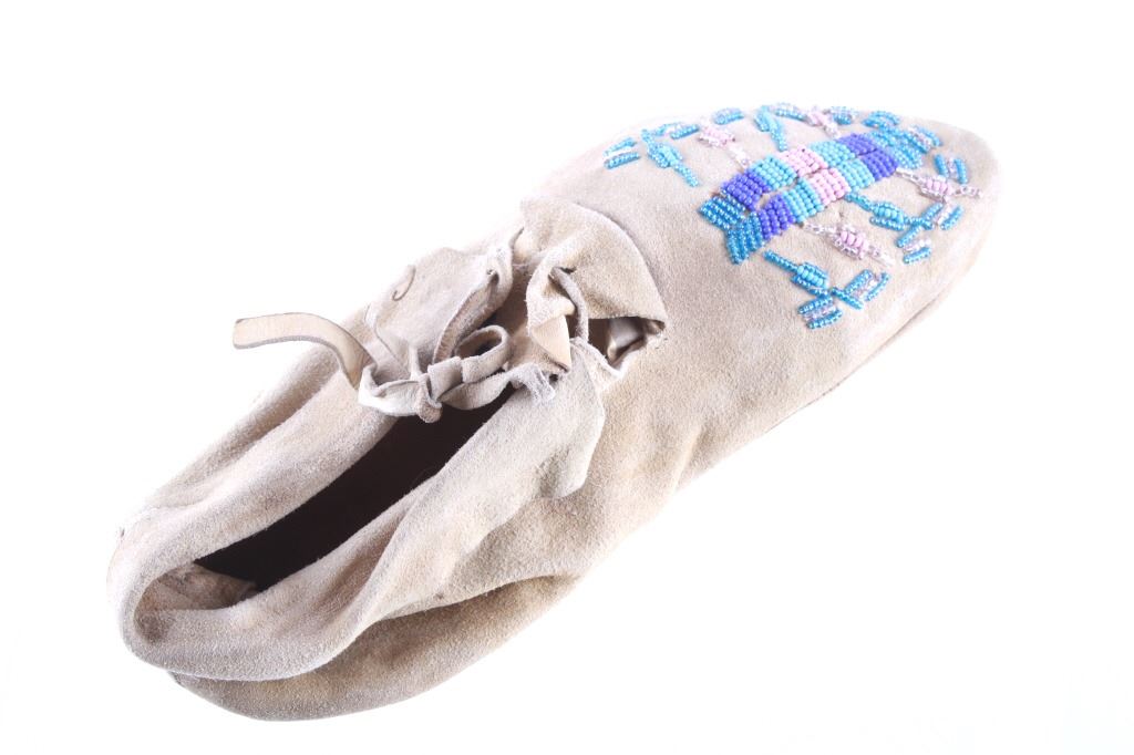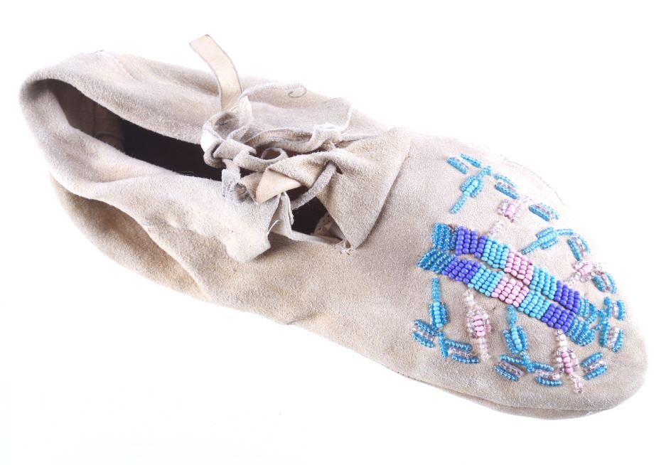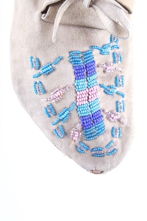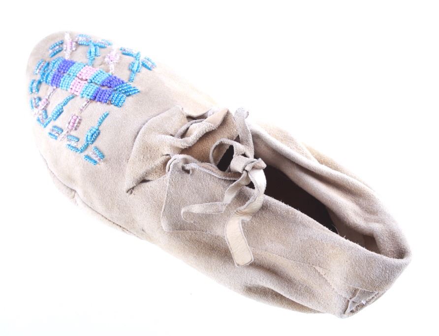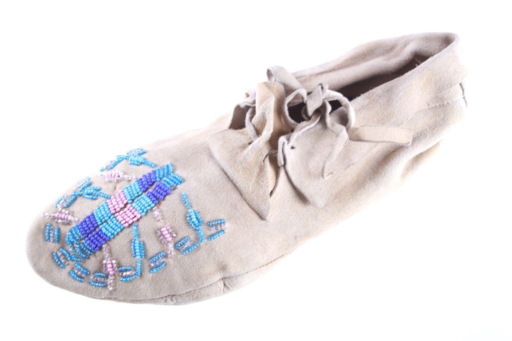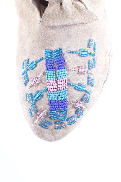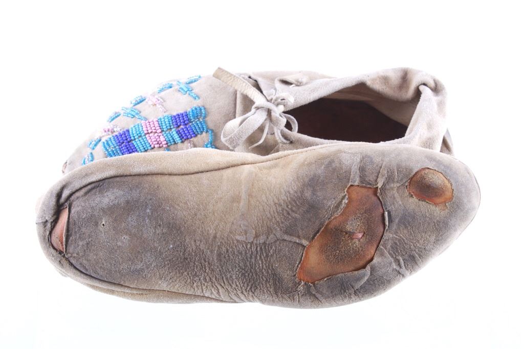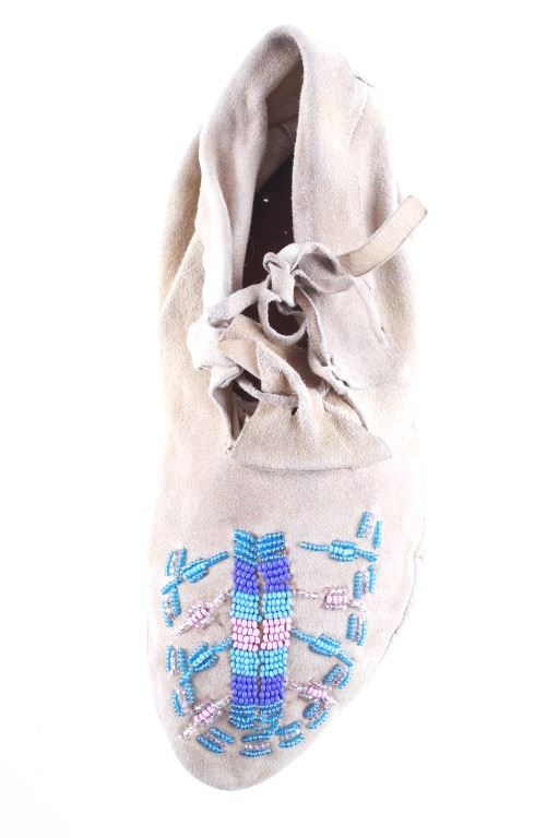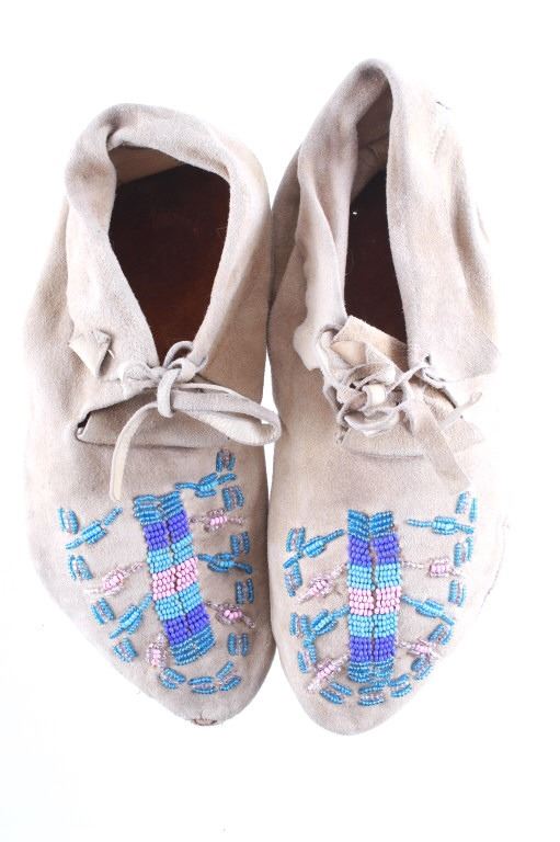 Featured in this lot is this pair of Montana Crow hide and hard sole moccasins circa 1940's to 1950's. The mocassins feature wonderfully and professionally crafted hide and trade seed bead construction that feature hard sole's and hide for the top and side walling of the mocassins. The trade seed bead coloration include Cheyenne pink, sky blue, medium blue and translucent blue colored beads that form a beautiful rendition of geometric patterns on the top of the mocassins. The condition of this pair of mocassins is good with a small tear to the toe of the right mocassin and some wear to the hard sole of both mocassins. The measurements of the mocassins are 2 1/4" x 9 1/2" x 3 3/4".