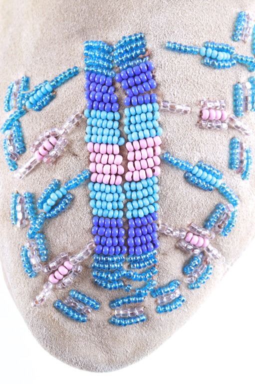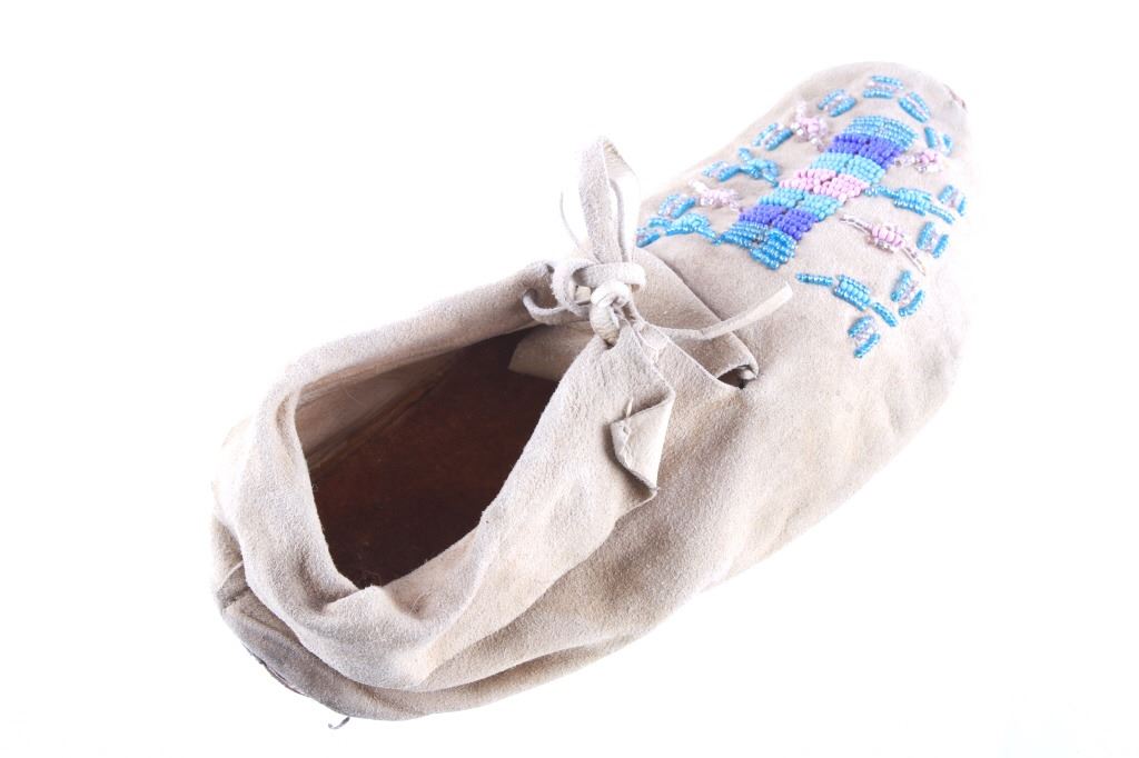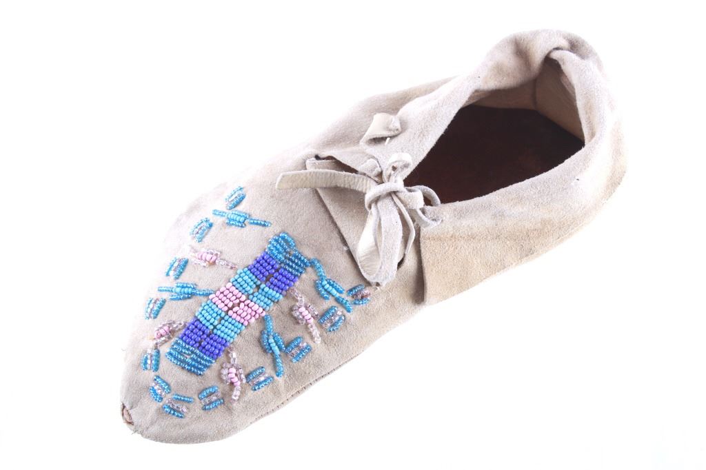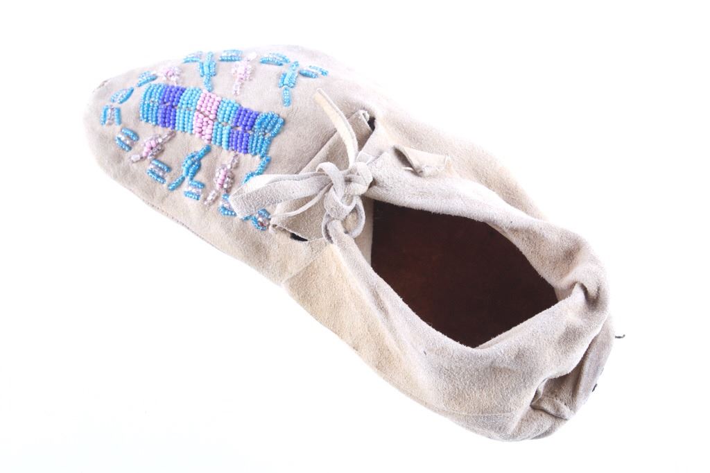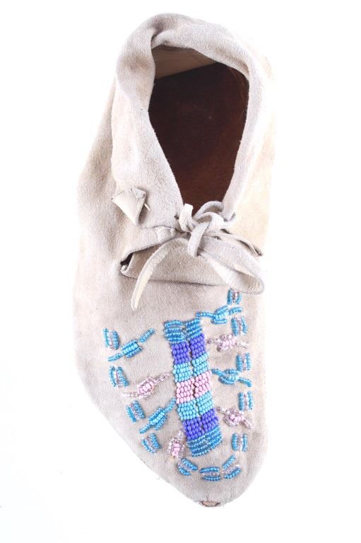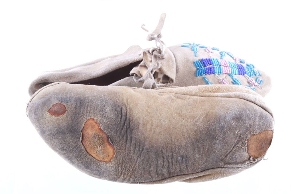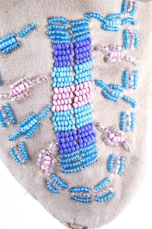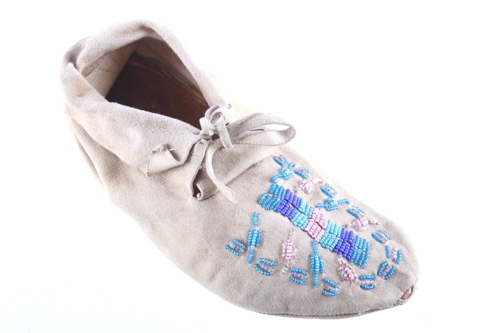 Featured in this lot is this pair of Montana Crow hide and hard sole moccasins circa 1940's to 1950's. The mocassins feature wonderfully and professionally crafted hide and trade seed bead construction that feature hard sole's and hide for the top and side walling of the mocassins. The trade seed bead coloration include Cheyenne pink, sky blue, medium blue and translucent blue colored beads that form a beautiful rendition of geometric patterns on the top of the mocassins. The condition of this pair of mocassins is good with a small tear to the toe of the right mocassin and some wear to the hard sole of both mocassins. The measurements of the mocassins are 2 1/4" x 9 1/2" x 3 3/4".