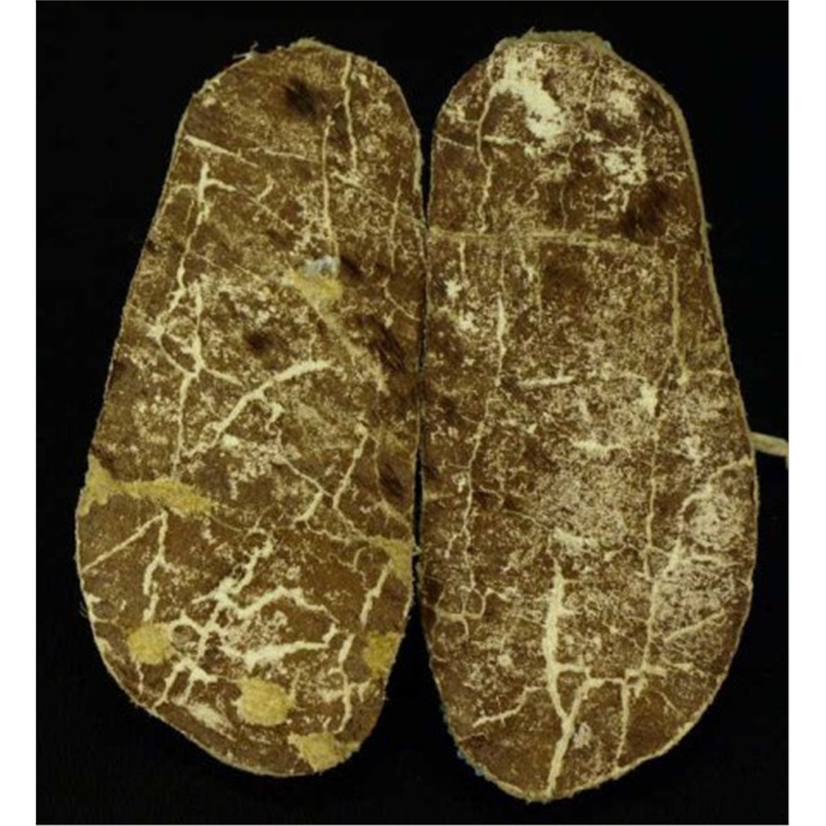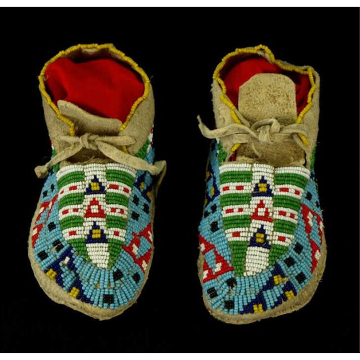 C. 1940's Sioux baby moccasins sinew sewn, hard soles, 5" long.