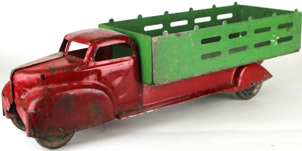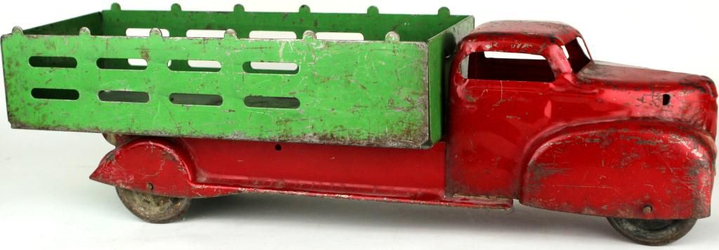 C. 1940's press tin toy truck 20" long, showing good condition with original paint, minus the grill. Est. 25-75