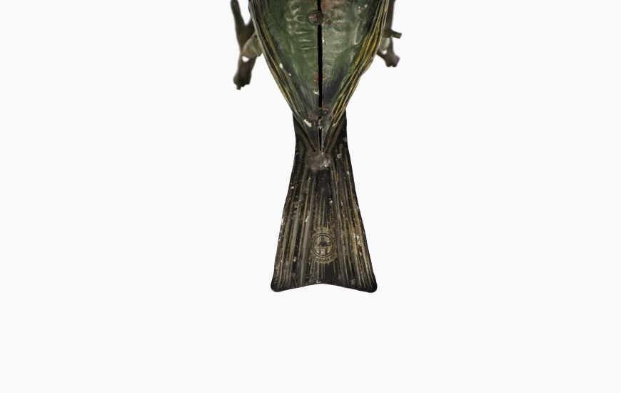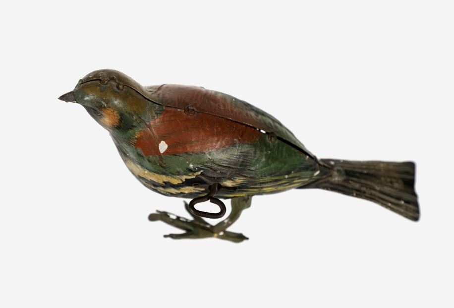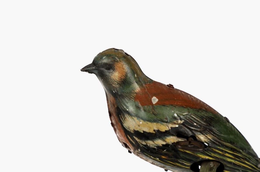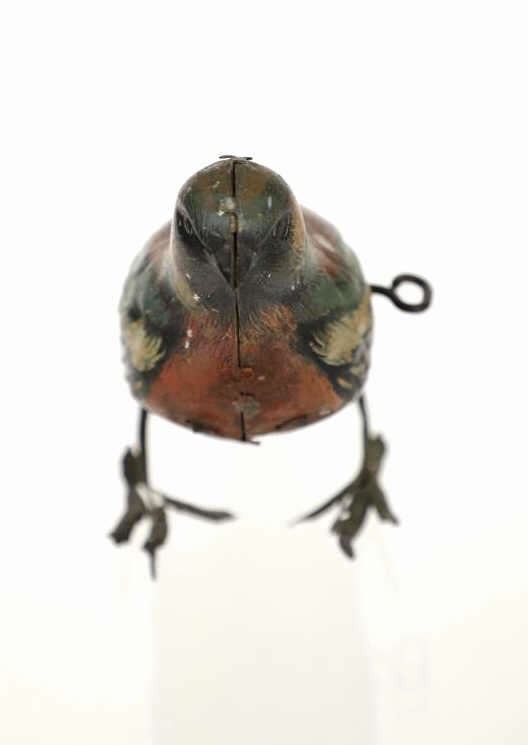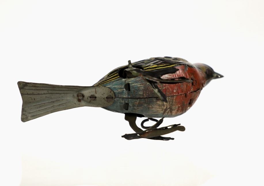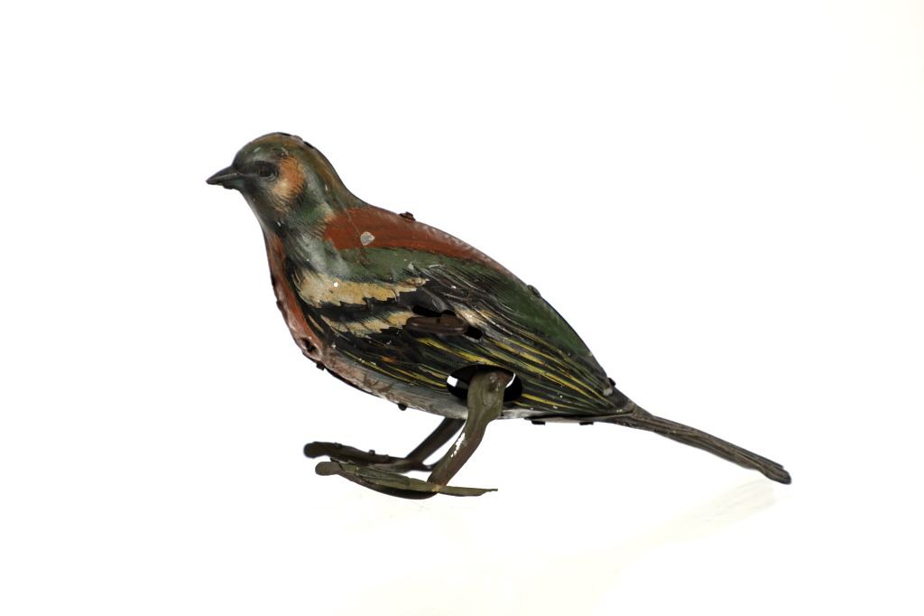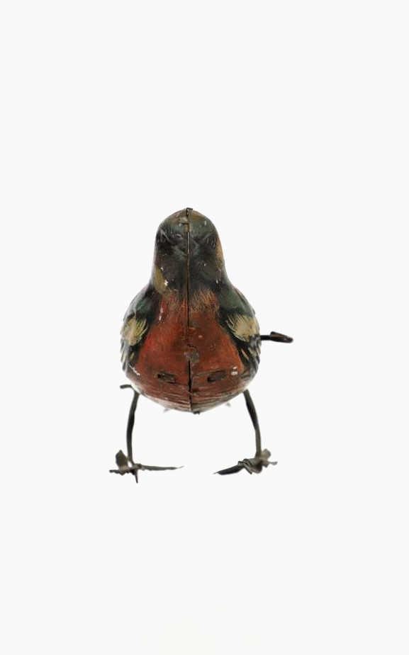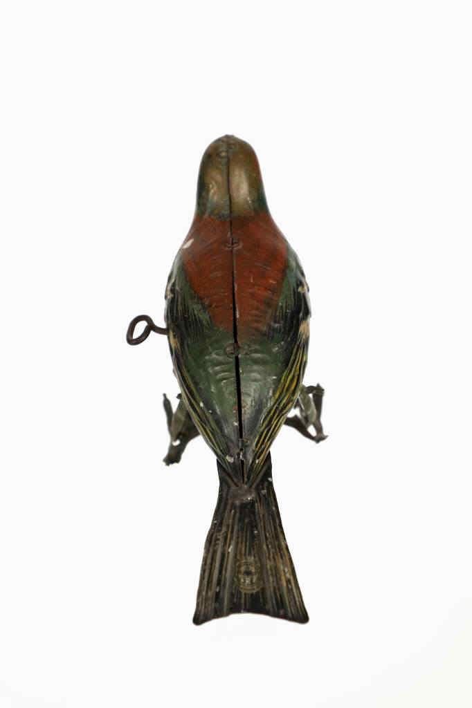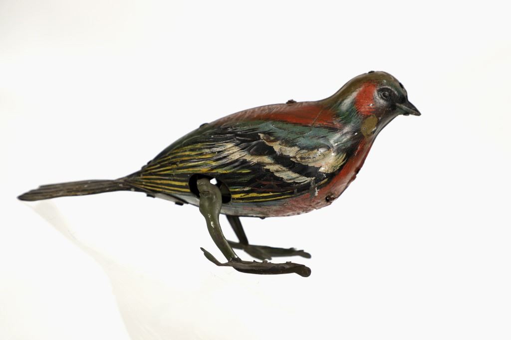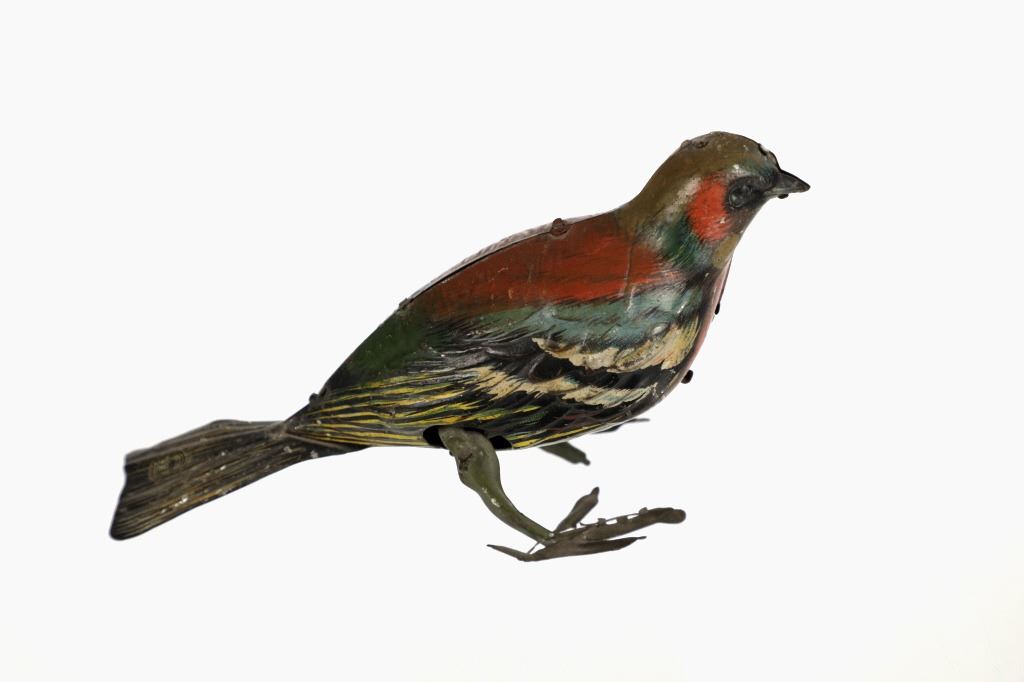 Featured in this lot is this 1940s tin wind up bird made in Germany. The toy is marked on the tail reading, "Made in Germany HEN" in beige and black coloring. The bird shows a beautiful decoration with colors of red, green, yellow, white, black and brown. The toy shows a fixed key on the left side of the they toy and when wound the bird would do a pecking motion towards the ground as if it were picking food up off of the ground. The key winds but the toy does not engage. The toy shows fair condition with faded and chipped paint and is not in working order. The toy measures 6 1/4" L x 2 3/4" W x 3 1/2" H.