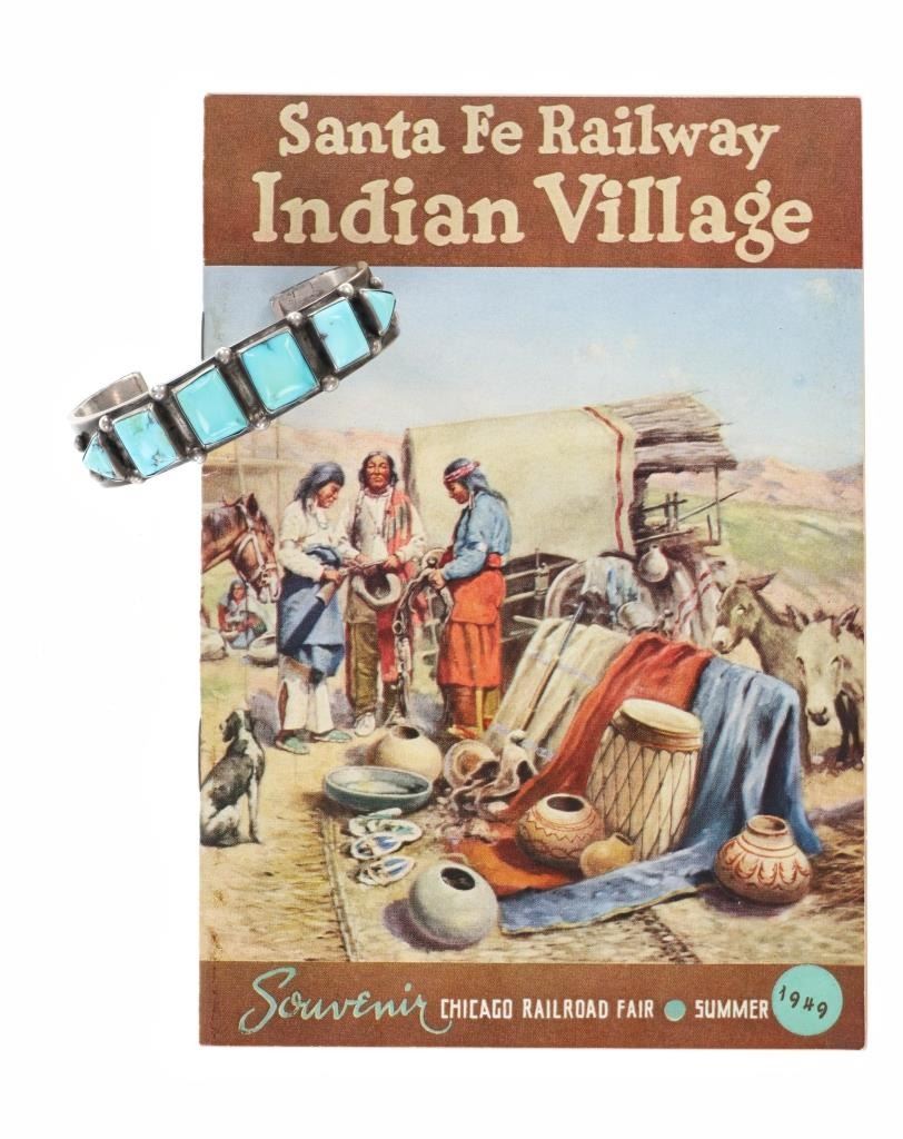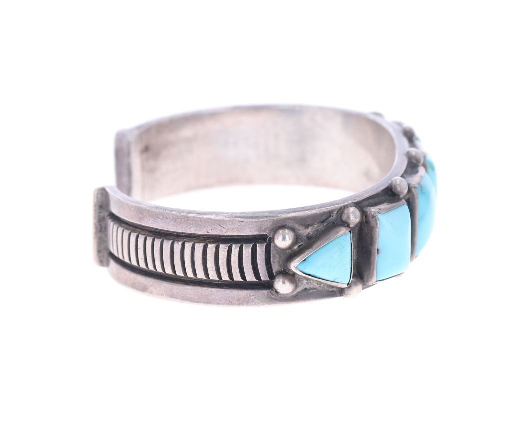 This is a rare, original Old Pawn Navajo silver bracelet set with rare Sleeping Beauty Turquoise from circa 1949. The bracelet was purchased at the Trading Post at the top of Trail Ridge in Rocky Mountain National Park in December 1949. The piece exhibits six polished cabochons which are true, authentic early Sleeping Beauty Mine Turquoise and are untreated showing a gem quality with phenomenal color and clean matrix. The bracelet shows the classic Old Pawn construction with thick heavy silver having a stamped bracelet with spots of silver adorning the bezel set stones. The bracelet is accompanied by a provenance note that confirms that Grandma Verna Kummer purchased the bracelet in 1949 at the top of Trail Ridge Trading Post in The Rocky Mountain National Park and is accompanied by a Chicago Railroad Fair from the Summer 1949 called Santa Fe Railway Indian Village, a travel brochure that the family also picked up from the Trading Post at the same trip in 1949. The untreated turquoise has a few tell tail chips, further showing its rarity, and overall the piece is well kept in original condition. The measurements of this bracelet is 2 1/4" x 2 3/4" x 3/4" and the circumference is 5". The collective weight is 62.3g.