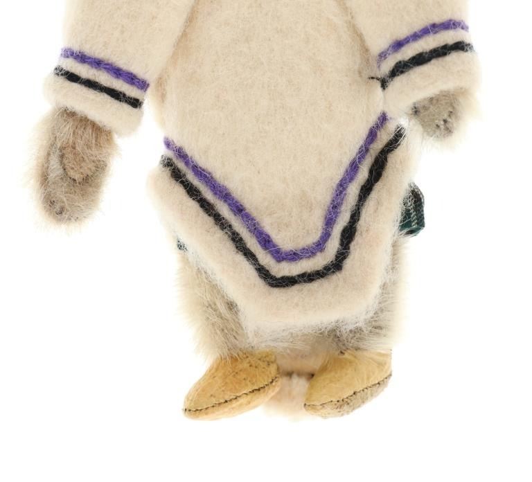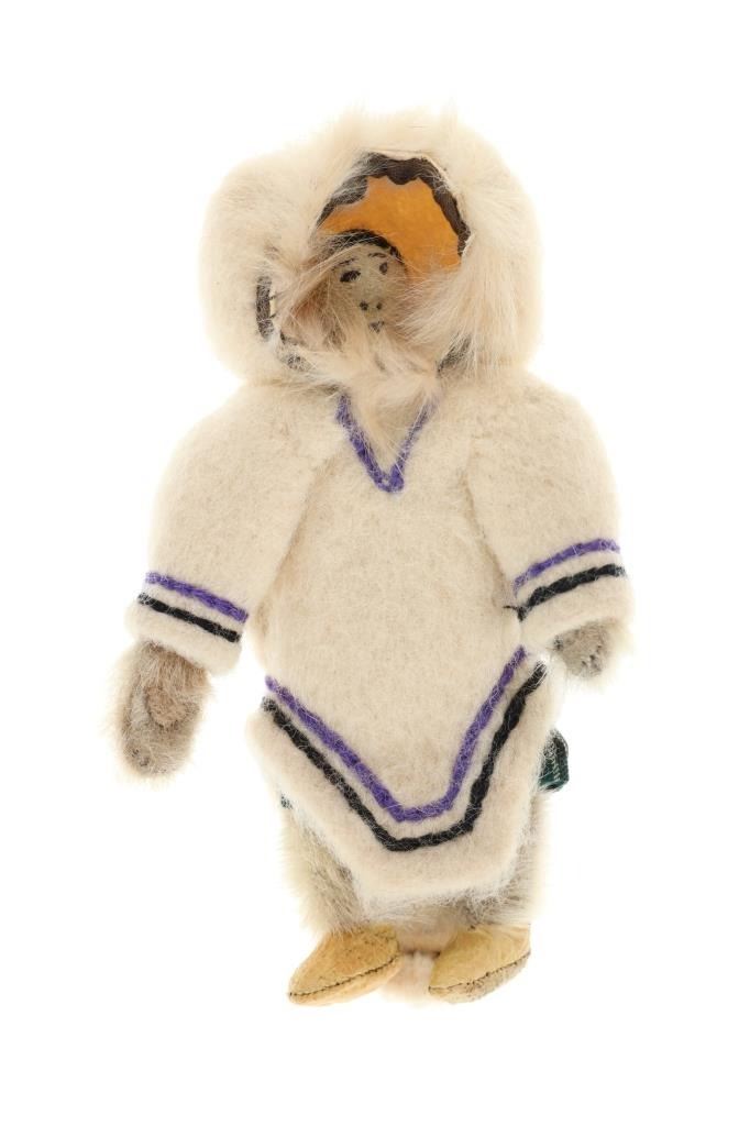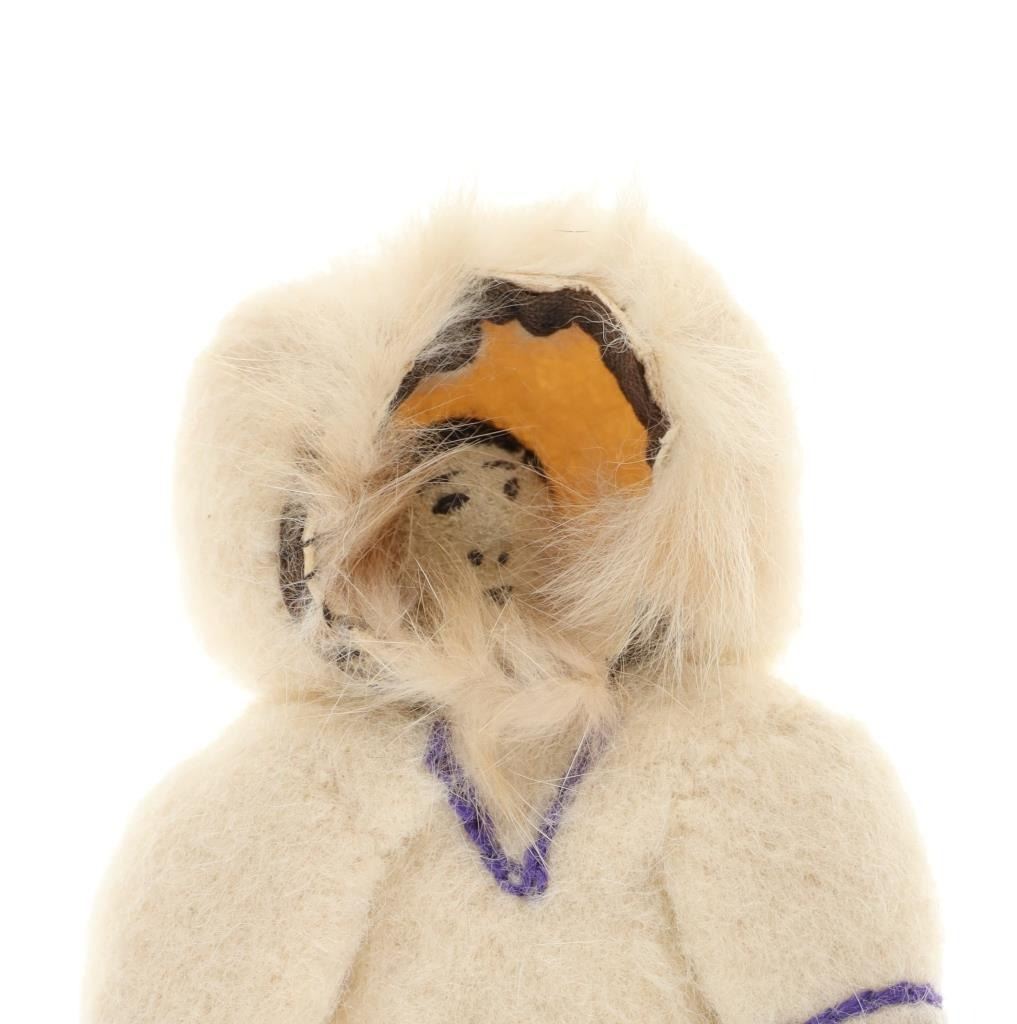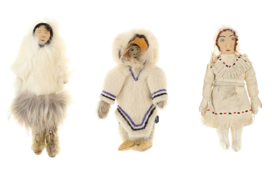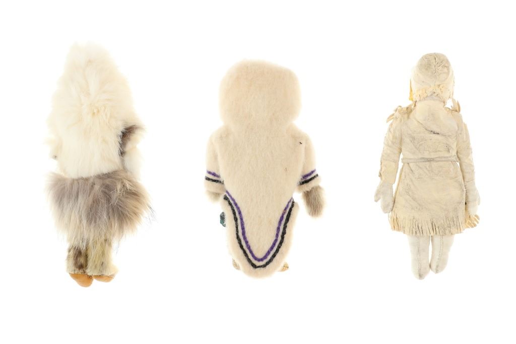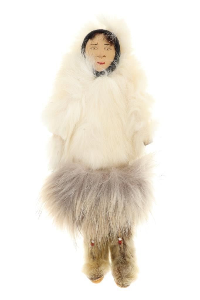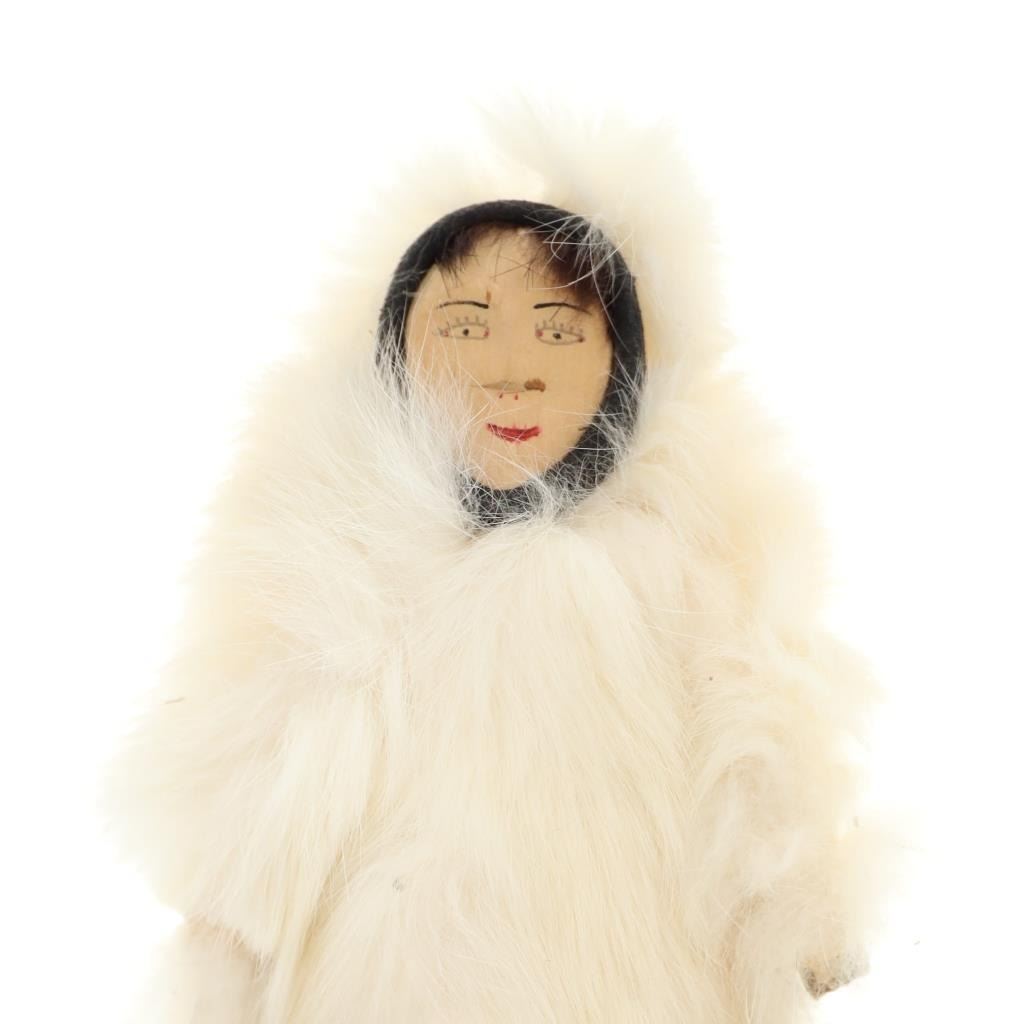 The lot features three circa 1950’s Inuit Eskimo Seal Skin and Caribou hide dolls. The dolls are crafted from thread sewn trade clothe and Indian tanned Caribou hides with clothing in Seal Skin, White Fox fur, Rabbit fur and a woven seal fur jacket. There is one carved wooden and painted face, one Indian tanned Caribou hide and black yarn facial features head and one processed fur fabric or wool face with sewn features wrapped in Indian Caribou hide hood. Two of the dolls have Seal Skin Mukluk moccasin high top boots. Two of the dolls have glass trade seed beaded features as well. Provenance: Collected in the 1950-1960’s by the consignors family well traveling throughout the America’s collecting at Trading Posts. The condition of this collection of Inuit dolls is good with only slight wear to the hide of one of the dolls but otherwise is in good overall preserved condition. The measurements of this collection of dolls ranges from 7 3/4" x 4 5/8" x 2 1/8" to 8 3/4" x 3 5/8". The collective weight of these dolls is 6oz. Some slight fur loss.