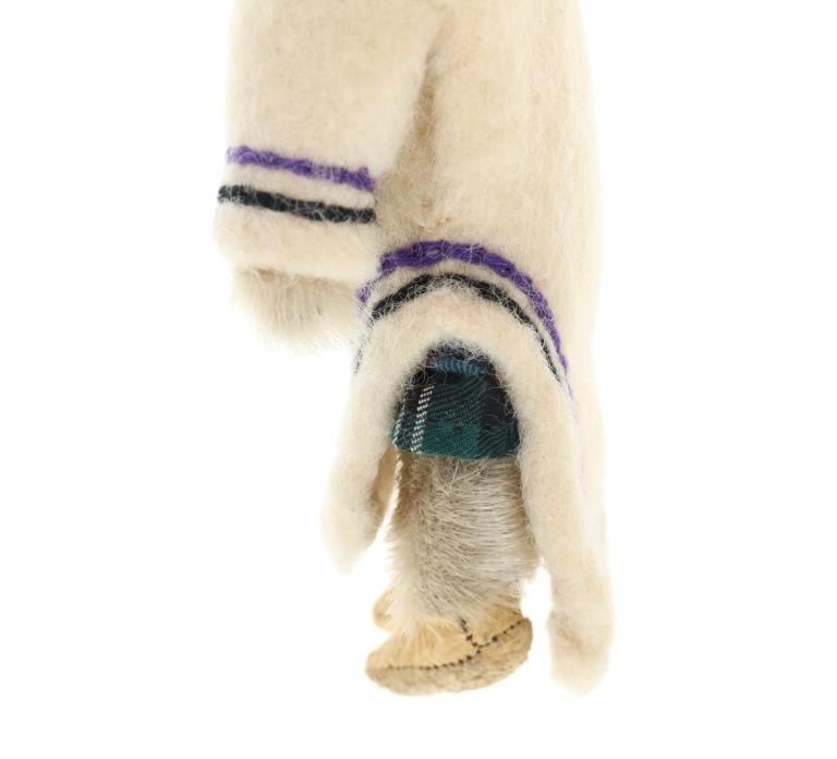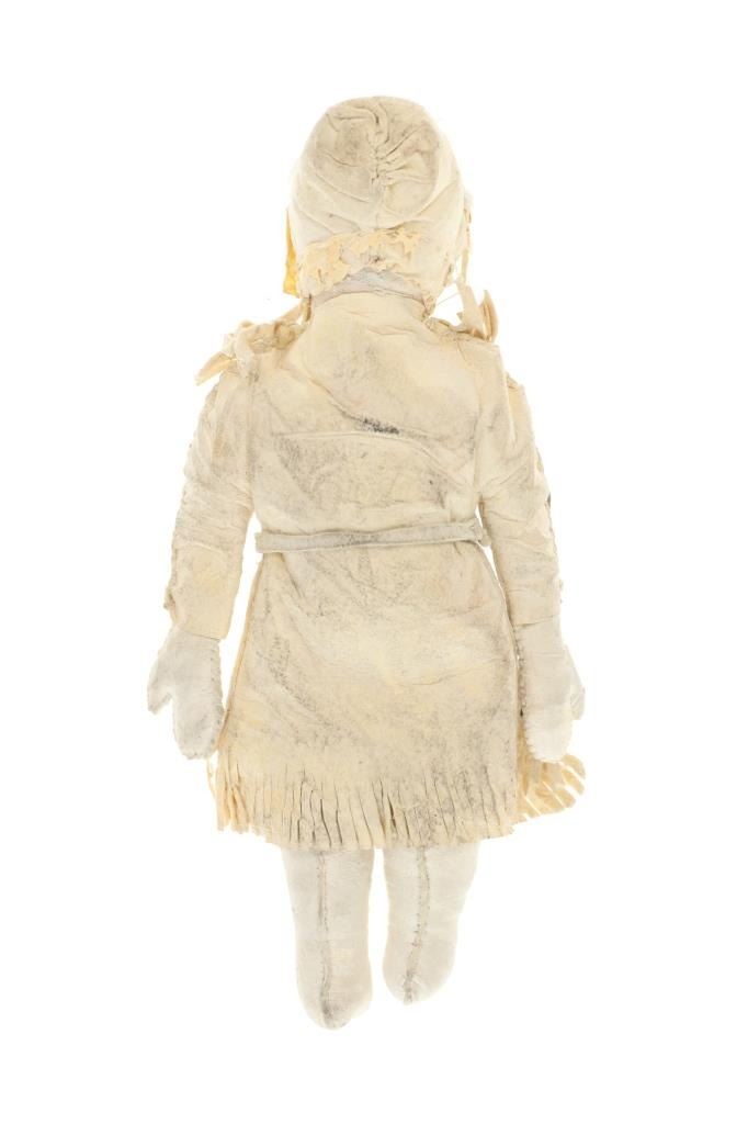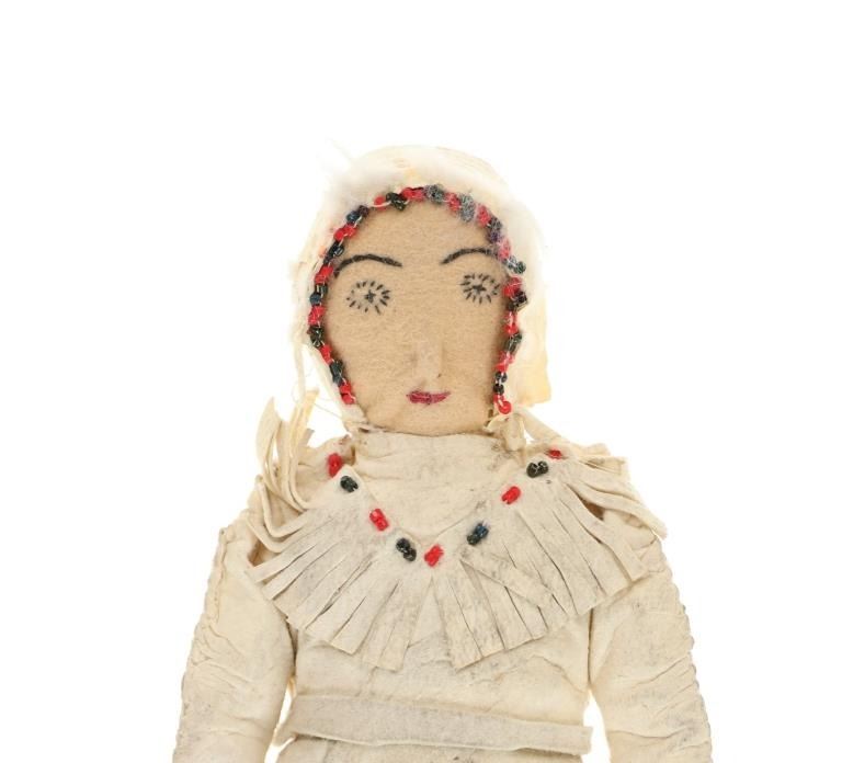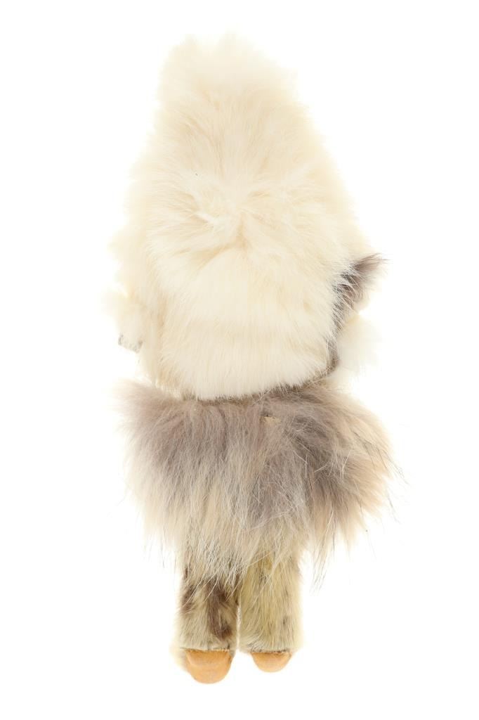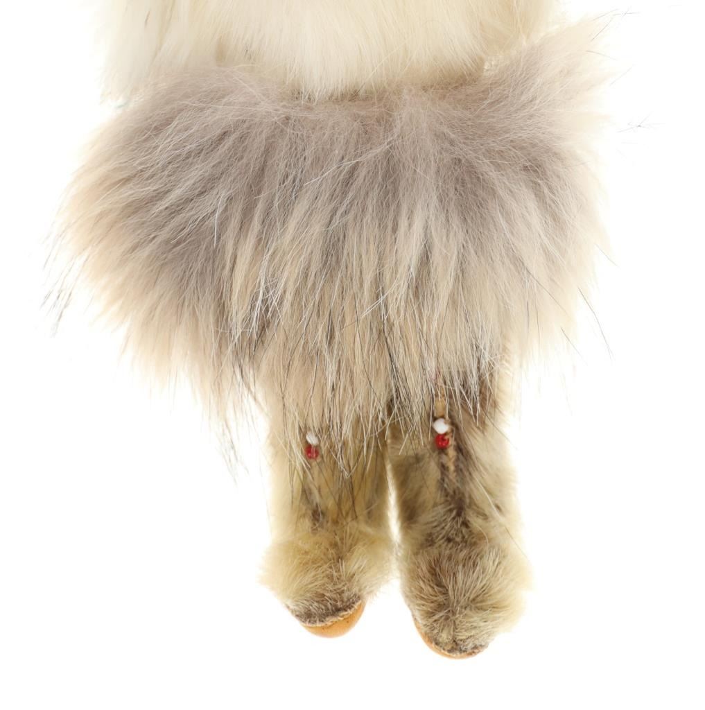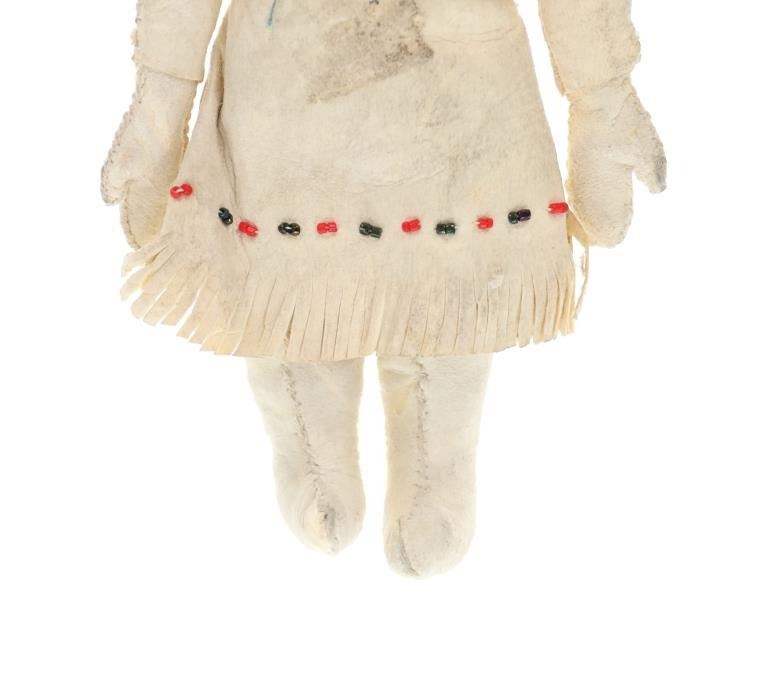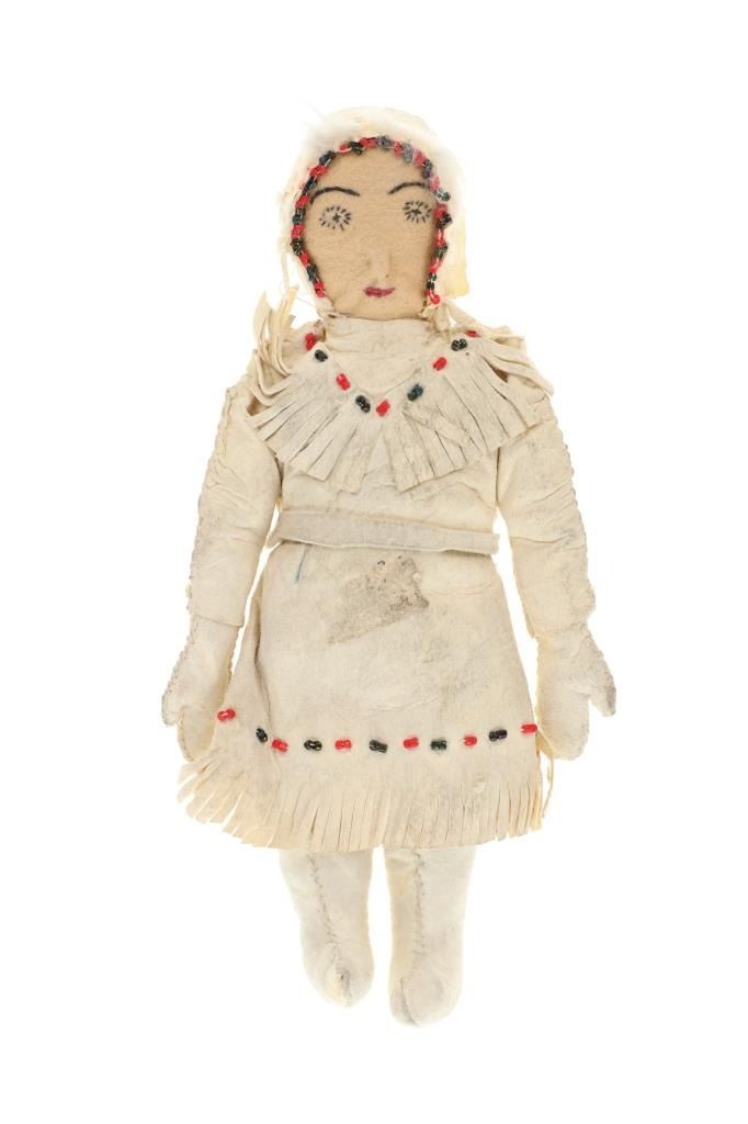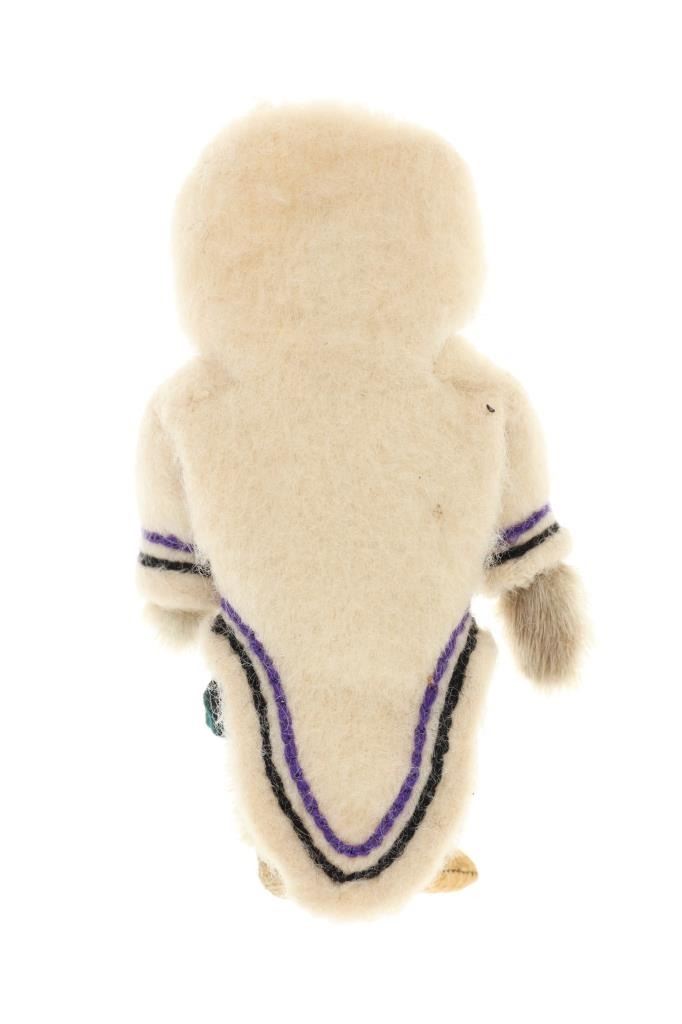 The lot features three circa 1950’s Inuit Eskimo Seal Skin and Caribou hide dolls. The dolls are crafted from thread sewn trade clothe and Indian tanned Caribou hides with clothing in Seal Skin, White Fox fur, Rabbit fur and a woven seal fur jacket. There is one carved wooden and painted face, one Indian tanned Caribou hide and black yarn facial features head and one processed fur fabric or wool face with sewn features wrapped in Indian Caribou hide hood. Two of the dolls have Seal Skin Mukluk moccasin high top boots. Two of the dolls have glass trade seed beaded features as well. Provenance: Collected in the 1950-1960’s by the consignors family well traveling throughout the America’s collecting at Trading Posts. The condition of this collection of Inuit dolls is good with only slight wear to the hide of one of the dolls but otherwise is in good overall preserved condition. The measurements of this collection of dolls ranges from 7 3/4" x 4 5/8" x 2 1/8" to 8 3/4" x 3 5/8". The collective weight of these dolls is 6oz. Some slight fur loss.