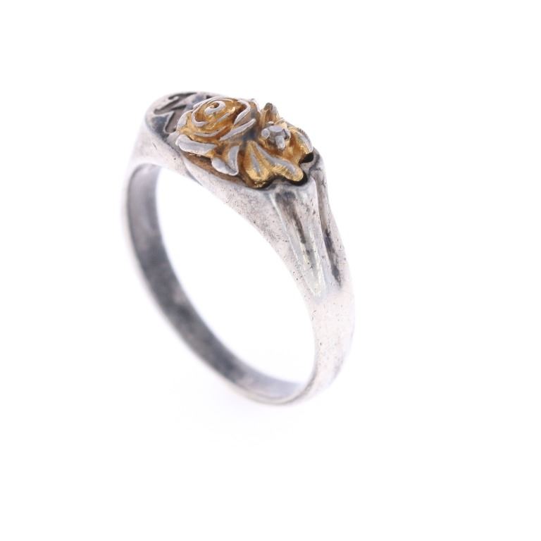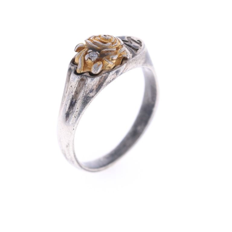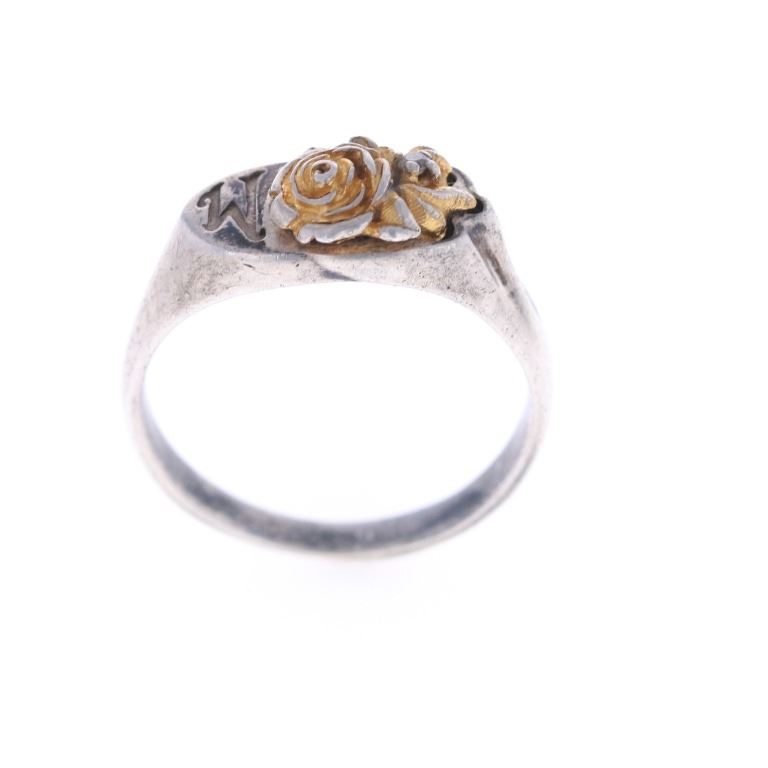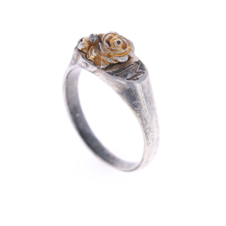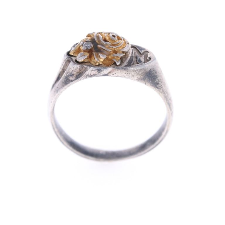 Offered in this lot is a C.1950's Keepsake Sterling Silver, gold rose, diamond and initial ring. This ring is marked Keepsake SS on the inside. The face of the ring shows a gold colored rose with a diamond set next to the rose on one side and the initial "M" on the other side. The diamond was tested with "presidium" tester. The ring shows wear for its age. The ring is size U.S. 10 1/4 and weighs 7.4grams.
