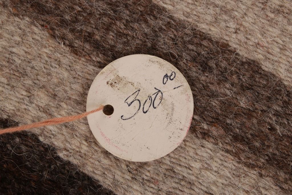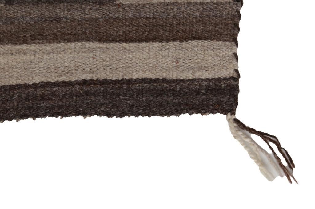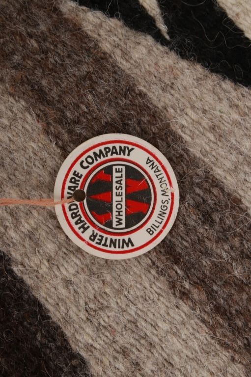 The lot features a circa 1950's tightly hand woven fine wool rug in the rare Crystal Eye Dazzler pattern from a Navajo weaver and accompanied by an early Billings, Montana hardware tag. The tag is from Winter Hardware Company of Billings, Montana which was incorporated in 1910 by H.H. Winter and W.E. Ryniker as the Ryniker-Winter Hardware Company. The company had a complete loss to thier building due to fire in 1918 but rebuilt and served Billings into the 1960's. The rug shows hand spun and dyed fine churro wool rug having a tight weave with intricate detail in the classic Old Crystal Eye Dazzler pattern. The Old Crystal Trading Post was first established in 1894 on the Navajo Reservation. In 1896 J.B. Moore purchased and renamed the trading post to Crystal and created a mail order catalog, first sent in 1903 and 1911. The rug is in good condition being well kept with no major damages apparent and no visible bleeding. Tightly woven showing an approximate knots per square inch of 119 (17 by 7). The back of the vintage tag is handwritten $300.00. Measures overall 72" by 50" with the fringe / tassels and 60" by 37.5" without.