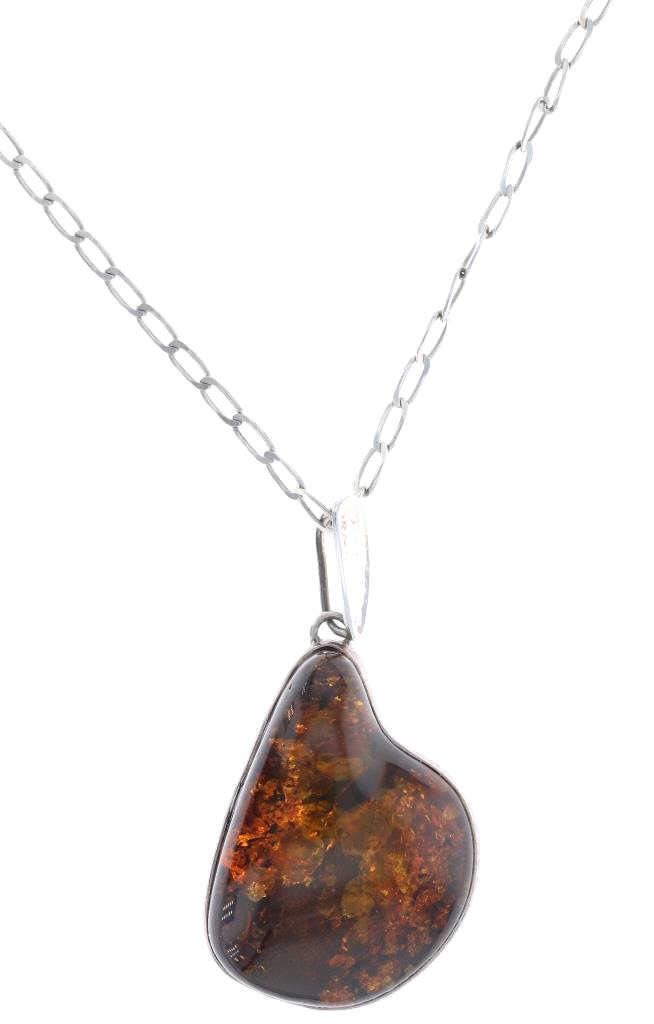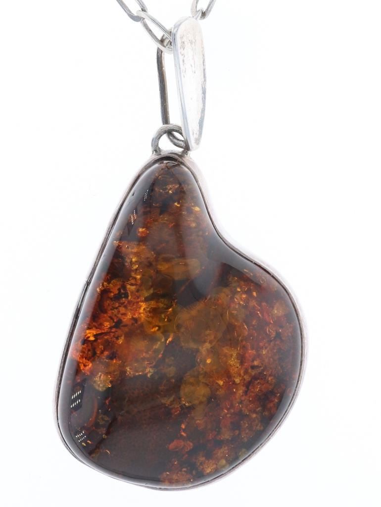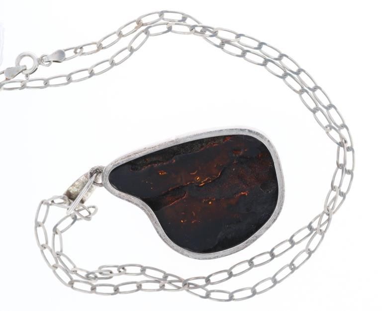 The lot features a mid-century modern sterling silver marked chain necklace with a Mid-Century Modern pendant having a large Amber nugget. The chain is marked sterling and has an open link style. The amber nugget is framed with a silver band. The amber has wonderful transparency with bubbles called "Bony Amber". The stone measures 1 5/8" x 1 3/8" and the chain measures 20" open. This necklace is in good condition.
