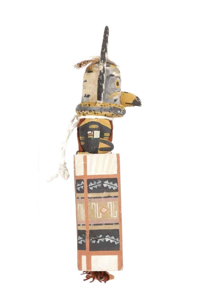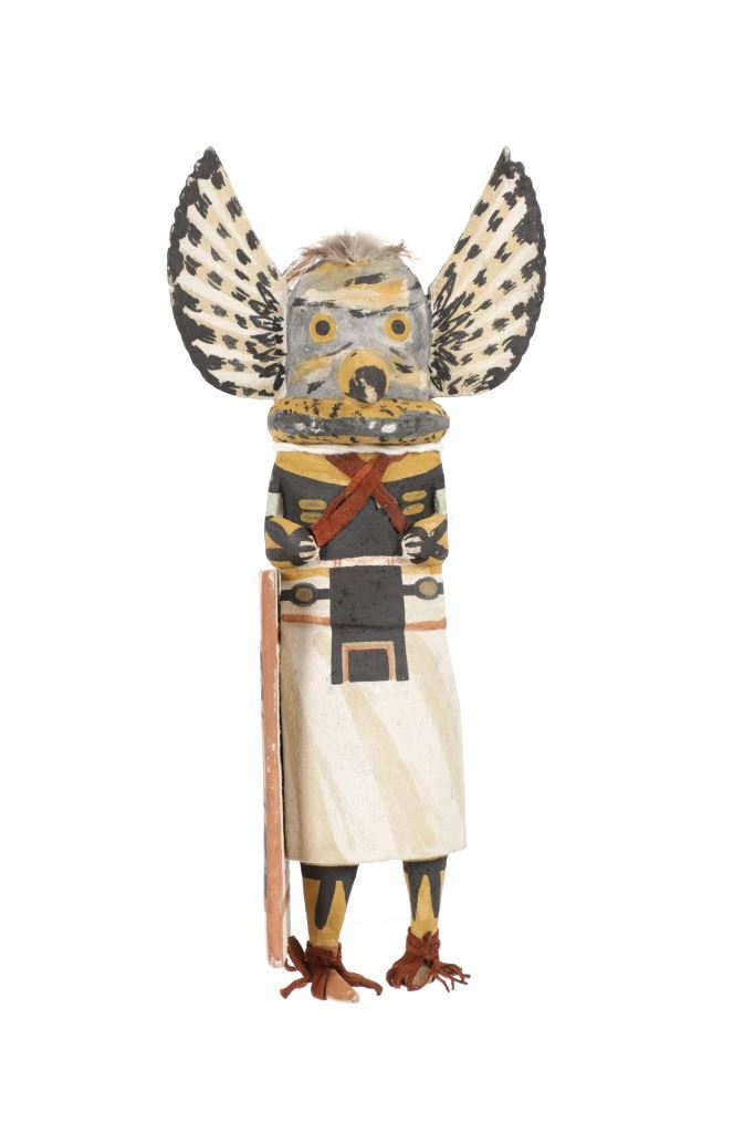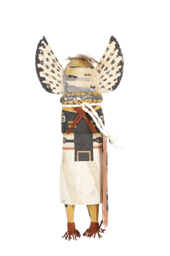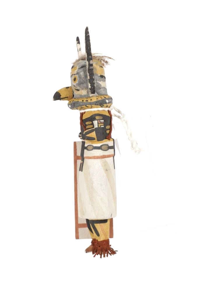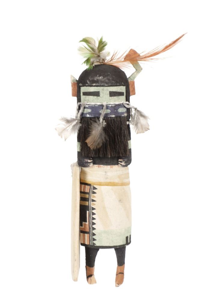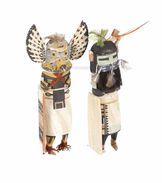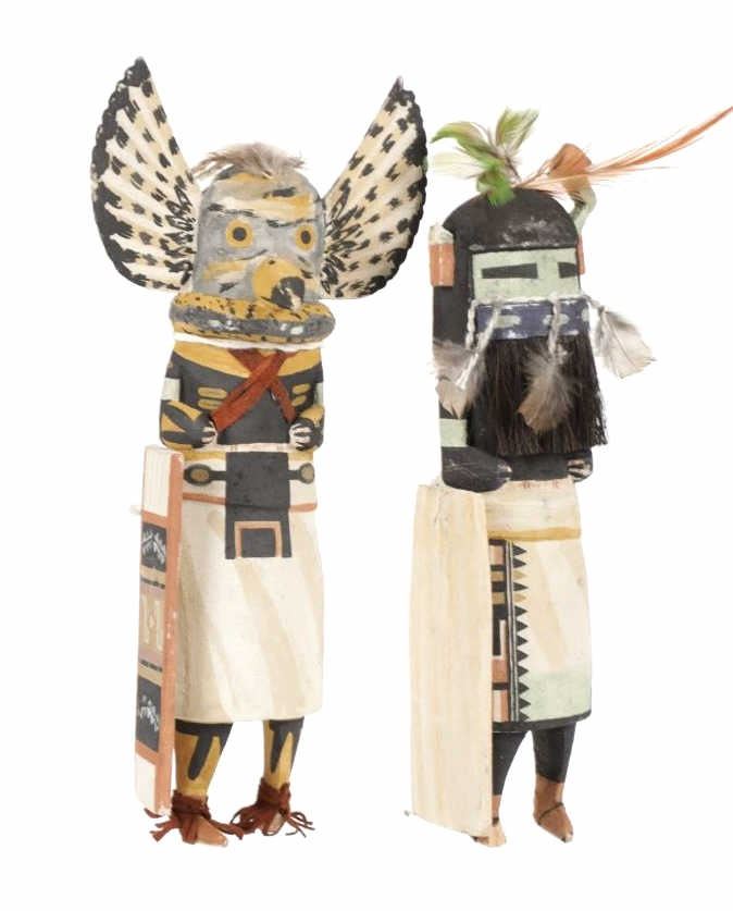Featured in this lot is this polychrome Kachina dolls from Hopi Pueblo artist RB Walthall circa 1960's. There are two Kachina dolls in this collection. The first shows a wonderfully and professionally crafted softwood construction that shows a face covering with horse hair and shows a shield at its right side of the Kachina and shows polychrome coloration of black, light green and cream, with red tones. The second is an eagle head Kachina doll that shows a feathered head that shows a polychrome coloration of gold, grey, black, tones of red, and striped cream and light grey skirt. The second Kachina shows a shield attached to the right hand side of the doll. The condition of this pair of wooden Kachina dolls is fair to good with the toes of one of the the feet on each of the dolls but otherwise shows fair to good overall condition. The measurements of these Kachina dolls is 10 1/4" x 3" x 2" and 10 3/4" x 5" x 3".