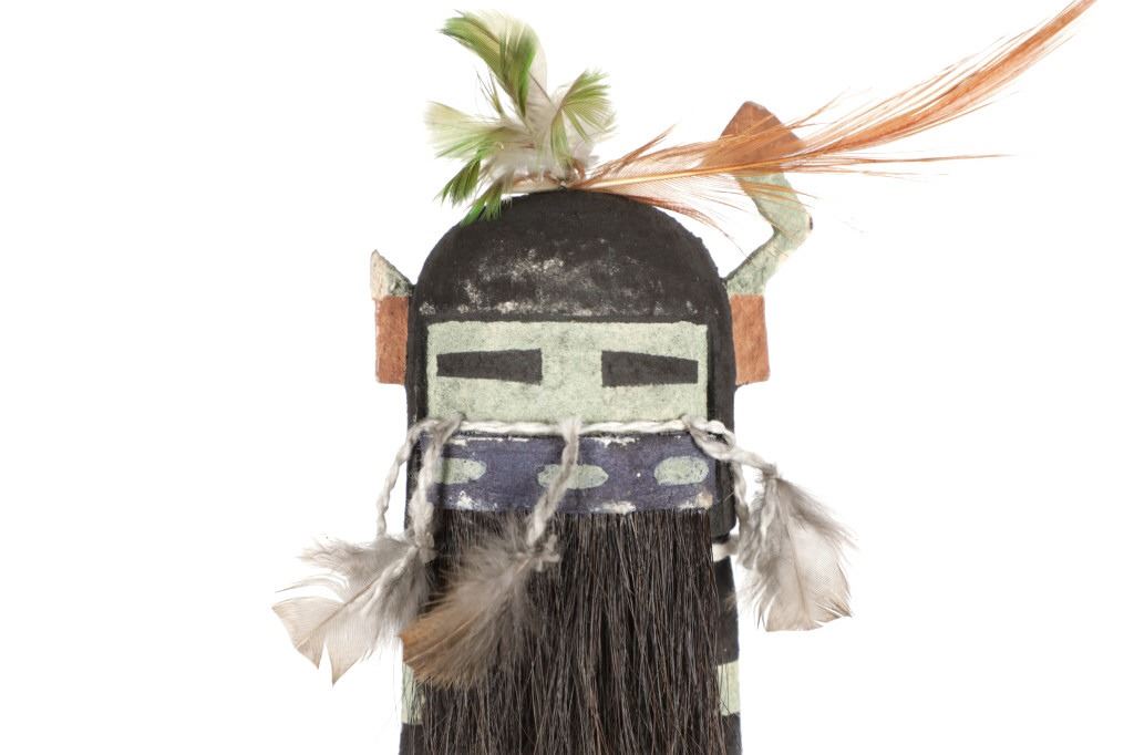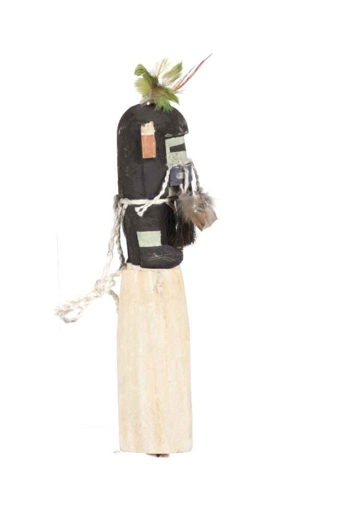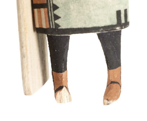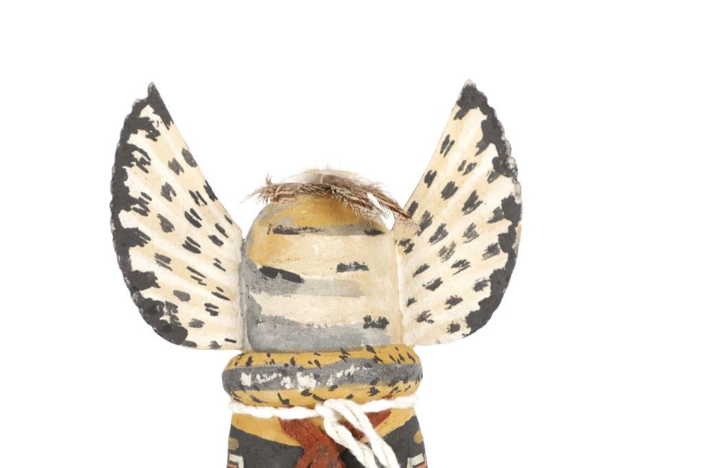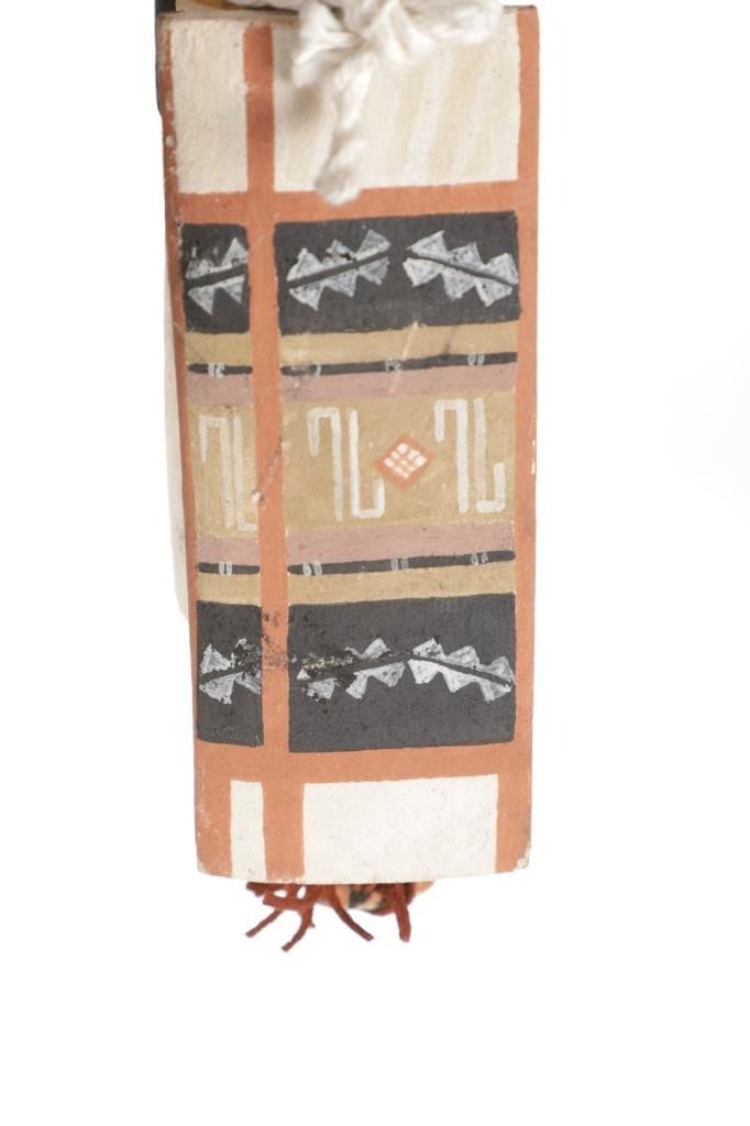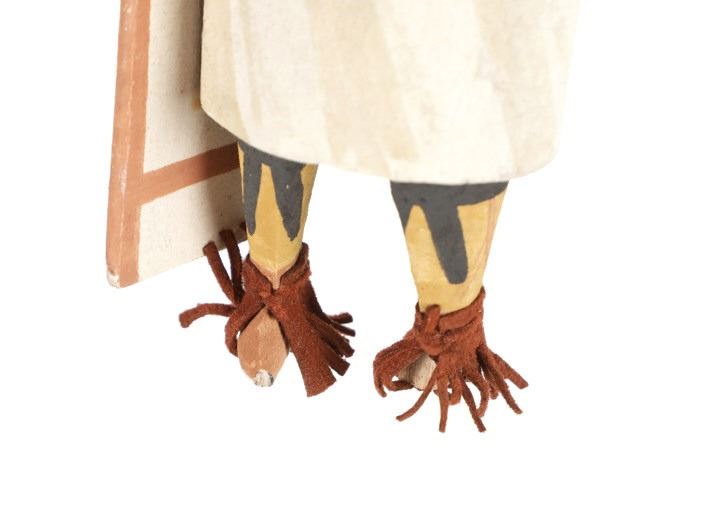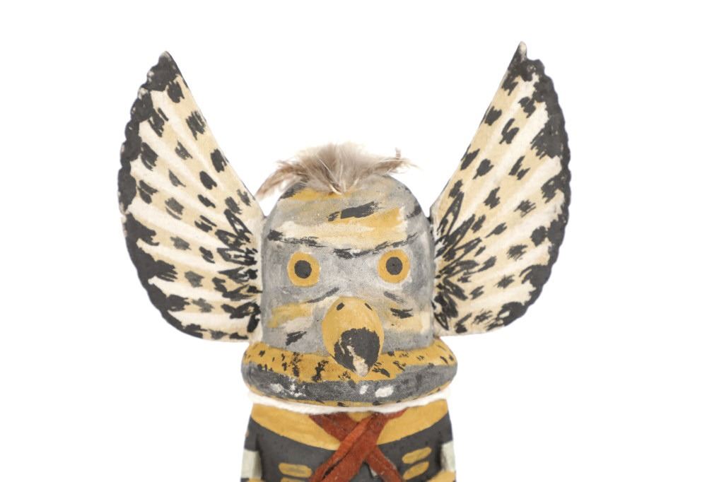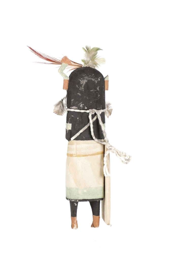 Featured in this lot is this polychrome Kachina dolls from Hopi Pueblo artist RB Walthall circa 1960's. There are two Kachina dolls in this collection. The first shows a wonderfully and professionally crafted softwood construction that shows a face covering with horse hair and shows a shield at its right side of the Kachina and shows polychrome coloration of black, light green and cream, with red tones. The second is an eagle head Kachina doll that shows a feathered head that shows a polychrome coloration of gold, grey, black, tones of red, and striped cream and light grey skirt. The second Kachina shows a shield attached to the right hand side of the doll. The condition of this pair of wooden Kachina dolls is fair to good with the toes of one of the the feet on each of the dolls but otherwise shows fair to good overall condition. The measurements of these Kachina dolls is 10 1/4" x 3" x 2" and 10 3/4" x 5" x 3".