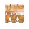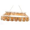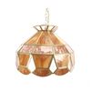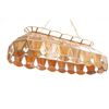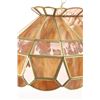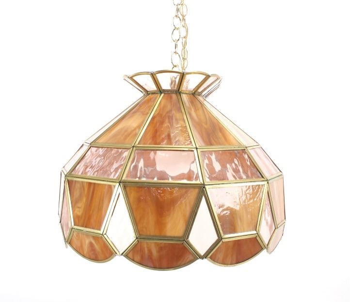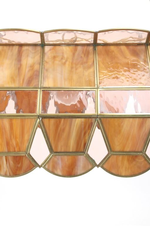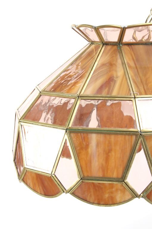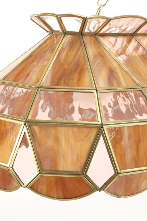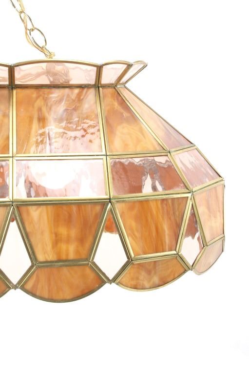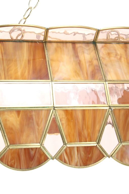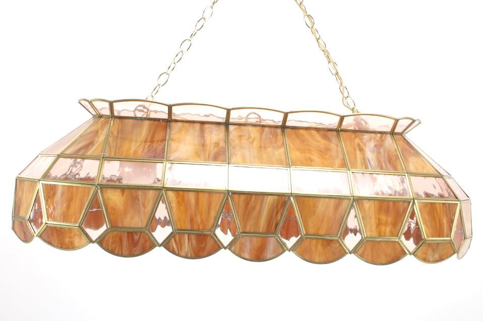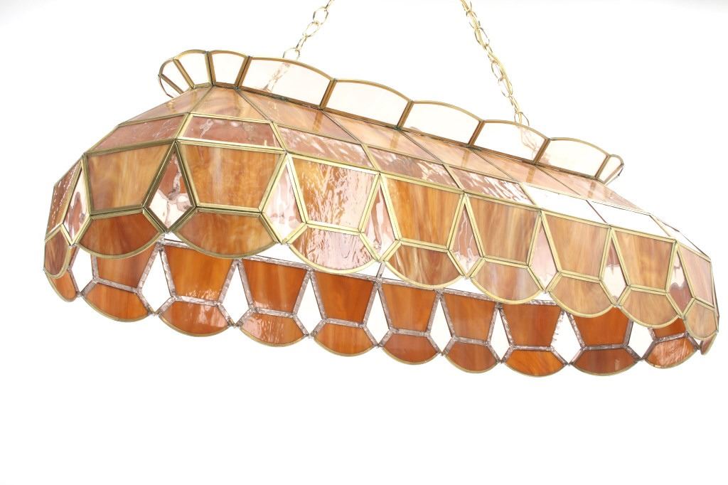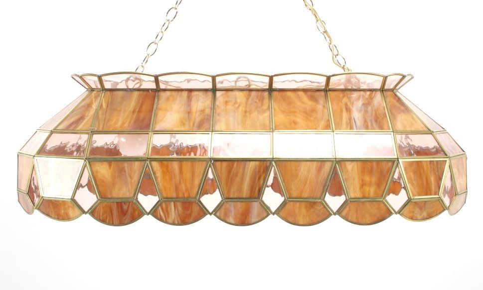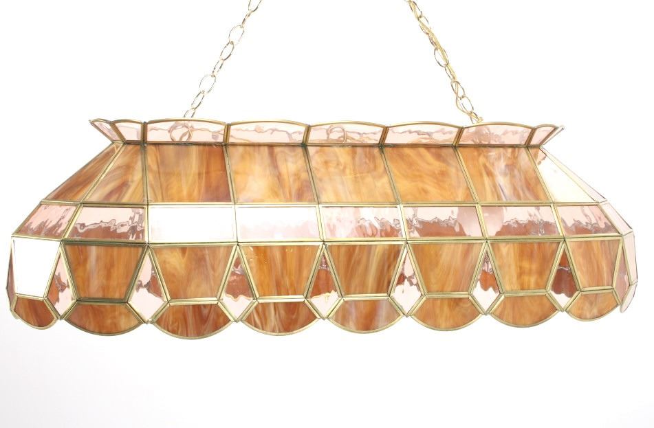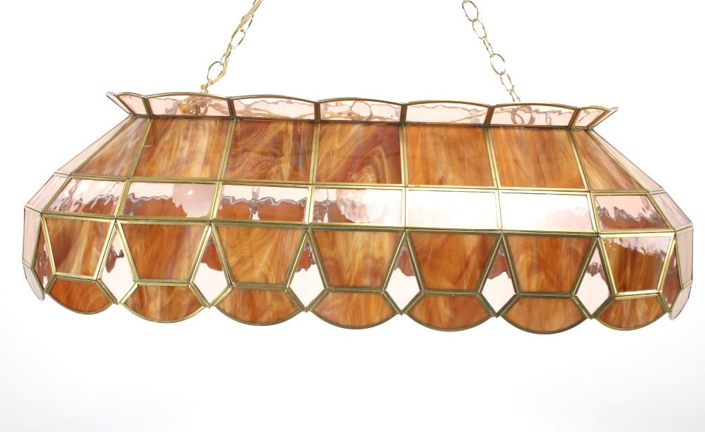 For your consideration in this lot is offered a C.1960 stained glass "pool table" light. This stained glass light is done is an amber "wood grain" and clear pattern. The lamp has a scalloped top and prism and scalloped bottom. There are three fixtures for bulbs that appear modern. The glass panels are held with brass edging, and the lead to hold the panels together is on the inside. Their are two brass chains 18" long for the light to hang from. The light is 38" long and 15 1/2" wide.