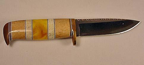 C. 1970'S NOLEN HANDMADE HUNTING KNIFE - Nolan is Famous for Gorgeous Knives, but this one has an AMAZING Handle! Handle made of: Amber, Mastadon and Uzik, which is Petrified Walrus Penis Bone. Comes with Case. Approx. 9" long