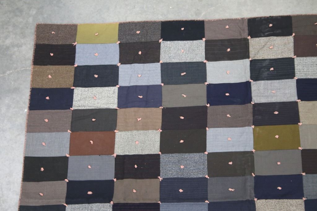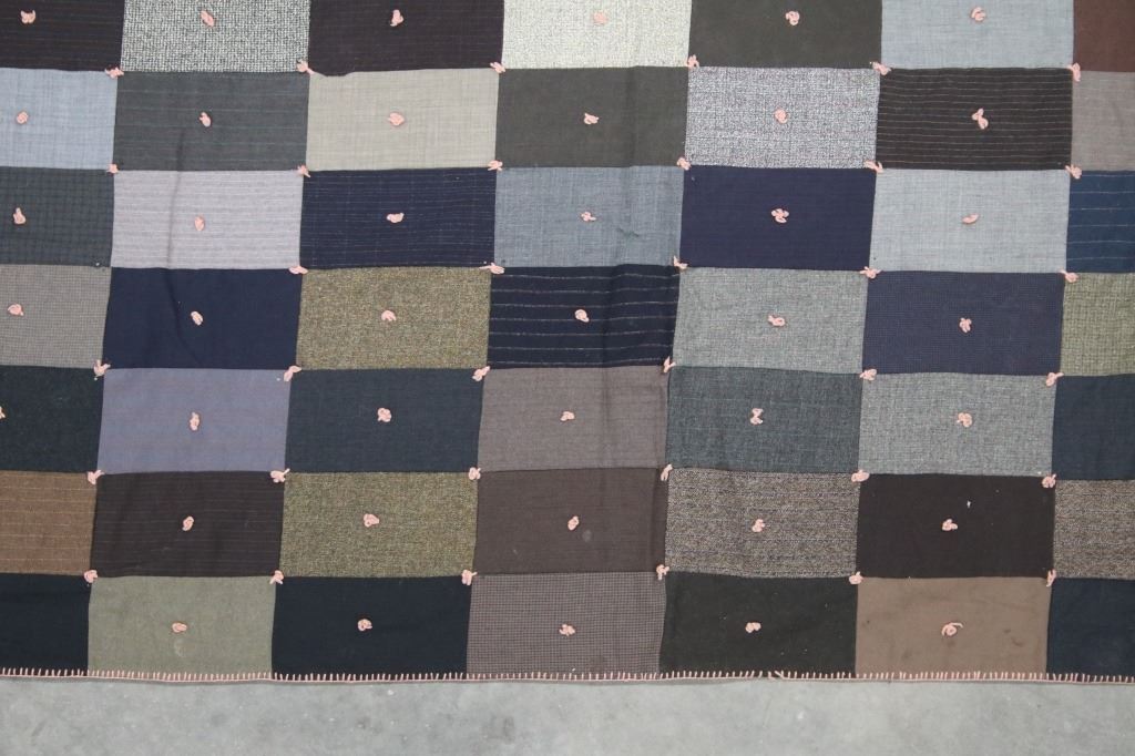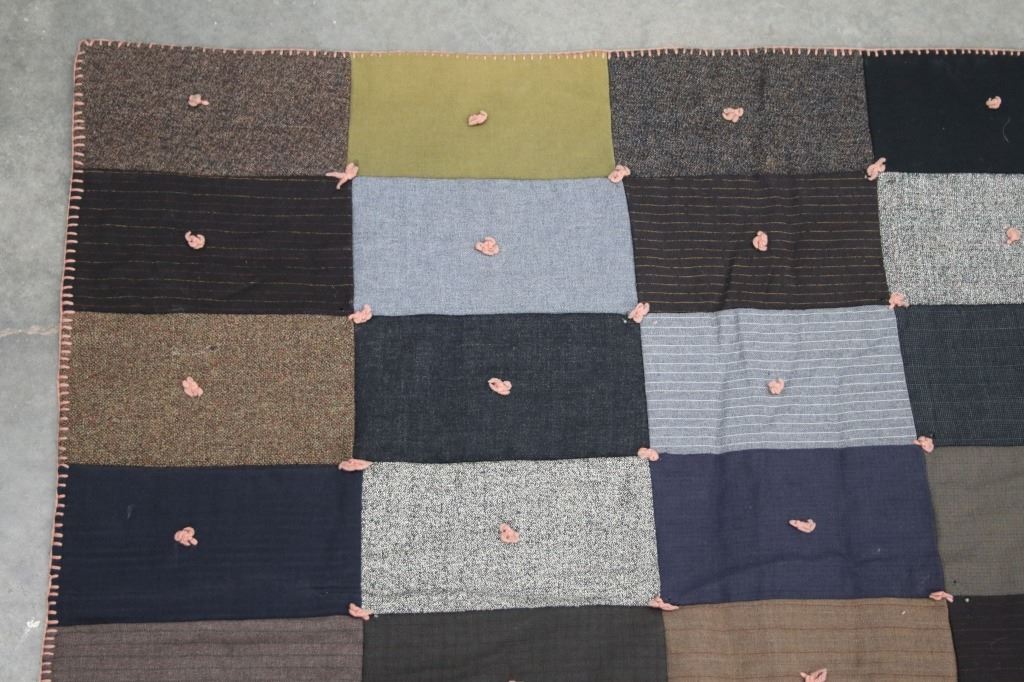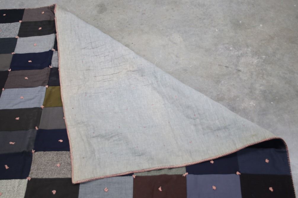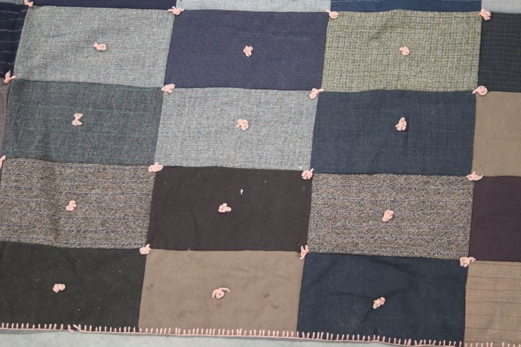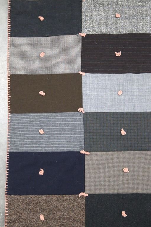 For your consideration in this lot is a c. 1970's large patchwork quilt. This quilt is made of 8" x 4" "patches" of polyester fabric stitched together to make the top. The back of the quilt is a solid grey cotton. Around the edge of the quilt is "blanket stitched" with pink yarn. The Patchwork top is "quilted" to the batting and backing with yarn "ties" of the same pink yarn. The quilt is in structurally good condition with no obvious signs of damage. The quilt measures 70" x 80".