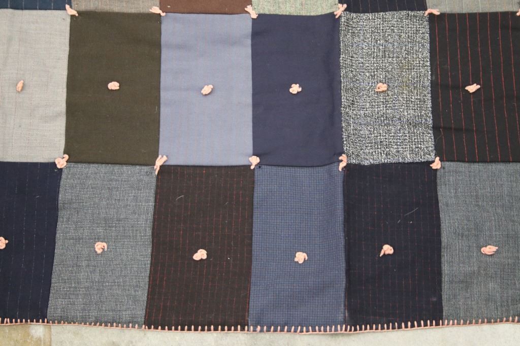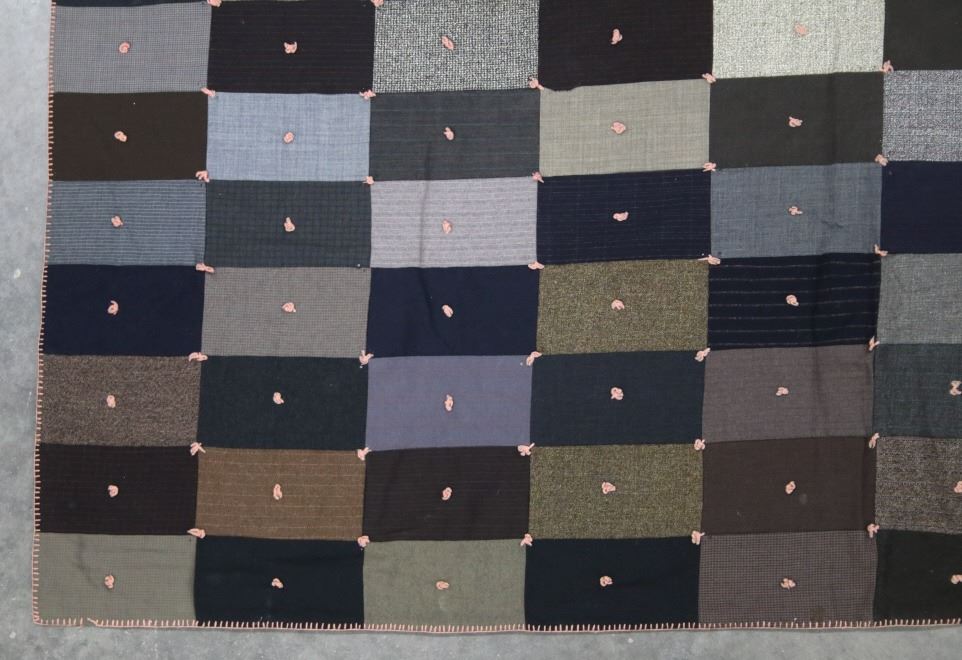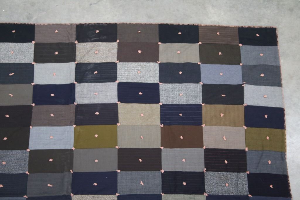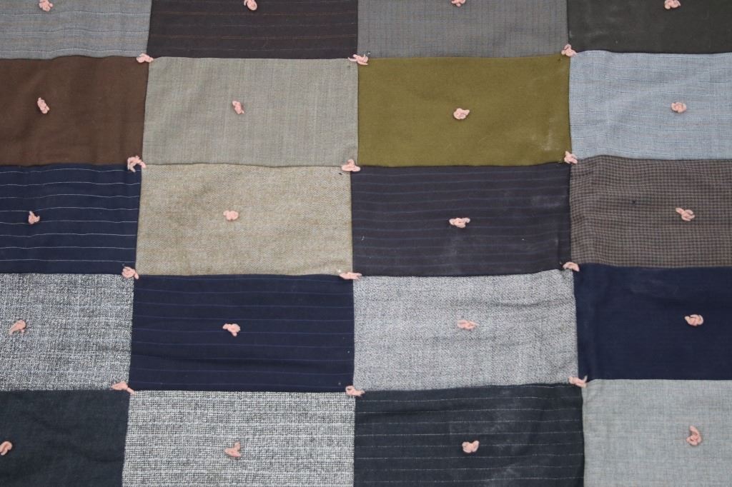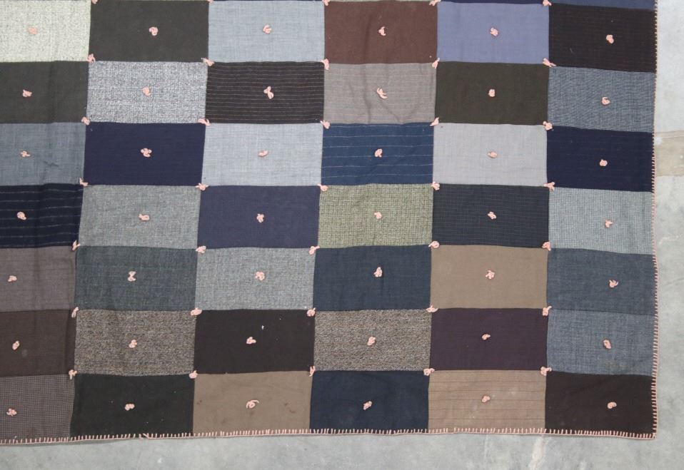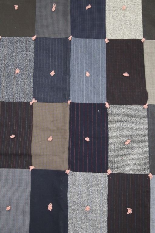 For your consideration in this lot is a c. 1970's large patchwork quilt. This quilt is made of 8" x 4" "patches" of polyester fabric stitched together to make the top. The back of the quilt is a solid grey cotton. Around the edge of the quilt is "blanket stitched" with pink yarn. The Patchwork top is "quilted" to the batting and backing with yarn "ties" of the same pink yarn. The quilt is in structurally good condition with no obvious signs of damage. The quilt measures 70" x 80".