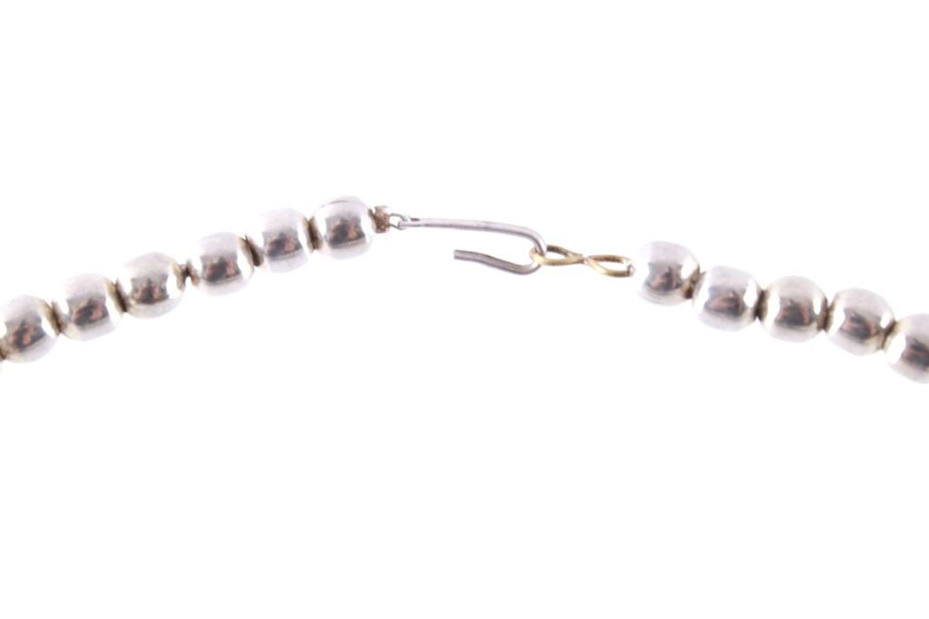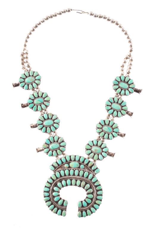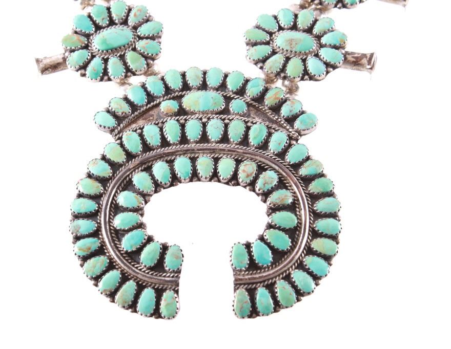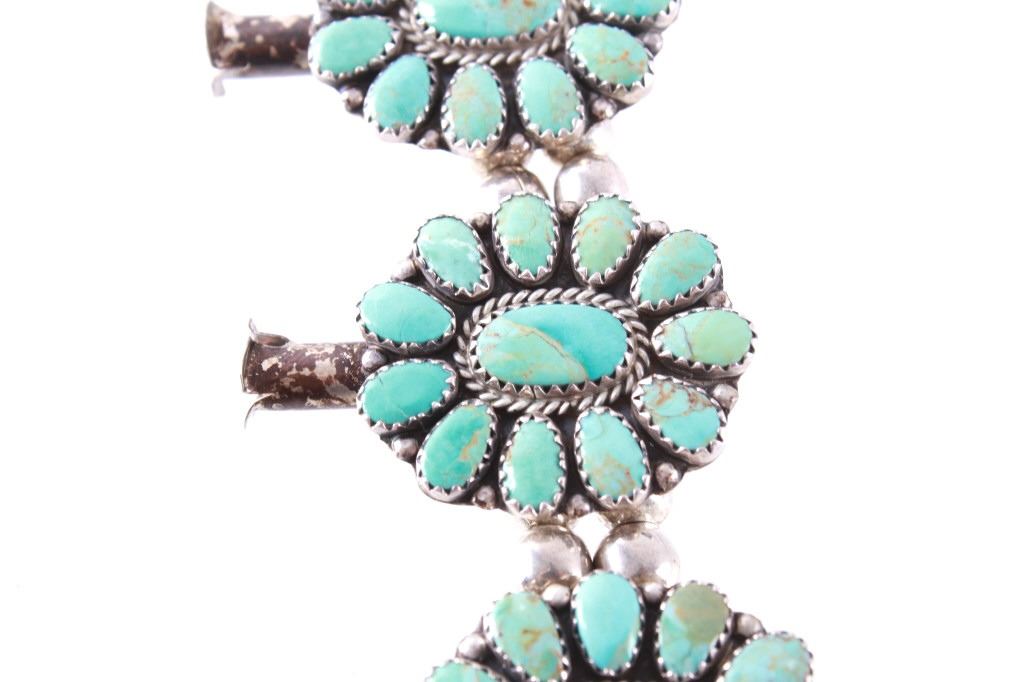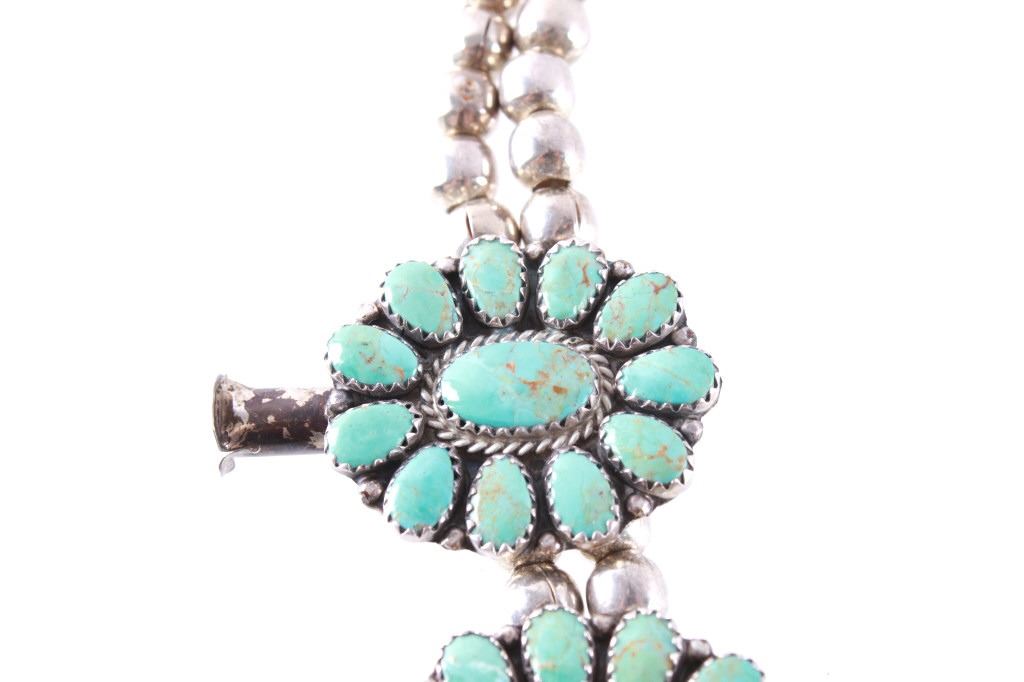 Featured in this lot is this sterling silver and cripple creek turquoise squash blossom necklace circa 1970's from Navajo silversmith Larry Vi Fowler. The necklace features a wonderfully and professionally crafted sterling silver construction that shows eight blossoms adorning the double strand portion of the necklace chain that shows sterling silver beads strong on the strand, each blossom features a total of twelve pear and oval cut cripple creek turquoise cabochon set into the face of the blossoms. The central naga pendant shows wonderful quality with 62 total pear and oval cut cripple creek turquoise cabochon; the turquoise set into this piece shows a beautiful luster and shows streaks of mineral spider webs and shows colors ranging from greenish blue to deep blue. The necklace features a signature from Larry Vi Fowler and includes a 'sterling' stamp near the signature. The condition of this squash blossom necklace is good with a slight patina due to age but otherwise in good overall condition. The measurements from clasp to clasp are 20 1/2" and the central naga pendant measures 3" x 3" x 1/8". The collective weight of this necklace is 138.4g. The piece is nicely marked as shown.