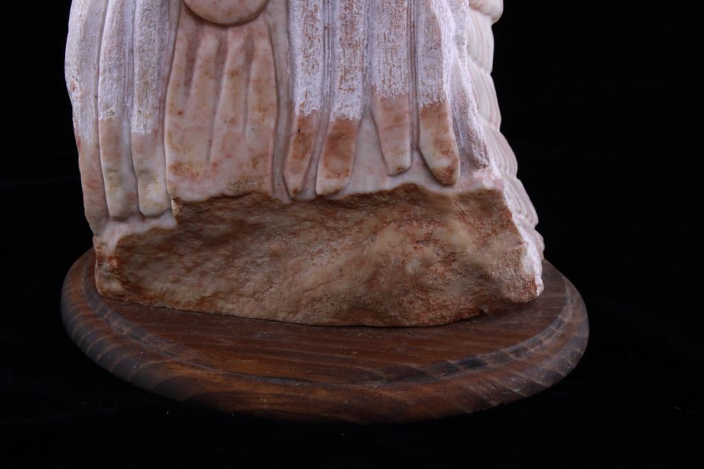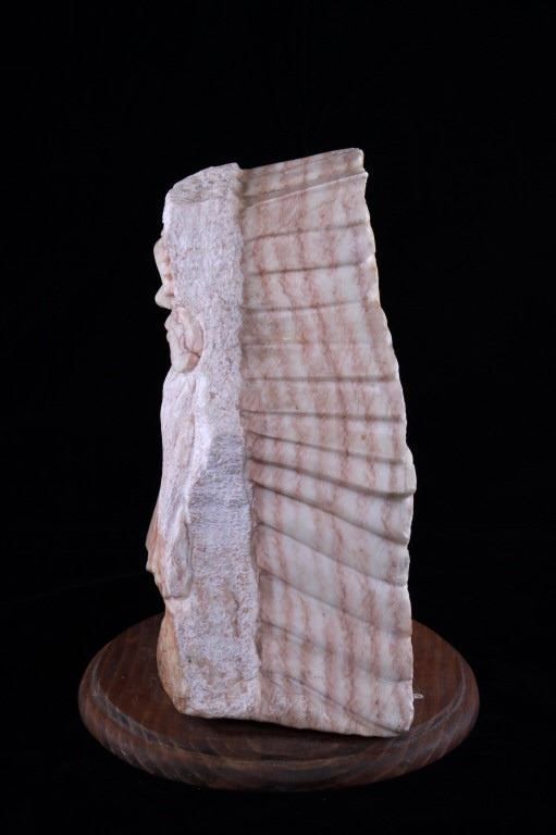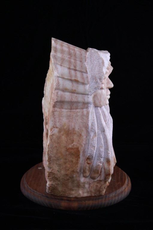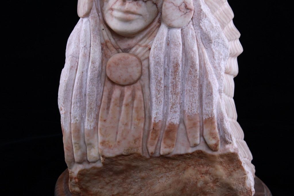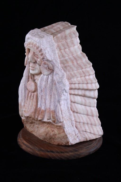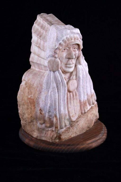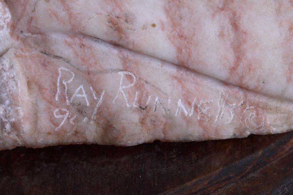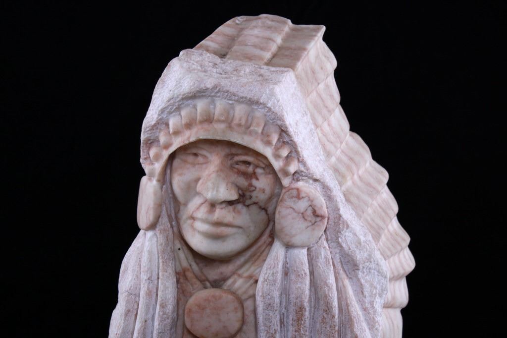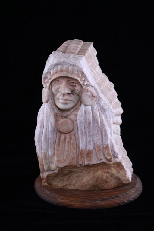 Featured in this lot is a carved alabaster Indian bust from Ray Runners, circa 1994. The sculpture is wonderfully and professionally crafted alabaster including hardwood construction showing a Native American man in a headdress with a trade cloth around his neck with a concho clasp in the man's center. The sculpture is marked as follows: Ray Runners - 94. The condition of this carved alabaster bust is good with no obvious signs of damage and shows good overall condition. The measurements of this carved alabaster bust is 12" x 8" x 8".*
