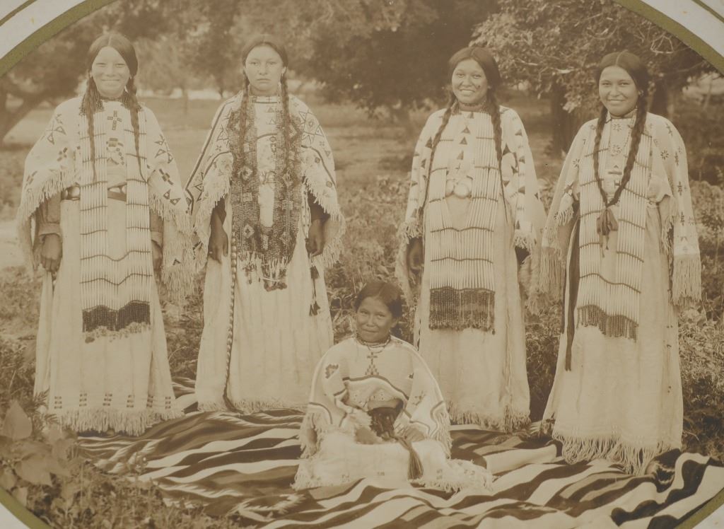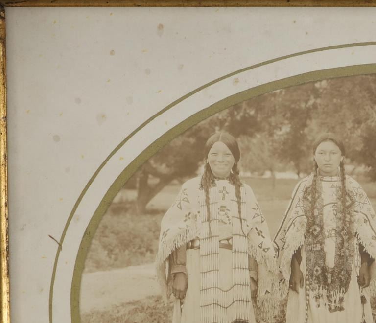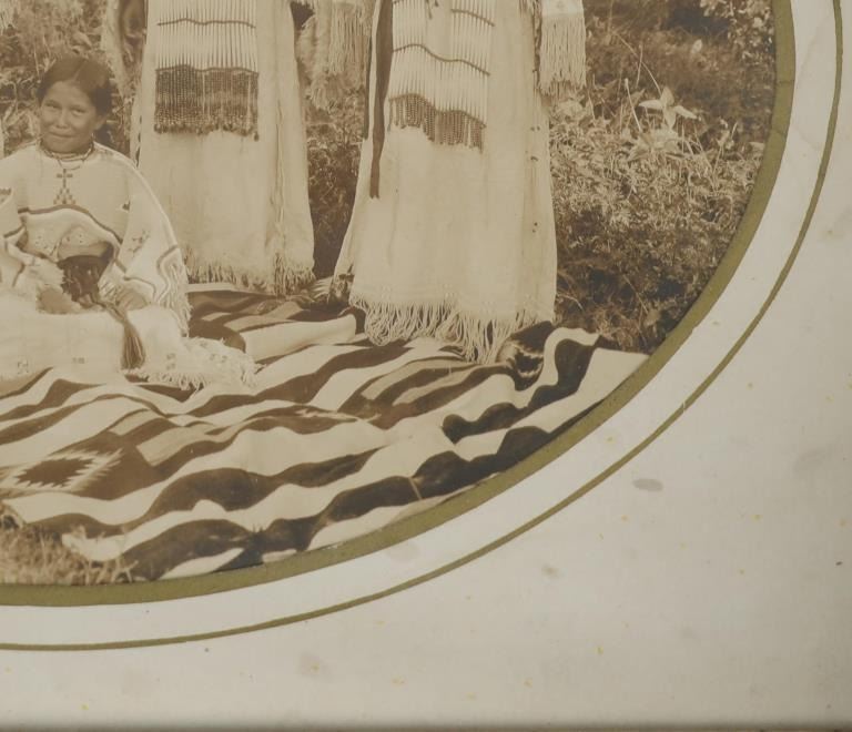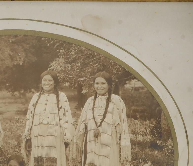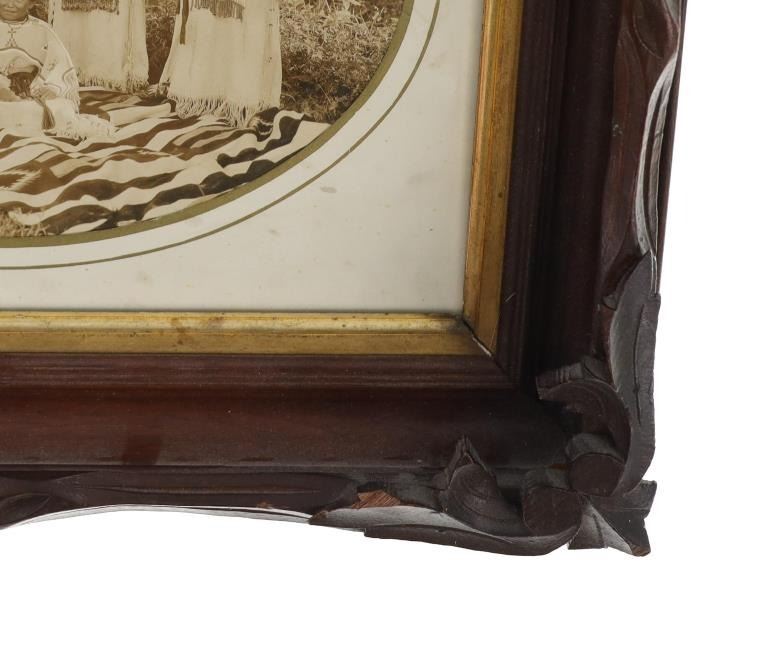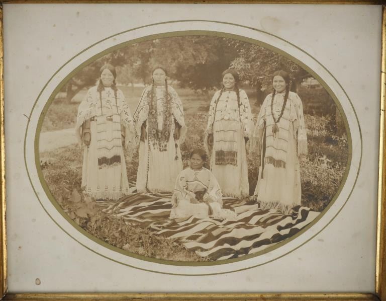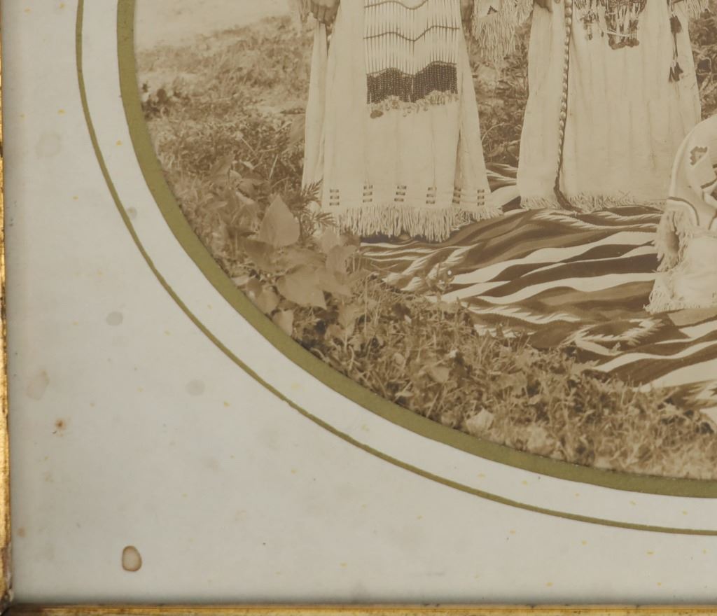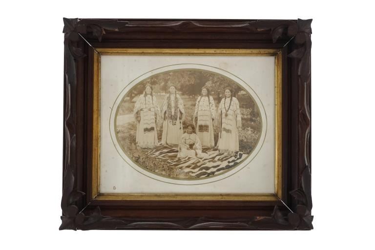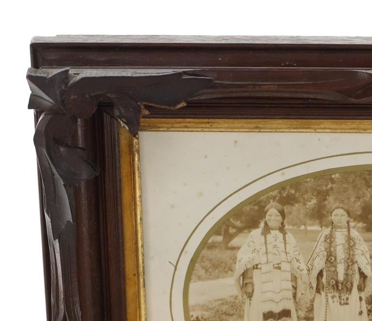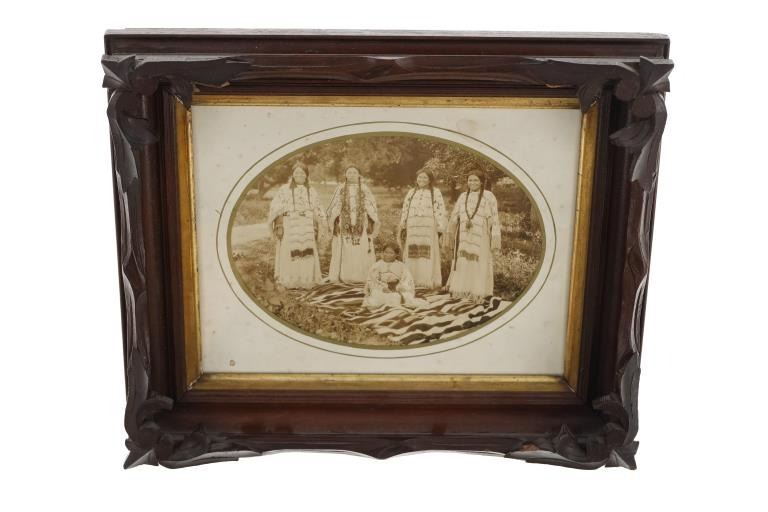 Featured in this lot is a 19th century original Northern Plains Indians women photograph. The photograph features a wonderfully and professionally crafted black and white photograph construction that shows a cardstock border with a carved hardwood and stained frame that shows multiple levels. The photograph shows five total young Northern Plains Indian women posing in ceremonial Indian tanned hide garments around a trade blanket on the ground with the older of the five around a sitting young woman. This photograph isn't visibly marked. The condition of this original photograph shows well preserved stature with some wear and tarnishing marks to the photograph but shows very slight wear to the frame along with a chip to the bottom right hand corner of the photograph. The measurements of this framed photograph are 11 5/8" x 13".*