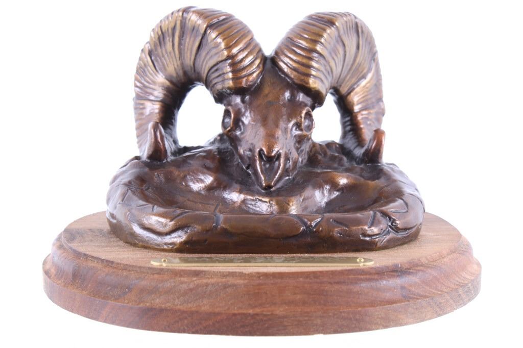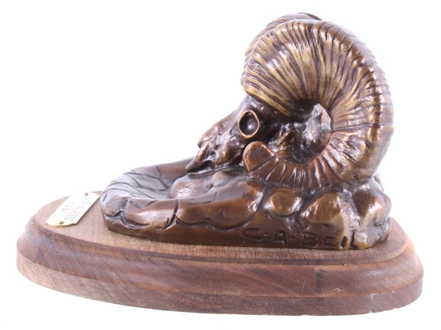 For your consideration is this C.A. Beil "Banff Bighorn" bronze sculpture. Charles A. Beil, was a Canadian sculptor best known for his sculptures of cowboys and the plain Indians of the early West. He was a protégé and friend of artist Charles Marion Russell. He was born in Germany and left at the age of 11. He worked for some time in South America before making his way to North America, where he discovered his love of the Wild West and the Frontier. It was Russell who encouraged him to start creating art, and inspired him to start working with pencil and clay. Beil moved to Banff, Alberta in the 1930s, where he began to take an interest in casting clay into bronze. Beil created the trophies for the Calgary Stampede for over 20 years. This bronze sculpture shows a European style rams head and features a brass name plate with the title "Banff Bighorn" and the artists name. The bronze is signed by the artist and numbered 6/60. The measurements of this bronze 4 1/2" x 6 1/2" x 7".
