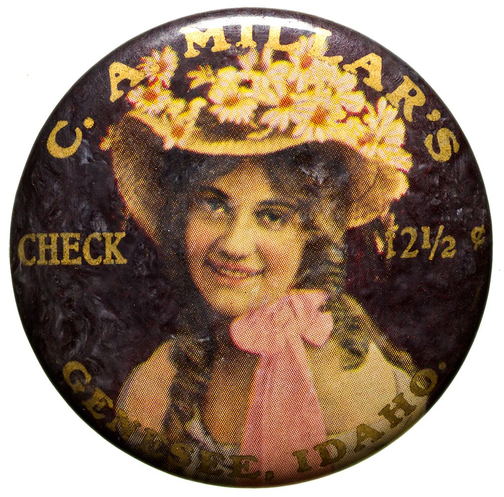 c1910 Obverse: C.A. Millar`s/ Check/ 12.5 cents/ Genesee, Idaho. Reverse: Mirror. Lettering is in gold. A young lady in a white shirt, where the left side is falling off her shoulder with a big pink bow. She is wearing a large sun hat with sunflowers all around the top. The lady has light brown curly hair and a big smile. Dark brown background. The mirror has a diameter of 1.75". Image is slightly faded. Mirror has some small scratches. - HKA#65812
