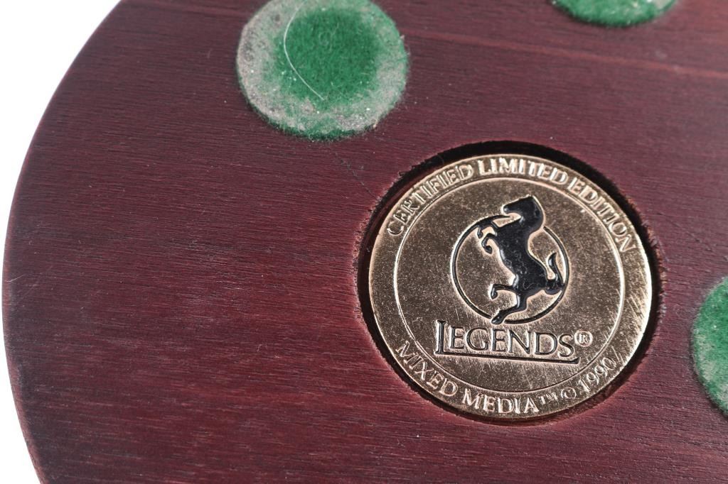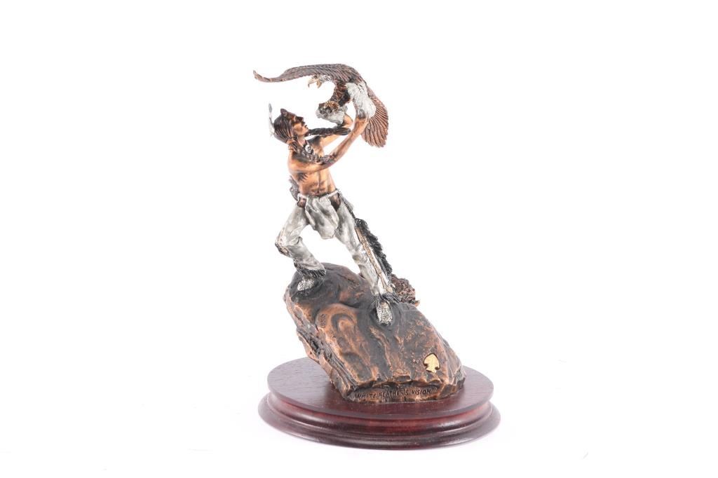Entitled "White Feather's Vision" dated 1987,1366/2500. From the Starlite Originals Legends sculptures.Every Legends sculpture is one of a kind and a distinct original. In addition, these sculptures have a unique look due to their innovation of mixed media, combining precious metals and hot-torched patinas. The combination of these fine metals and patinas creates a unique fine art sculpture with unmatched levels of detail. Pardell's work mostly revolves around the spirit behind the Native American lifestyle, capturing a world in motion with every piece he makes. Using materials like lucite and bronze, Pardell combines traditional and contemporary sculpting methods. Measures 9" tall by 6" wide. SHIPPING MUST BE ARRANGED BY BUYER.