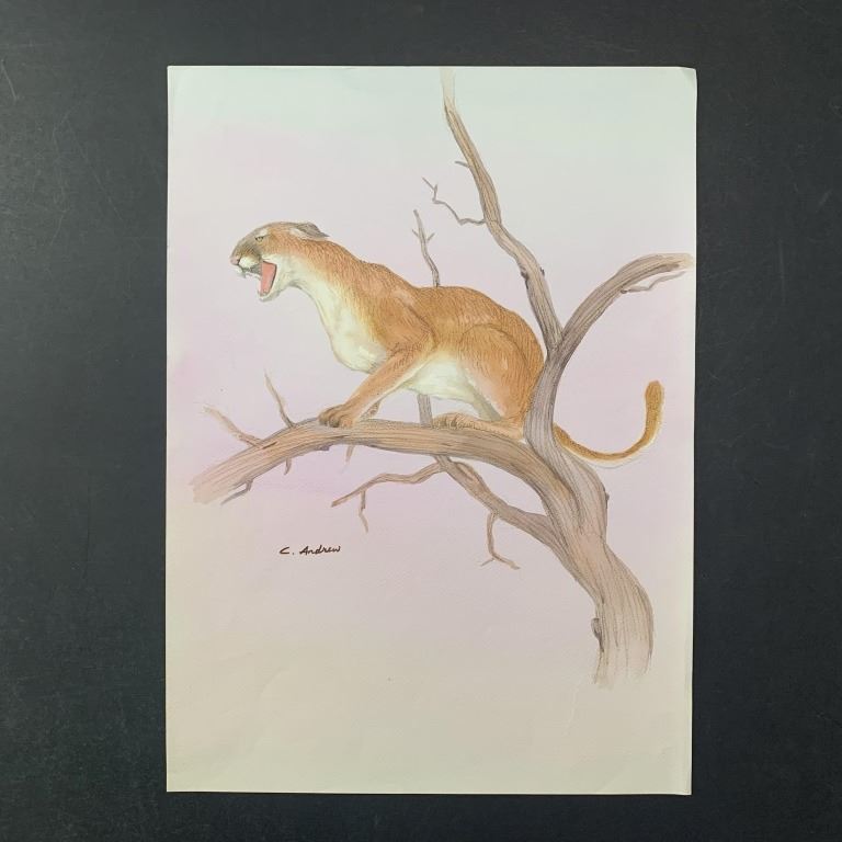 C. Andrew "Cougar Perched" original print. This piece is of a cougar, perched on a larger branch, done in a watercolour style. This piece in excellent condition.