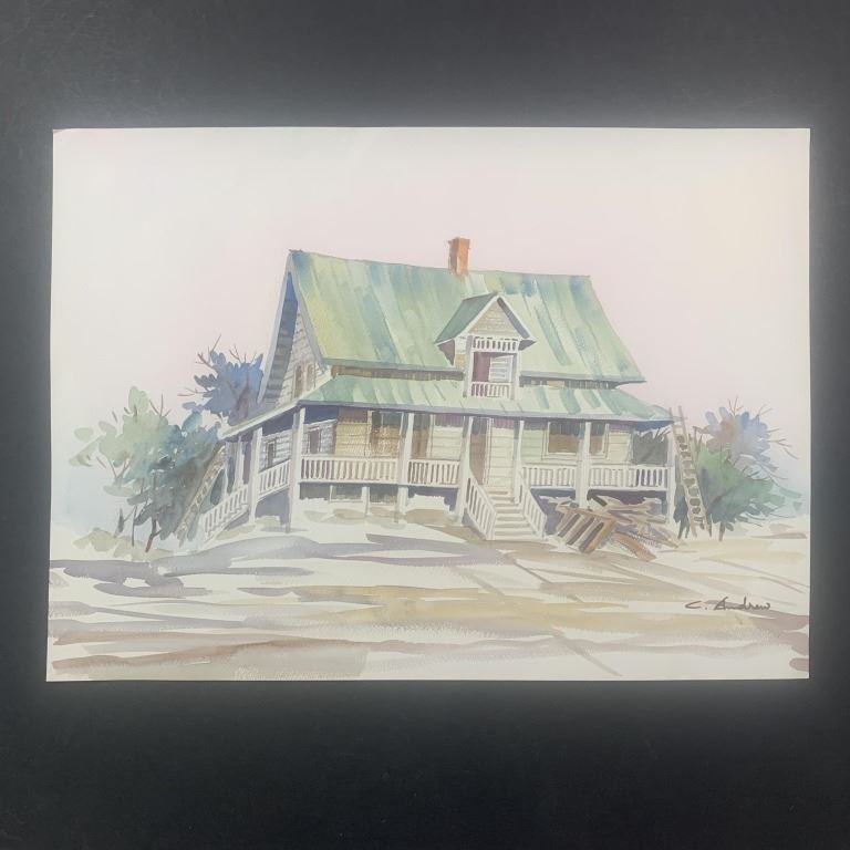 An original print by C. Andrew of a house with a green roof, done in a watercolour style. This piece is in excellent condition.