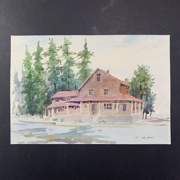 C. Andrew's "At The Water's Edge" original print. This piece is of a family home, at the edge of the water, with big beautiful green trees in the background. This has been done in a watercolour style. This piece is in very good condition, with a crease lower right.