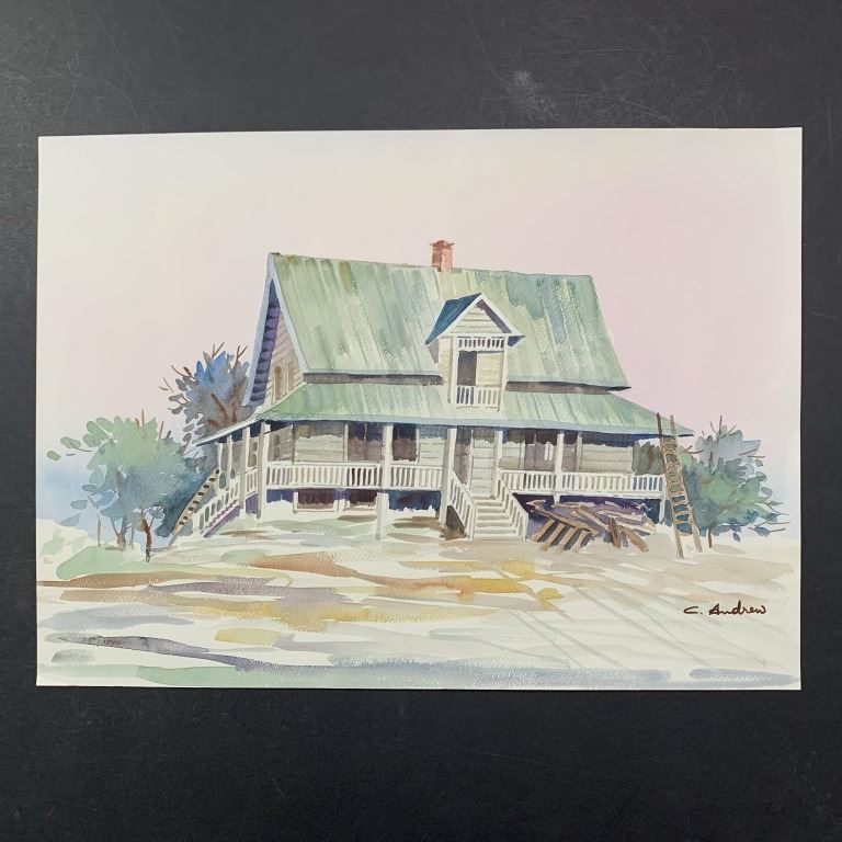 C. Andrew's "Cabin on the Hill" original print. This piece is of a family home, at the edge of the water, with big beautiful green trees in the background. This has been done in a watercolour style. This piece is in very good condition, with a crease lower right.