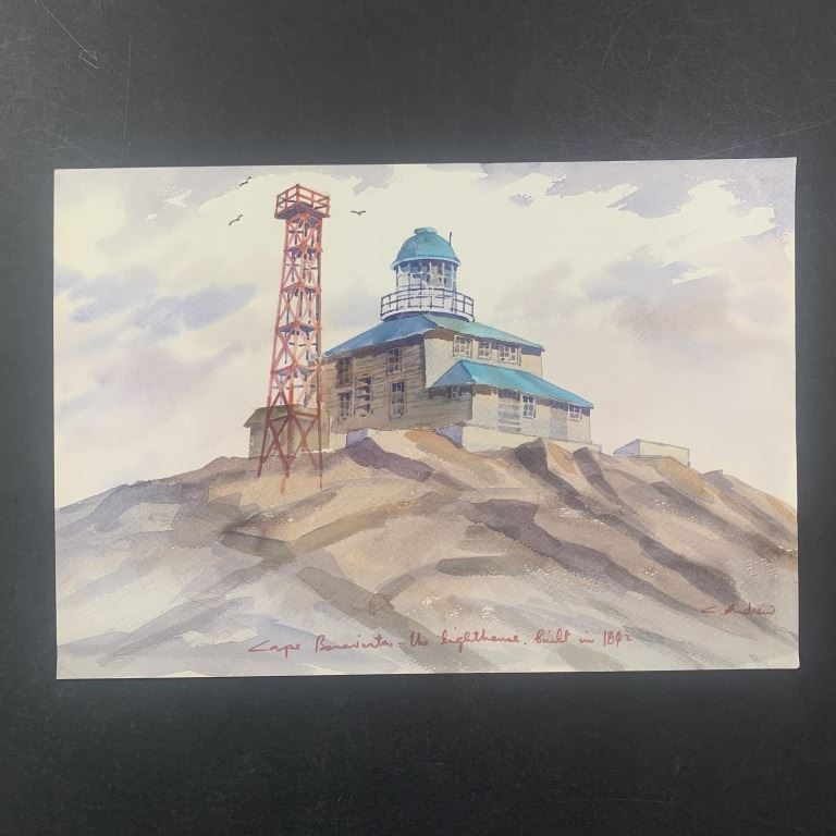 C. Andrew's "Cape Bonavista - Uno Lighthouse Built in 1842" original print. This piece is of a lighthouse at the top of a rock, with a few birds flying in the background, and done in a watercolour style. This piece is in excellent condition.