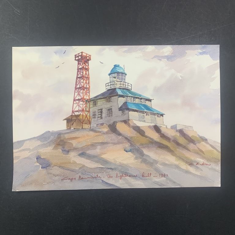 C. Andrew's "Cape Bonavista - Uno Lighthouse Built in 1842" original print. This piece is of a lighthouse at the top of a rock, with a few birds flying in the background, and done in a watercolour style. This piece is in excellent condition.