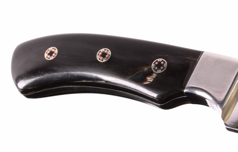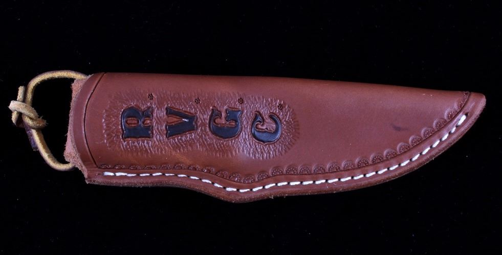 This is custom knife and leather scabbard made by C.B. Allinson of Sheridan, Montana. The knife is marked "C.B. Allinson Sheridan, MT" and features a buffalo horn handle. The leather scabbard is monogrammed "R.V.G.C.". The knife and scabbard are in good condition. The knife measures 7.75" with a 3" blade.