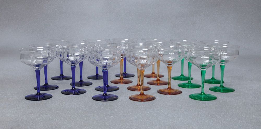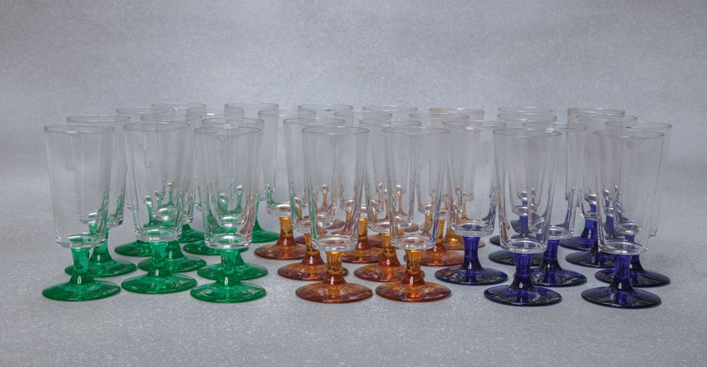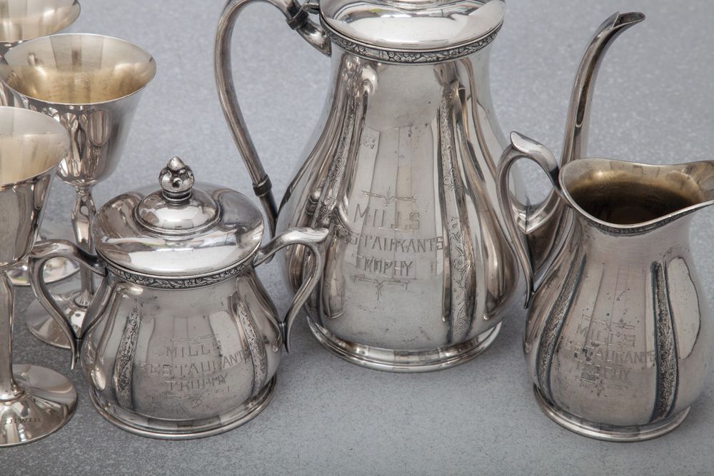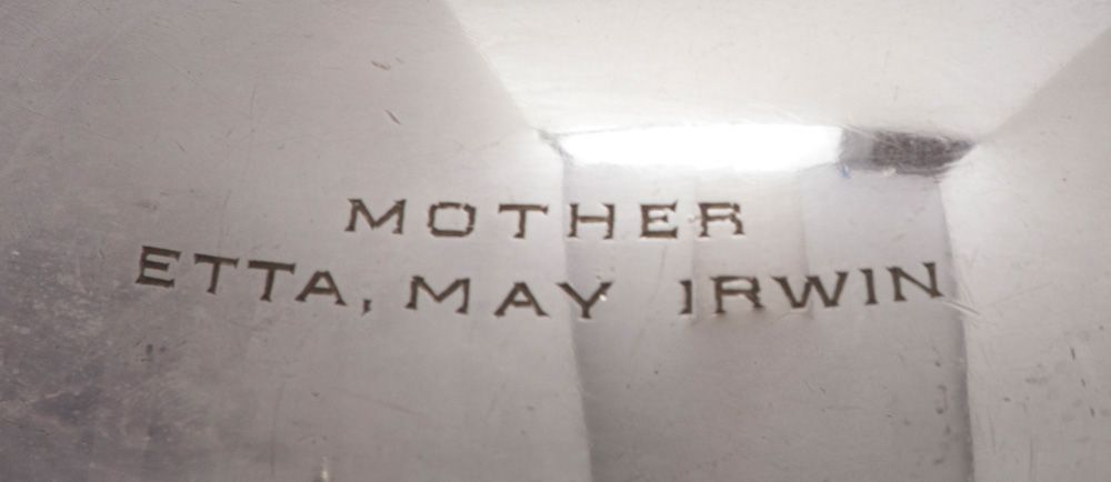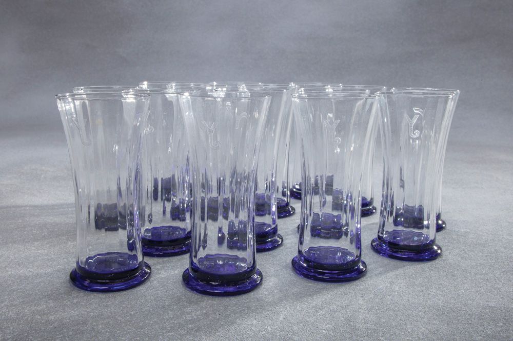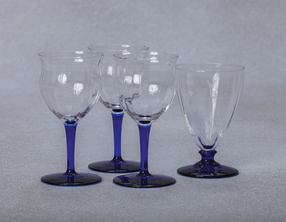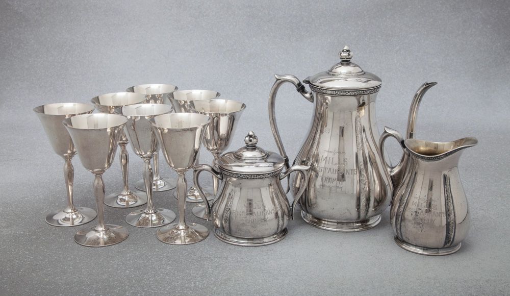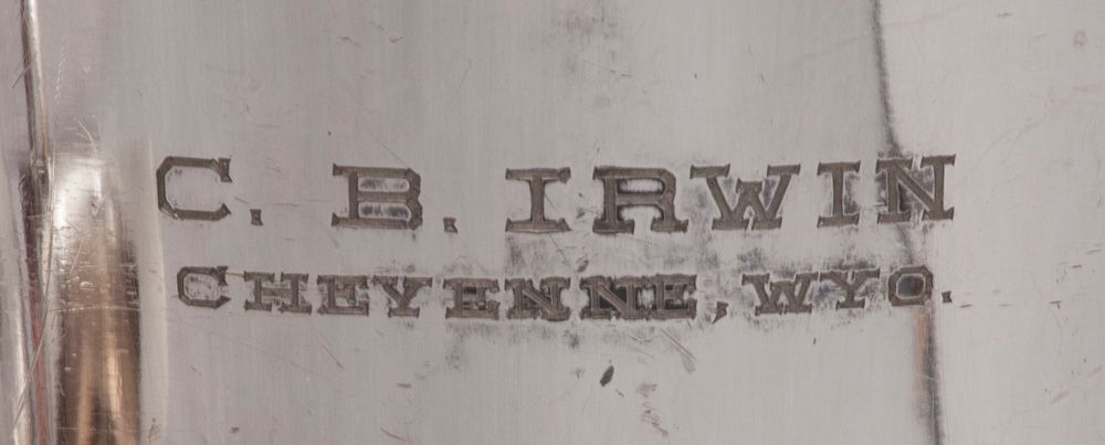 C. B. Irwin Y6 Brand Personalized Silverware, Stemware, Serving Pieces, Coffee Service and Miscellaneous Irwin Family Heirlooms. A collection of tableware and household items from the Y6 Ranch. Glasses include: 9 blue stemmed, 6 amber stemmed and 5 green stemmed champagne glasses, all etched with Y6 brand; 10 green, 10 amber and 14 blue cordial glasses with Y6 etching; 19 blue fluted water glasses, most with Y6 etching, and several miscellaneous glasses. Numerous pieces and place settings of silver flatware with Y6 brand engraved on the handles. Includes various serving pieces. Silver coffee serving set marked "Reed & Barton." 9 pieces includes 21 1/2" x 12 1/2" tray, 11 1/2" tall pot, inscribed "C. B. Irwin - Cheyenne, Wyo." with 3 sugar and creamer sets and a squat pot marked "Mother / Etta, May Irwin". 3-piece silver coffee set inscribed, "Mills Restaurants Trophy" The pot is 9 1/4" tall and all pieces are marked "Montclair / Oneida Ltd.". 8 "Homan Plate" stemware goblets, 5 3/4" tall with "C. B. Irwin" engraved on the bases. Not shown: 3 family quilts, 8 linen napkins with Y6 embroidered on the face. PROVENANCE: From the estate of C. B. Irwin.