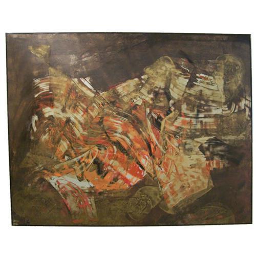 Wonderful signed painting by Celine Elce Barrette, Montreal, Canada. Large industrial abstract. Figural in industrial metallic paints on aluminum sheet. Listed in Davenport. Painting can be hung horizontally or vertically. Signed. Provenance available upon request.