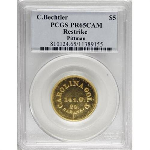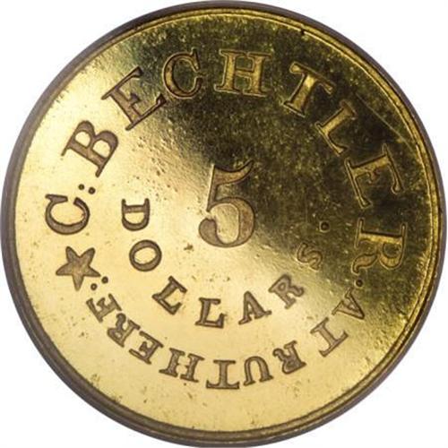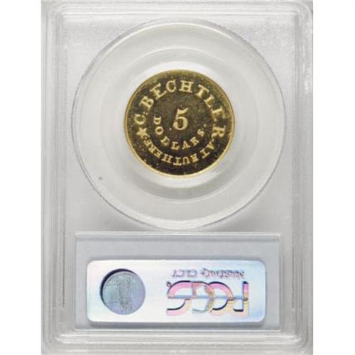 <B>C. Bechtler $5 Restrike PR65 PCGS.</B></I> K-31, High R.7. This is a muling of two different Bechtler five dollar dies. The die with BECHTLER, commonly known as the reverse die, was previously used to strike K-16 during Christopher Bechtler's day, circa 1834 to 1837. The die with the weight and fineness, typically known as the obverse die, helped strike K-29 during the 1842 to 1852 production era of Christopher's son, August Bechtler.<BR>Professional coin dealer Henry Chapman encountered three Bechtler five dollar dies circa 1908, one obverse and two reverses. He struck a very limited number of proof restrikes, listed as K-30 and K-31 in Kagin's standard reference. K-30 and K-31 share the same obverse but have different reverses. The obverse of the present K-31 lot has less rust than the previous lot (a K-30), which indicates the obverse die was further polished prior to the production of K-31.<BR>This exquisite Gem has flashy fields, and is smooth aside from a whisper of mint-made die rust. The strike is unimprovable. A vertical die crack, diagnostic for the variety, is present beneath the second A in CARATS. Heritage last auctioned an example of K-31 in 1996. Mentioned on page 351 of the 2008 <I>Guide Book.</B></I><BR><I>From The Stephen L. Schechter Collection of Bechtler Territorial Gold.</B></I><BR><BR><b>Shipping:</b> Coins & Currency (<a target="_blank" href="http://www.heritageauctions.com/common/shipping.php">view shipping information</a>)