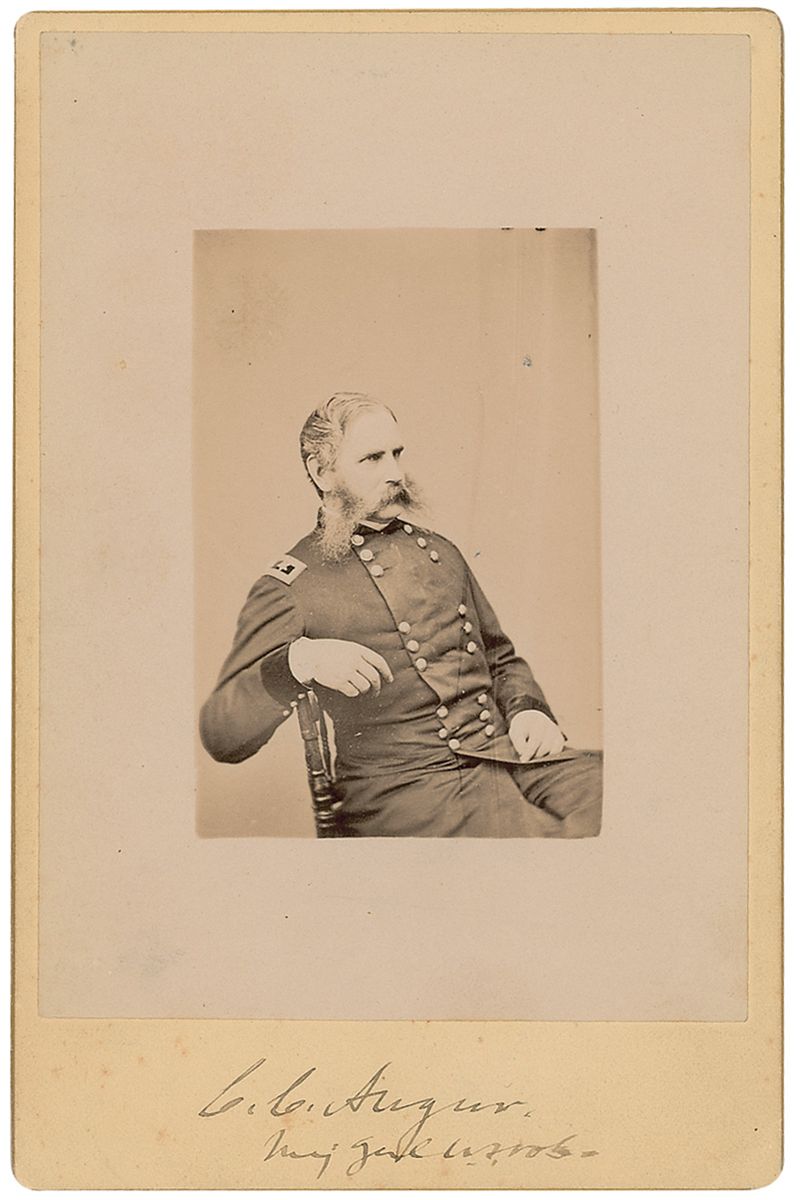 Military officer (1821–1898) most noted for his role in the American Civil War. Original 4.25 x 6.5 cabinet photo, signed in the lower border in black ink, “C. C. Auger, Maj. Genl.” Light spotting to image and some mild toning and soiling to borders, otherwise fine condition.
