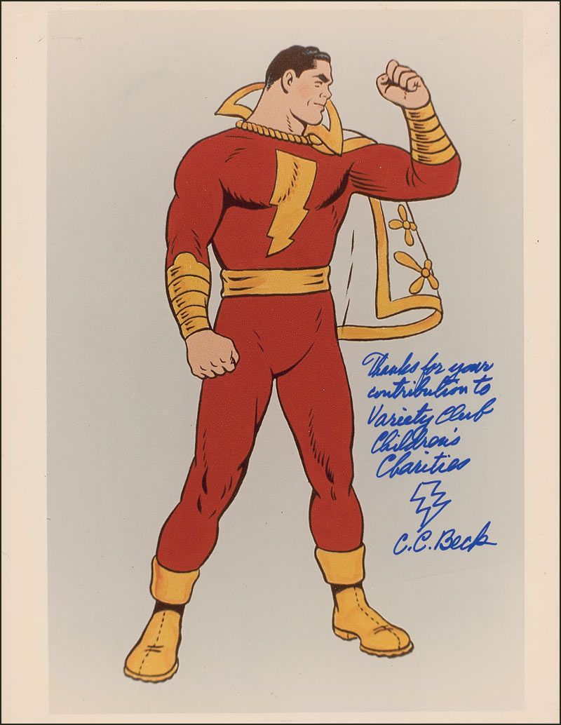 Color satin-finish 11 x 14 full-length photo of Captain Marvel, signed in blue felt tip, “Thanks for your contribution to Variety Club Children’s Charities, C. C. Beck,” adding a lightning bolt. In fine condition, with a couple dings and creases to top edge and some light spotting to upper portion of background.