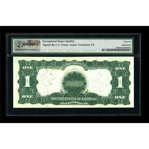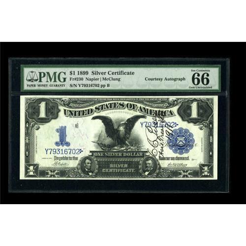 <B>C.C. Pusey Courtesy Autograph Fr. 230 $1 1899 Silver Certificate PMG Gem Uncirculated 66 EPQ.</B></I> The four notes in this auction signed by Pusey have consecutive serial numbers with this example exhibiting bold embossing. This is the second of the four notes of this Friedberg number that he autographed.<BR><BR><b>Shipping:</b> Coins & Currency (<a target="_blank" href="http://www.heritageauctions.com/common/shipping.php">view shipping information</a>)