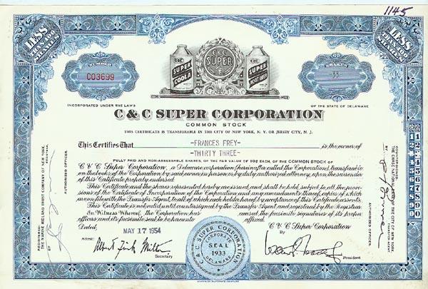 1954, New York. A C & C Super Corporation stock for 100 shares. Vignette of two old soda bottles flanking the company logo. Lightly punch cancelled and very fine.
