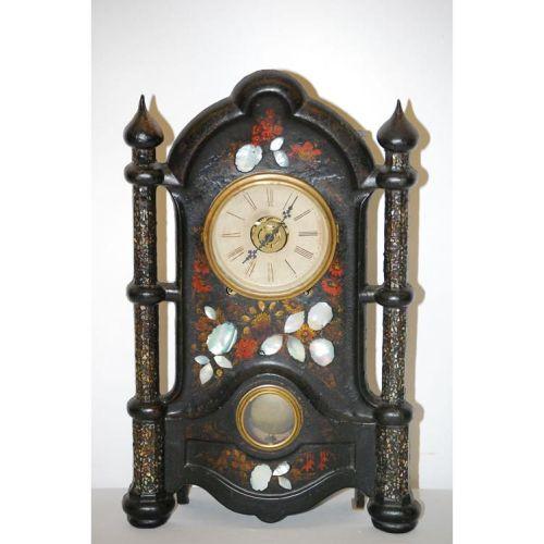 C. CHILLNOCKS IRON FACED VICTORIAN SHELF CLOCK- ARCHITECTURAL DESIGN W/ MINARETS W/ FLORAL PAINTED DECORATIONS & MOTHER OF PEARL INLAY (20" T X 13" W) - WEAR, SMALL LOSSES, REPAIRS, IMPERFECTIONS